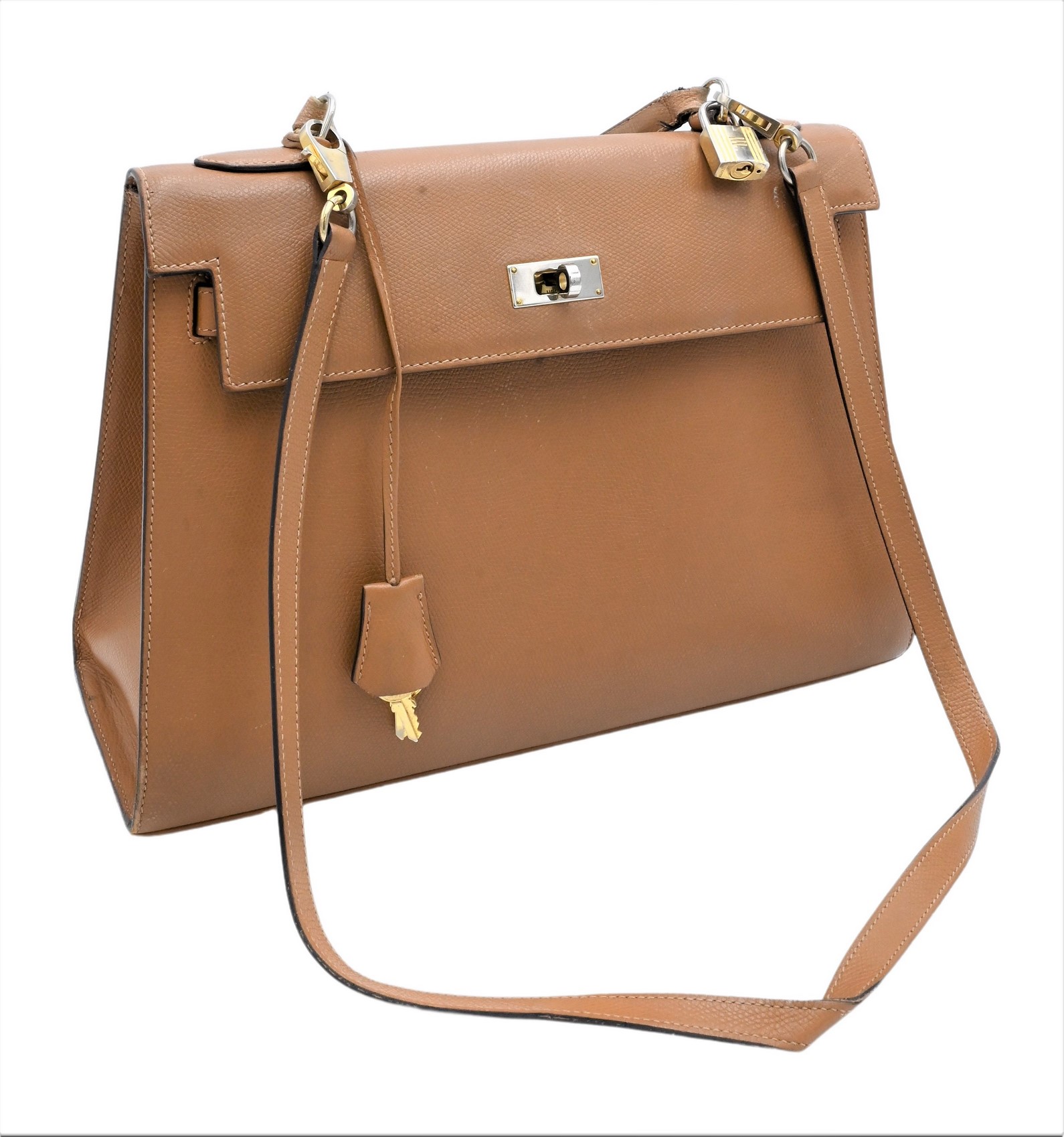 Vintage Handbag, Hermes Kelly style, tan leather, single handle with fold over leather flap, interior with three pockets, zippered/one broken, key in sheath, shoulder strap, hardware and clasps, marked Hermes, Paris and a square mark, 12 1/2″ x 4 1/2″, height 9 inches including straps.