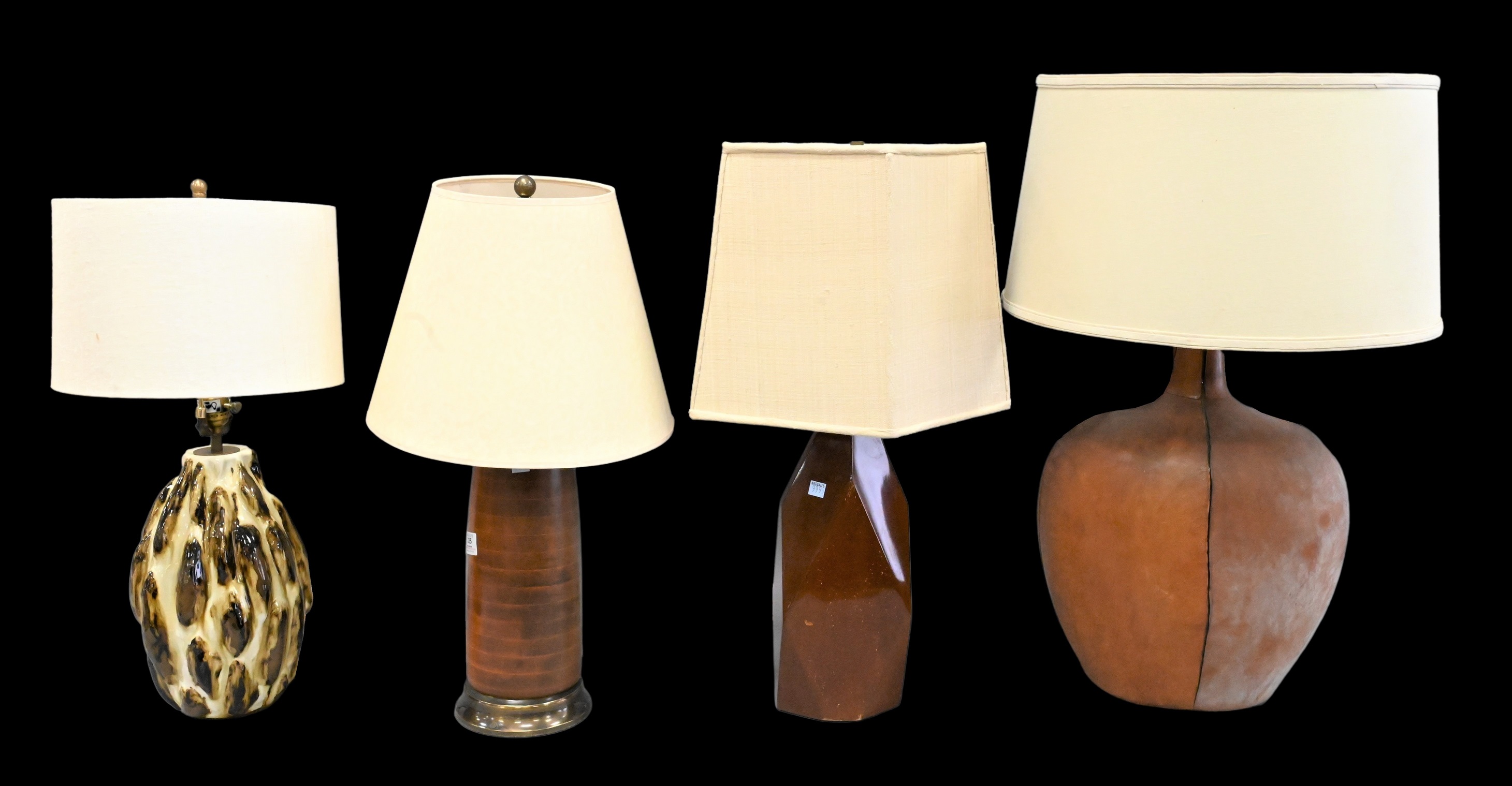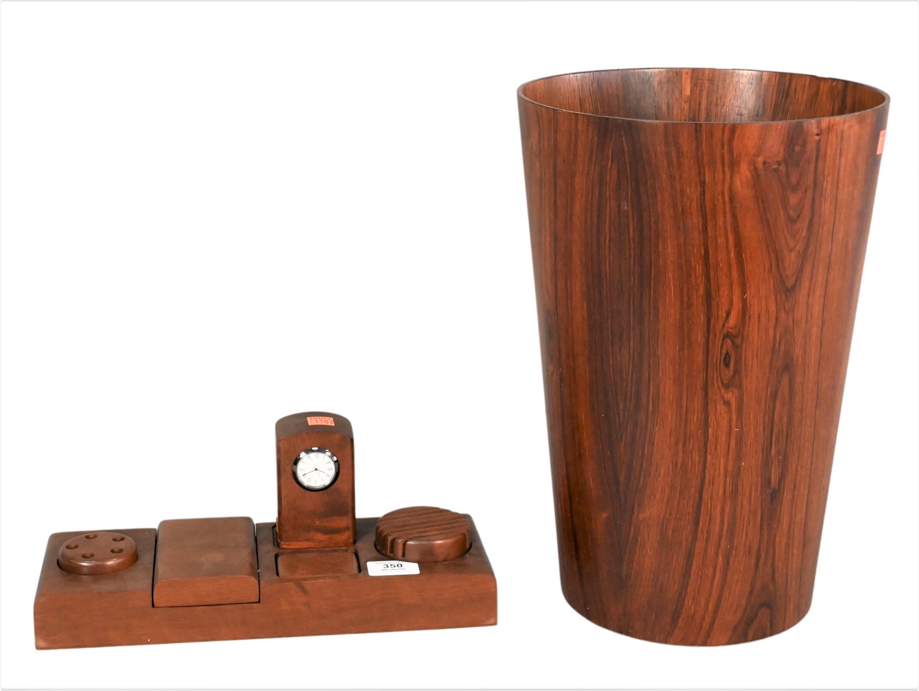 Two Piece Lot, to include a Michel Elkan Studios desk set, signed on base, length 13 1/2 inches; along with a Scandinavian teak waste basket by Rainbow Wood Products, height 15 3/4 inches.
