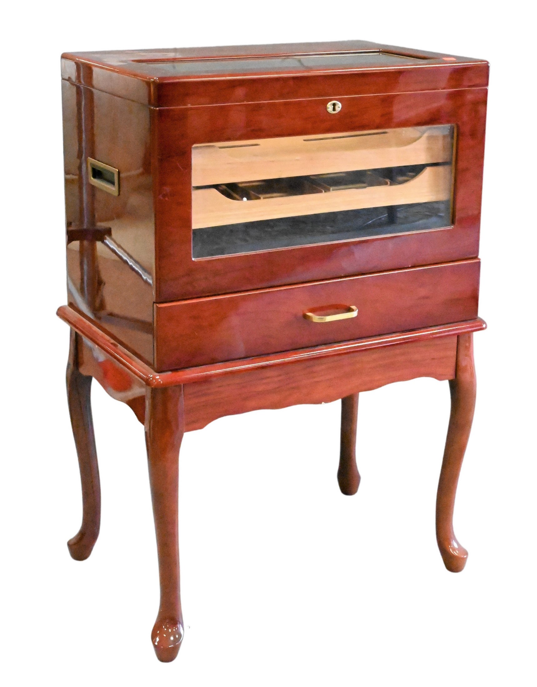 Humidor on Stand, having lift top, two interior trays, one drawer on stand, height 34 inches, top 14 1/4″ x 22″; along with a Prometheus lift top humidor.