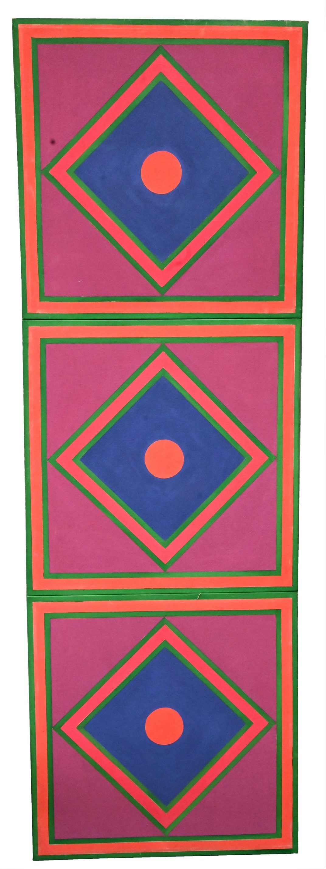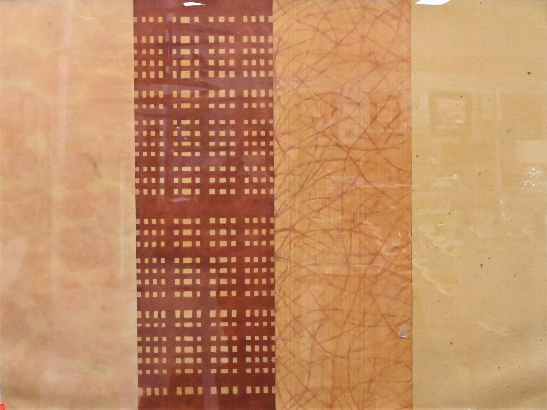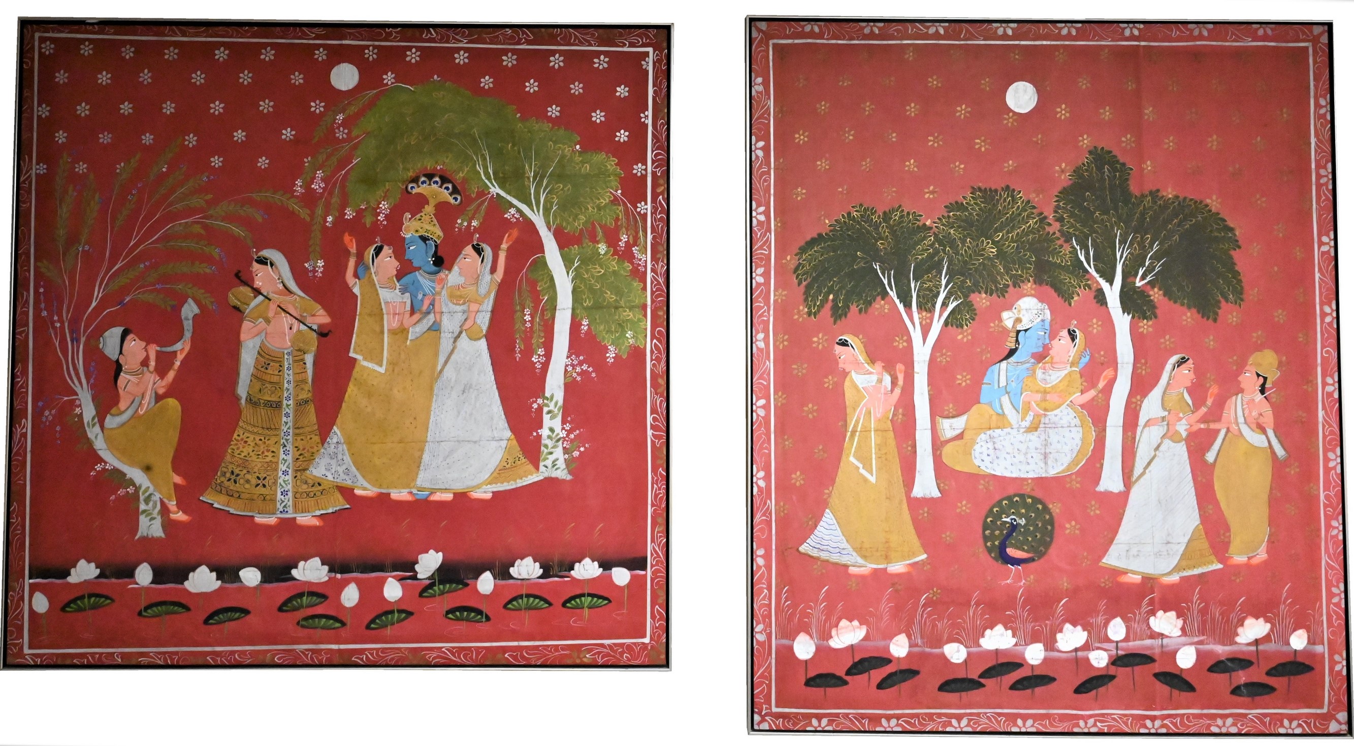Two Indian Scenes, acrylic on canvas, artist unknown, having red base with figures and trees, canvas put together in pieces, faded with abrasions throughout, overall fair condition, 70″ x 58″. Provenance: Property from a private New York collection sold to benefit charitable foundations.