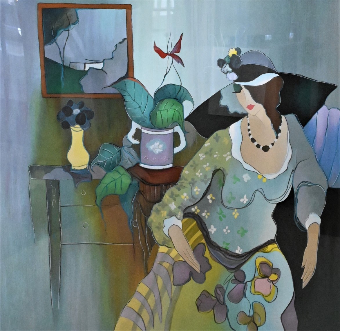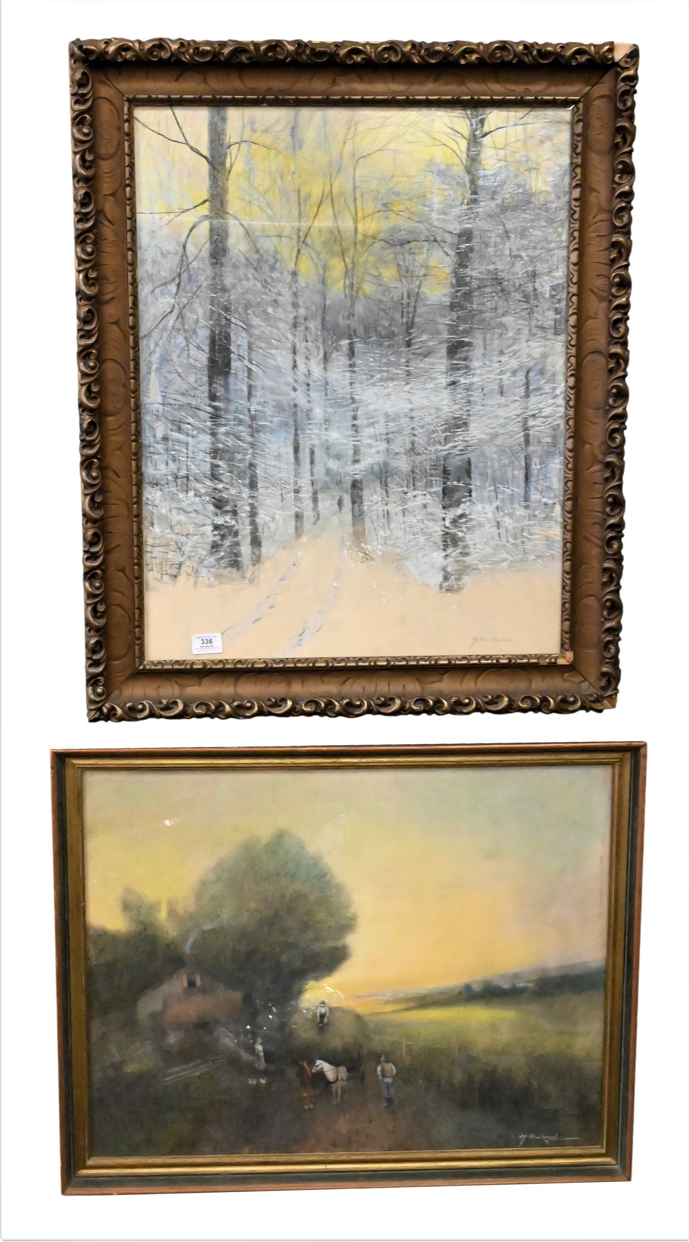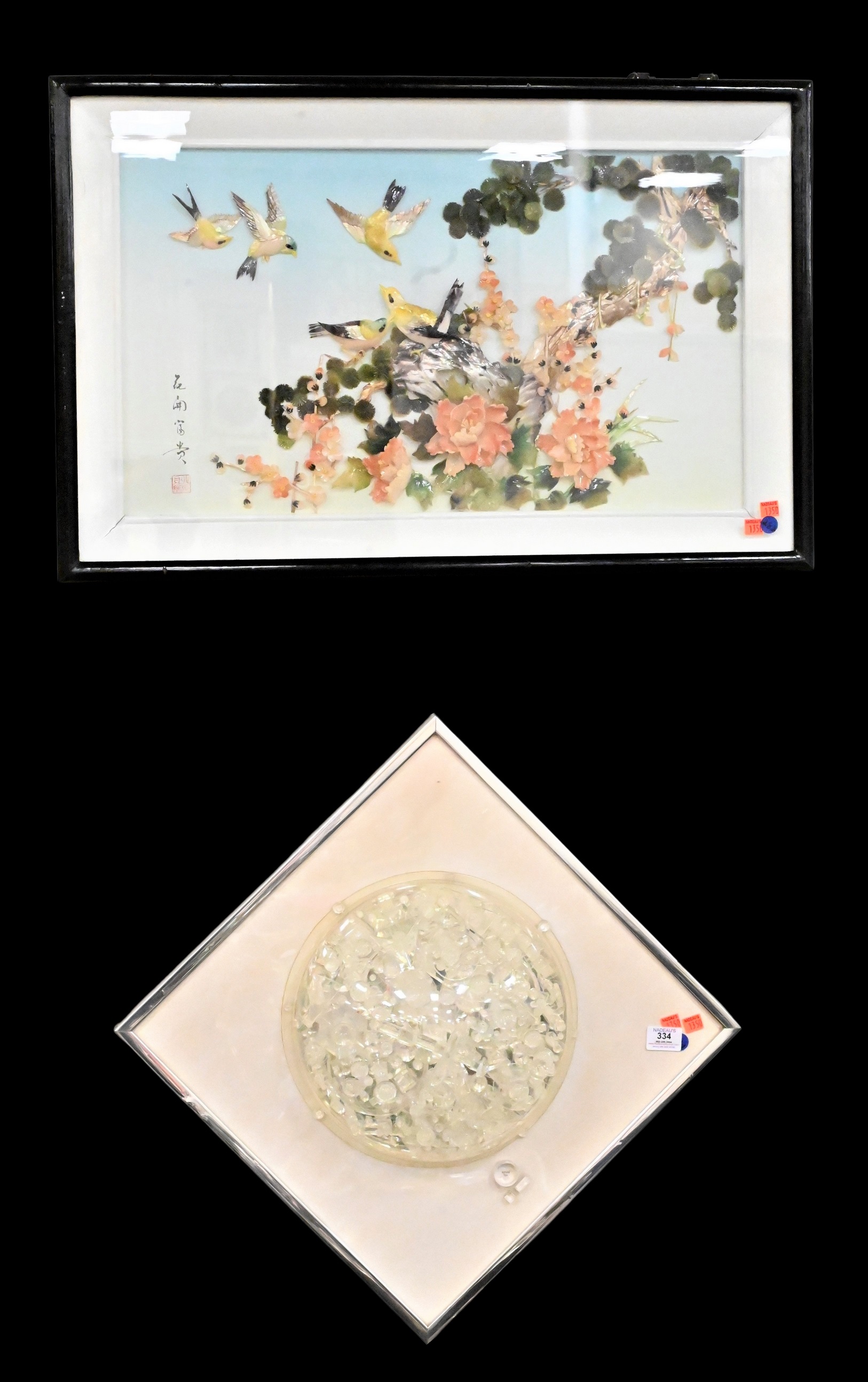 Two Piece Framed Group, to include Lorraine Enid, lucite, untitled, signed and dated lower right ‘Enid 70’, 24″ x 24″, loose parts; along with a Chinese scroll, glass shell composition, Glass Landscape with Birds and Flowers, signed and stamped lower left, 14″ x 26″, overall good condition. Provenance: Property from a private New York collection sold to benefit charitable foundations.