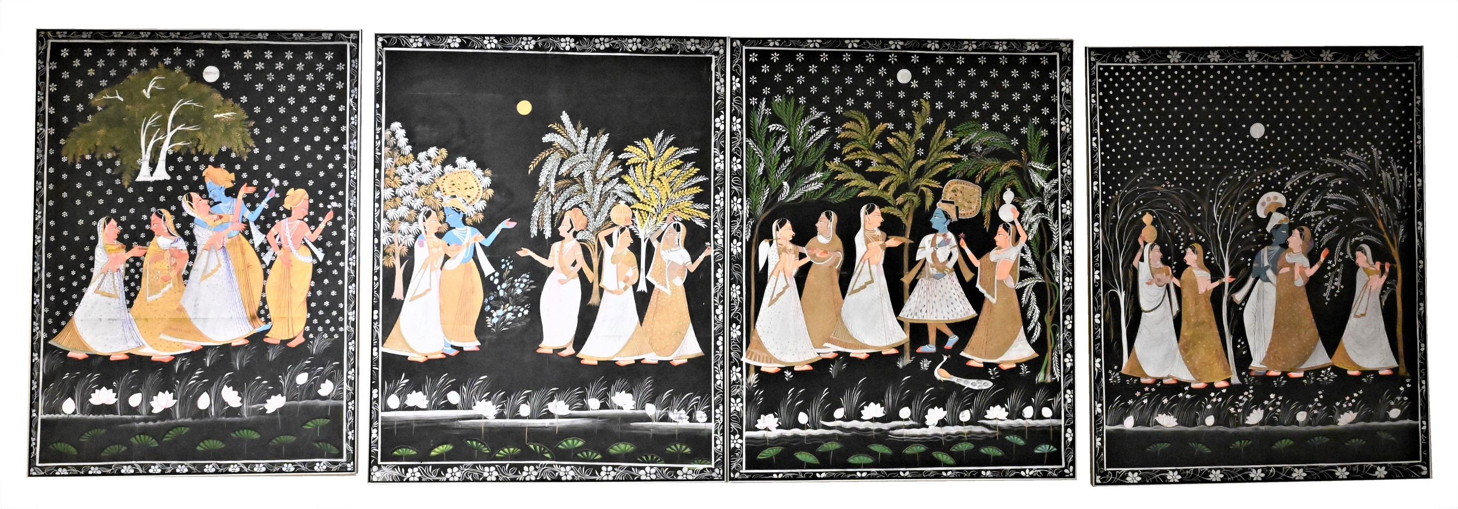 Set of Four Indian Scenes, acrylic on canvas, unknown artist, having black ground with figures and trees, canvas put together in pieces, three are 75″ x 54″, one is 70″ x 50″. Provenance: Property from a private New York collection sold to benefit charitable foundations.