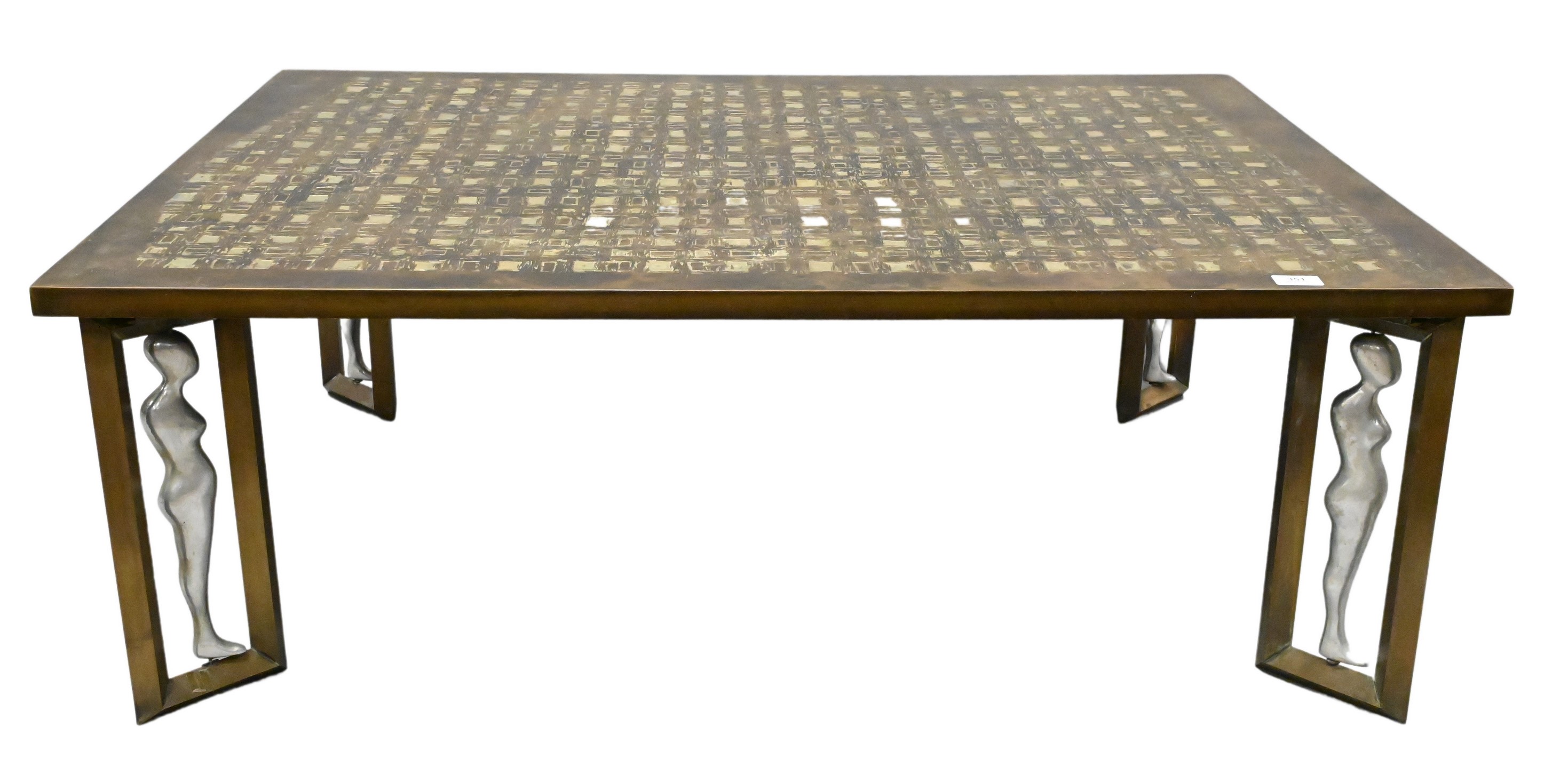 Philip (1908 – 1988) and Kelvin (b. 1936) Laverne “Les Femmes” Coffee Cocktail Table, patinated bronze and pewter, having nude female figural legs, signed Philip and Kelvin Laverne, height 16 1/2 inches, top 35″ x 47″.
