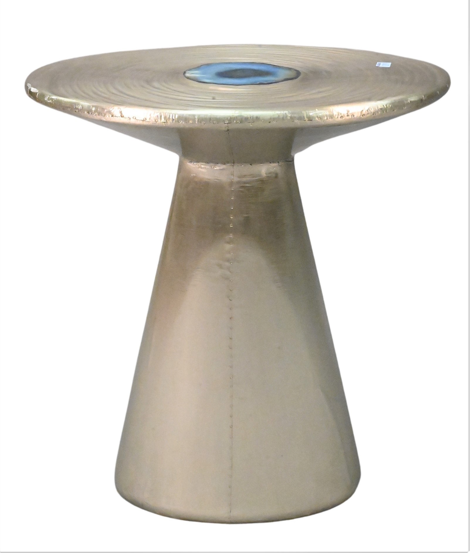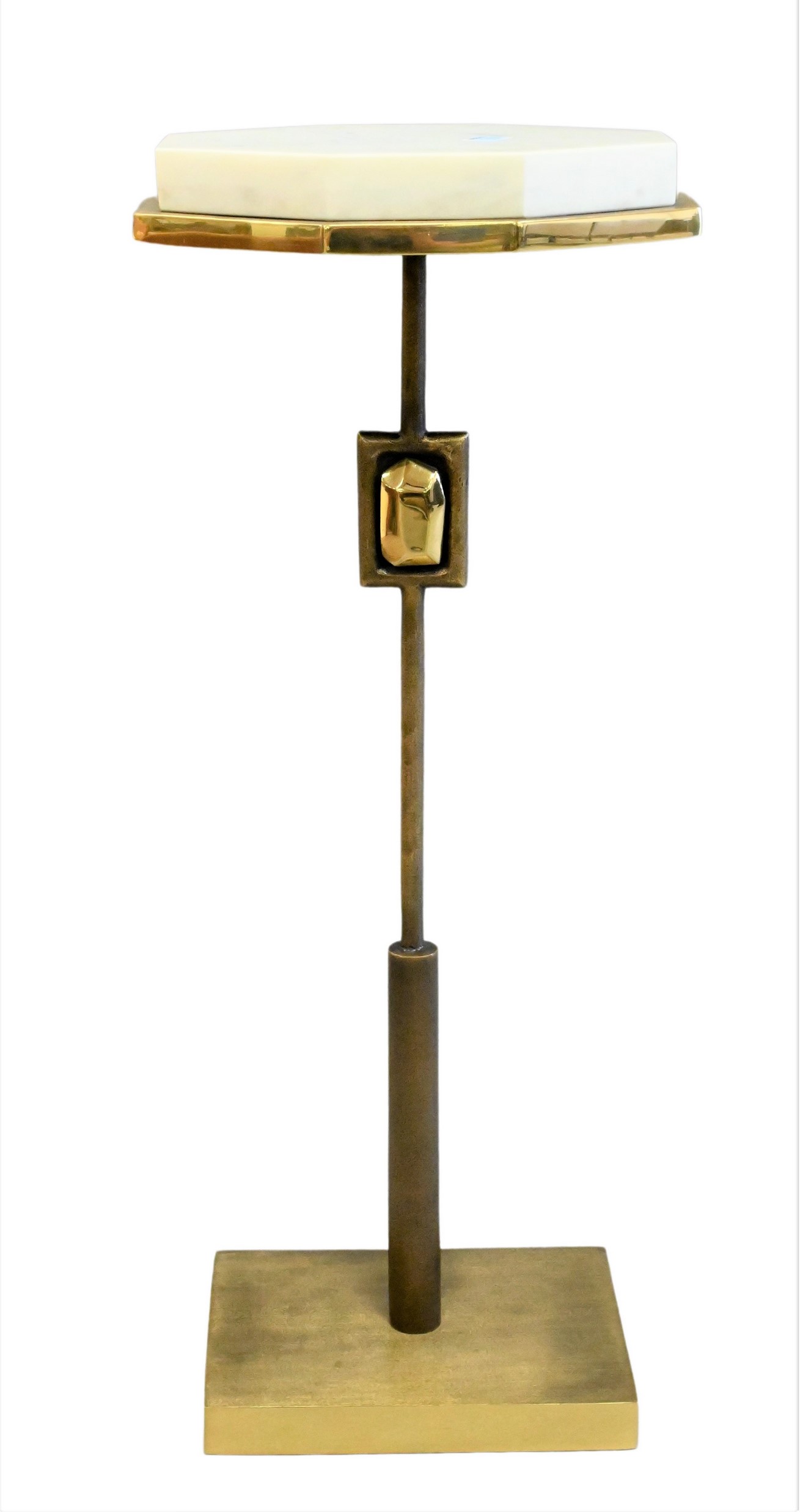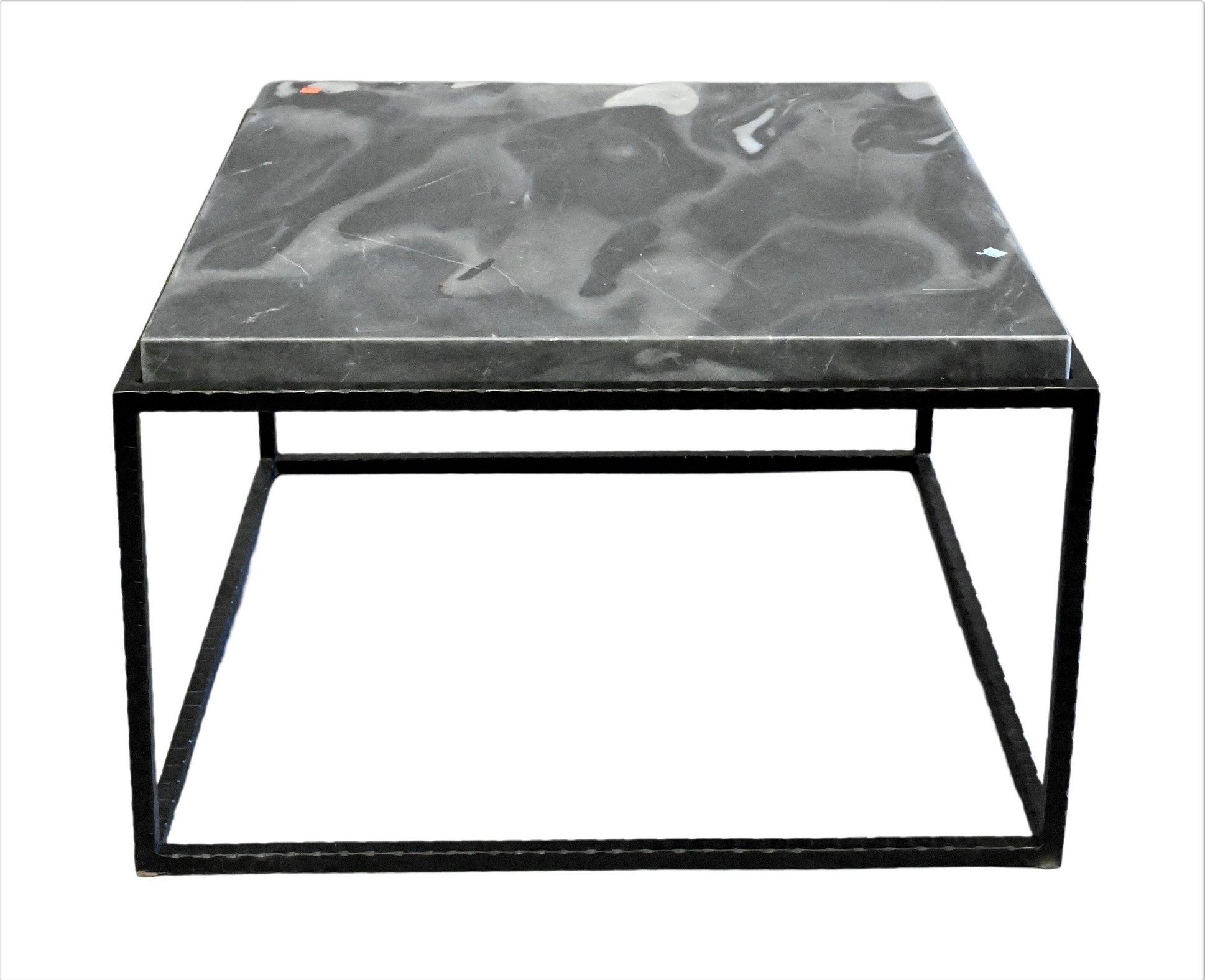 Square Coffee/Cocktail Table, having grey marble top on hammered iron base, possibly Global Views or Arteriors, height 19 1/2 inches, top 30 1/4″ x 30 1/4″.