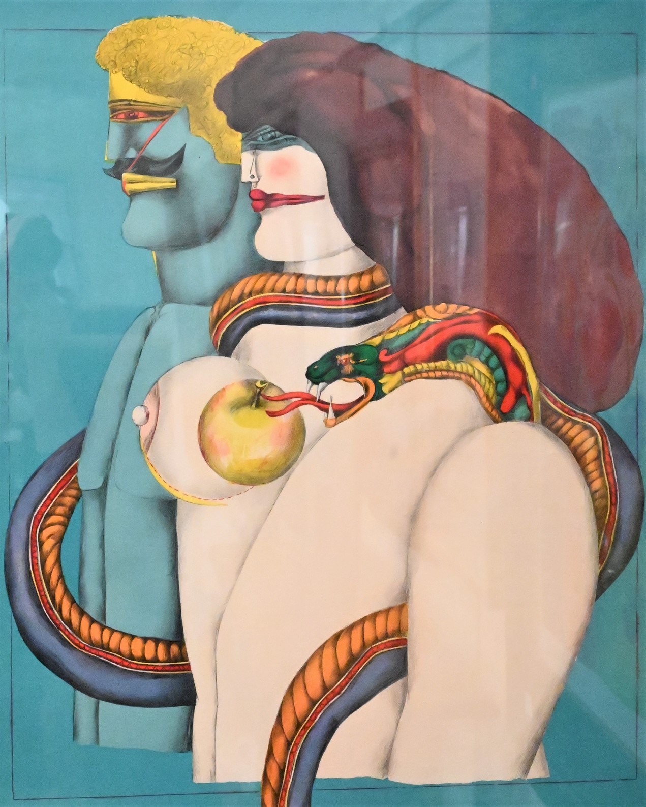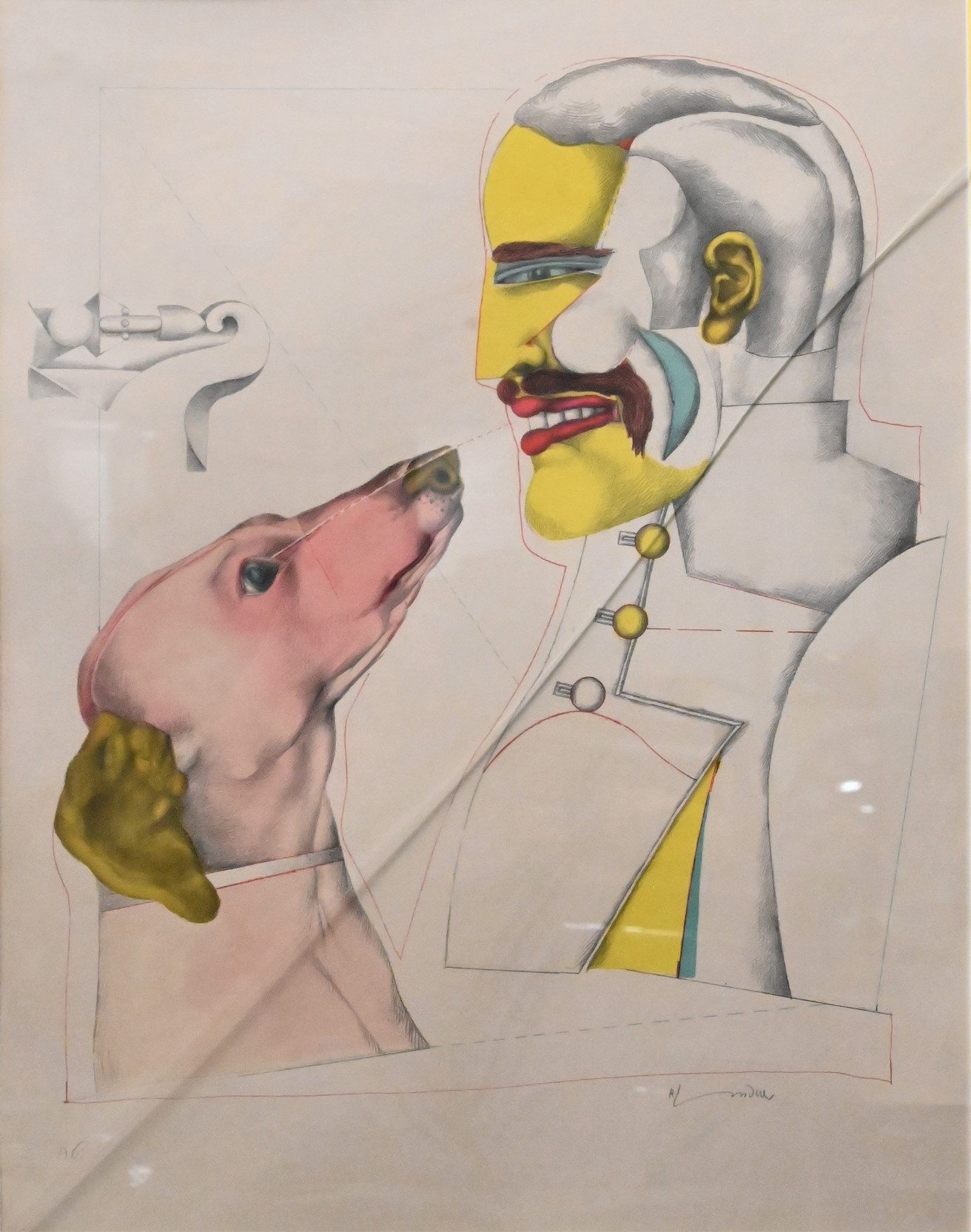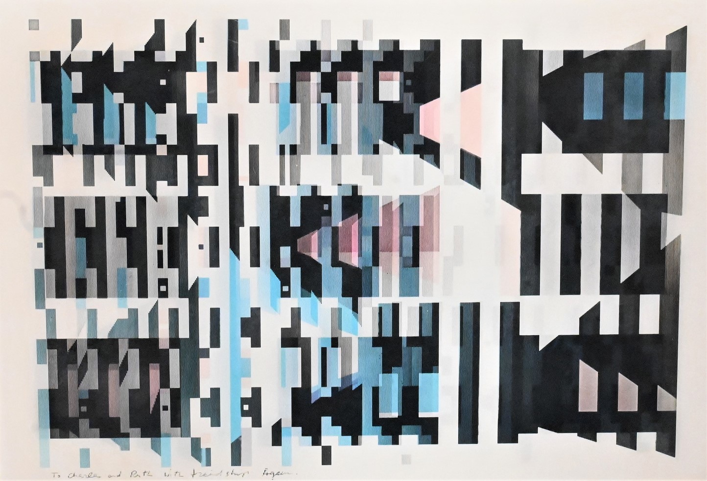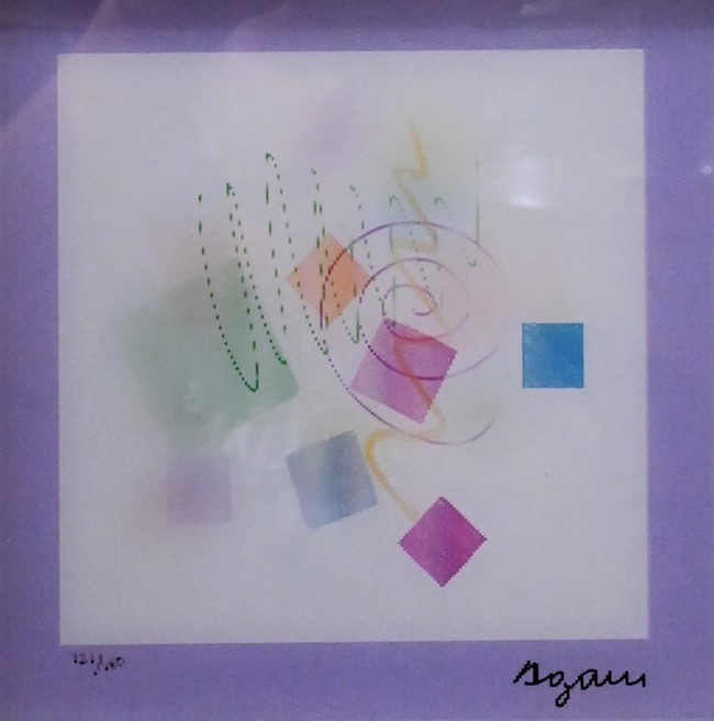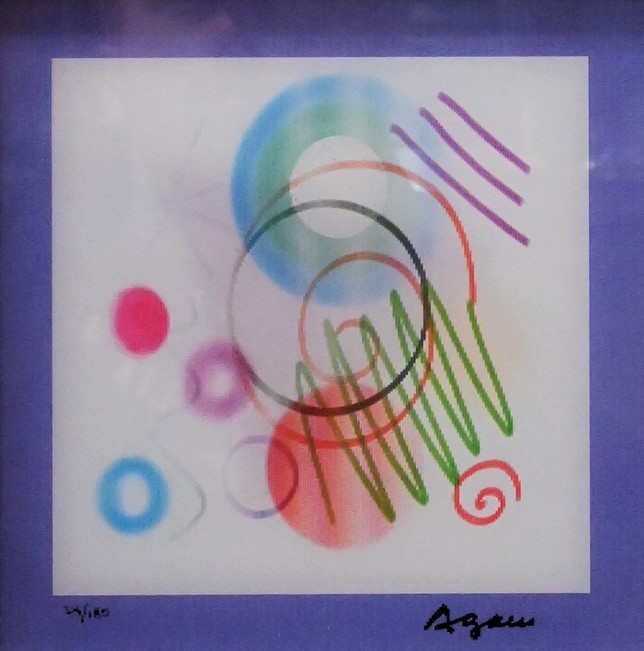 Yaacov Agam (Israeli, b. 1928), untitled (lenticular abstraction), signed and inscribed recto, lower margin: “To Charles and Ruth with Friendship. Agam”, 11″ x 16″, framed 17″ x 21 1/2″.