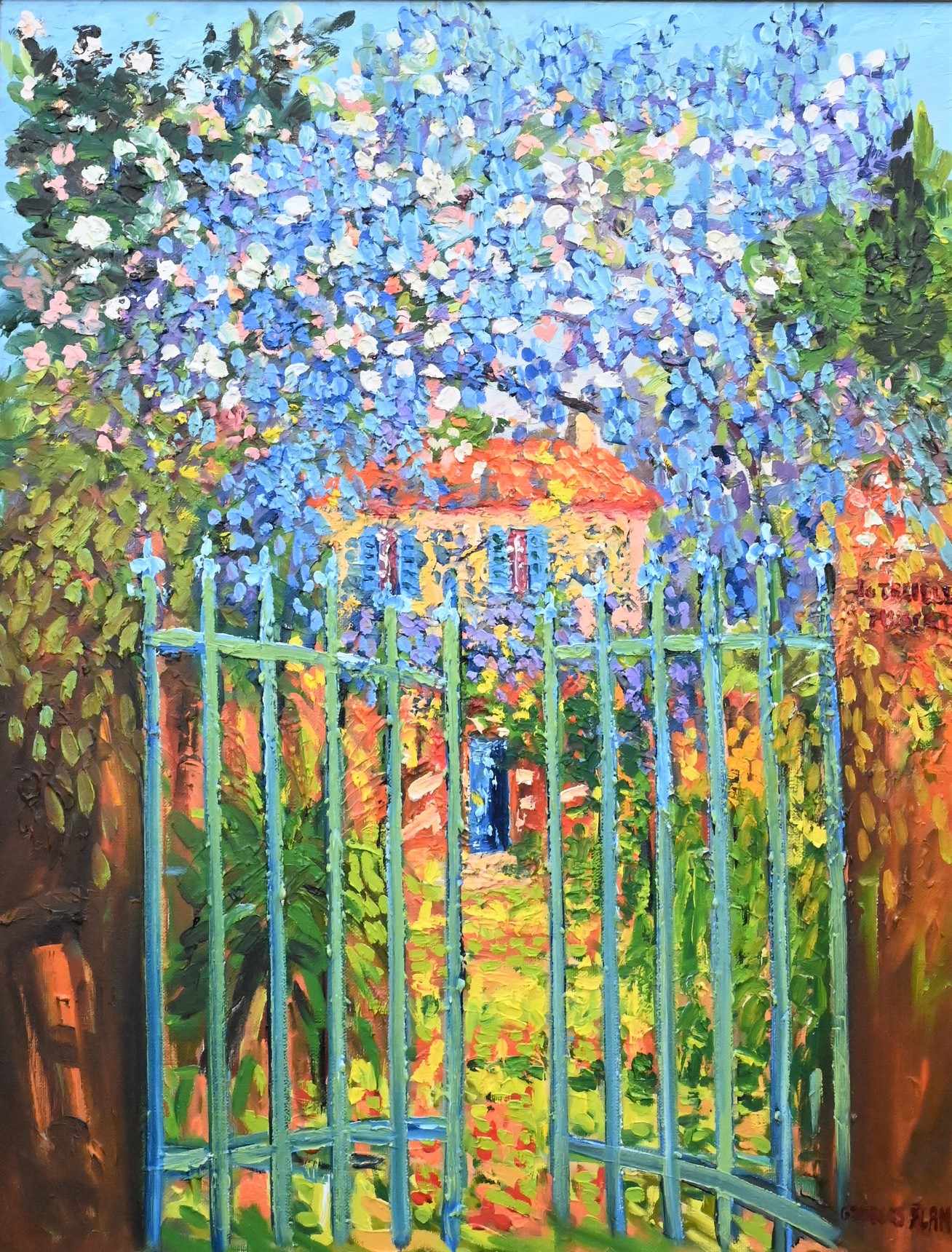 Georges Flanet (b. 1937), oil on canvas, A House in a Garden, La Treille Muscate Colette, St. Tropez, 1997, signed, titled and dated on back, 36″ x 29″, original Delf Cadres d’Art label on back, along with copy of original receipt from artist gallery for $18,000 in 1998. Provenance: Property from a private New York collection sold to benefit charitable foundations.
