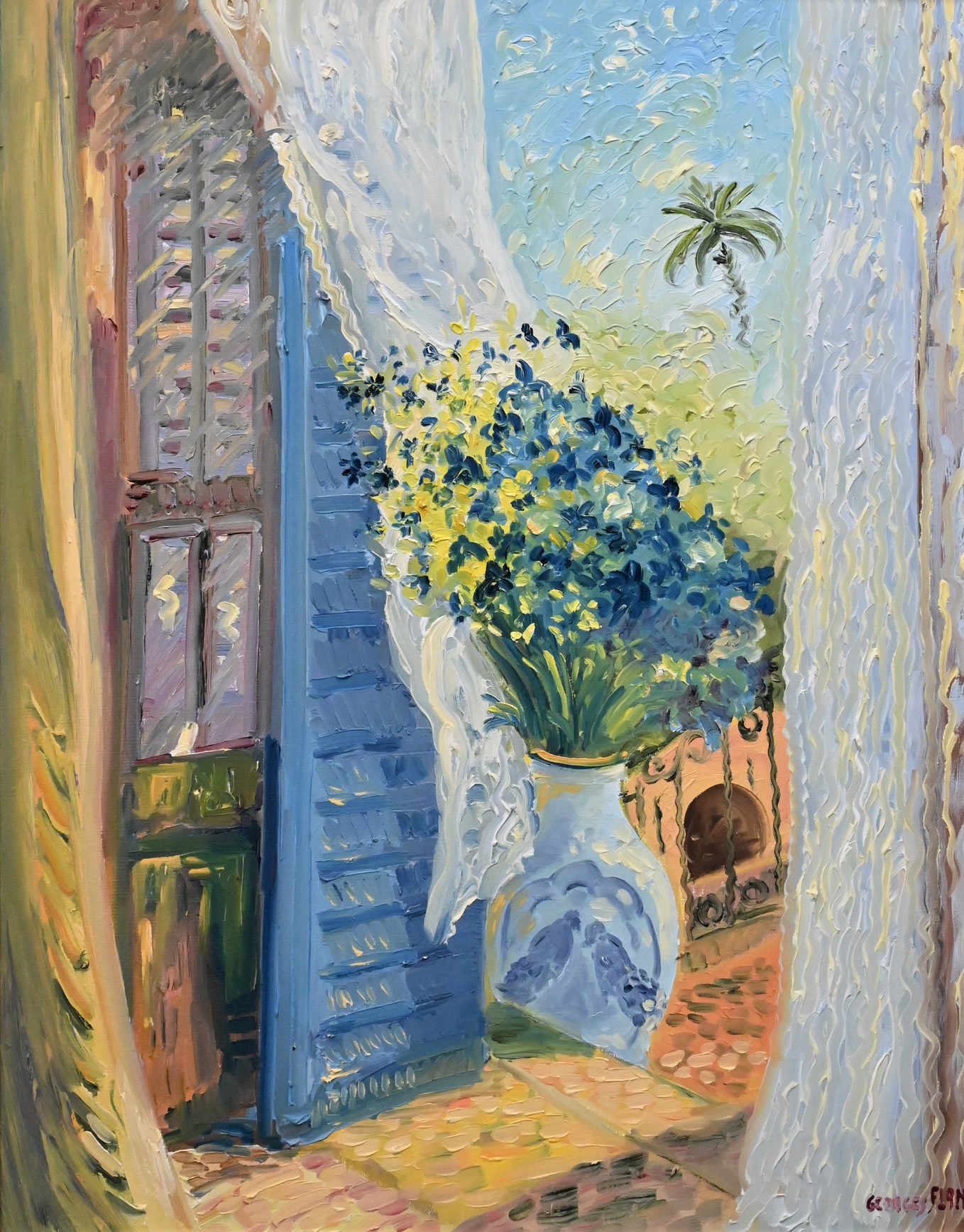 Georges Flanet (b. 1937), oil on canvas, Still Life of Flowers in a Window, Courant Dair Surlie Bouque Diris, signed ‘George Flanet’ lower right, signed and titled on back, 36″ x 29″, original Delf Cadres d’Art label on back, along with copy of original receipt from artist gallery for $18,000 in 1998. Provenance: Property from a private New York collection sold to benefit charitable foundations.