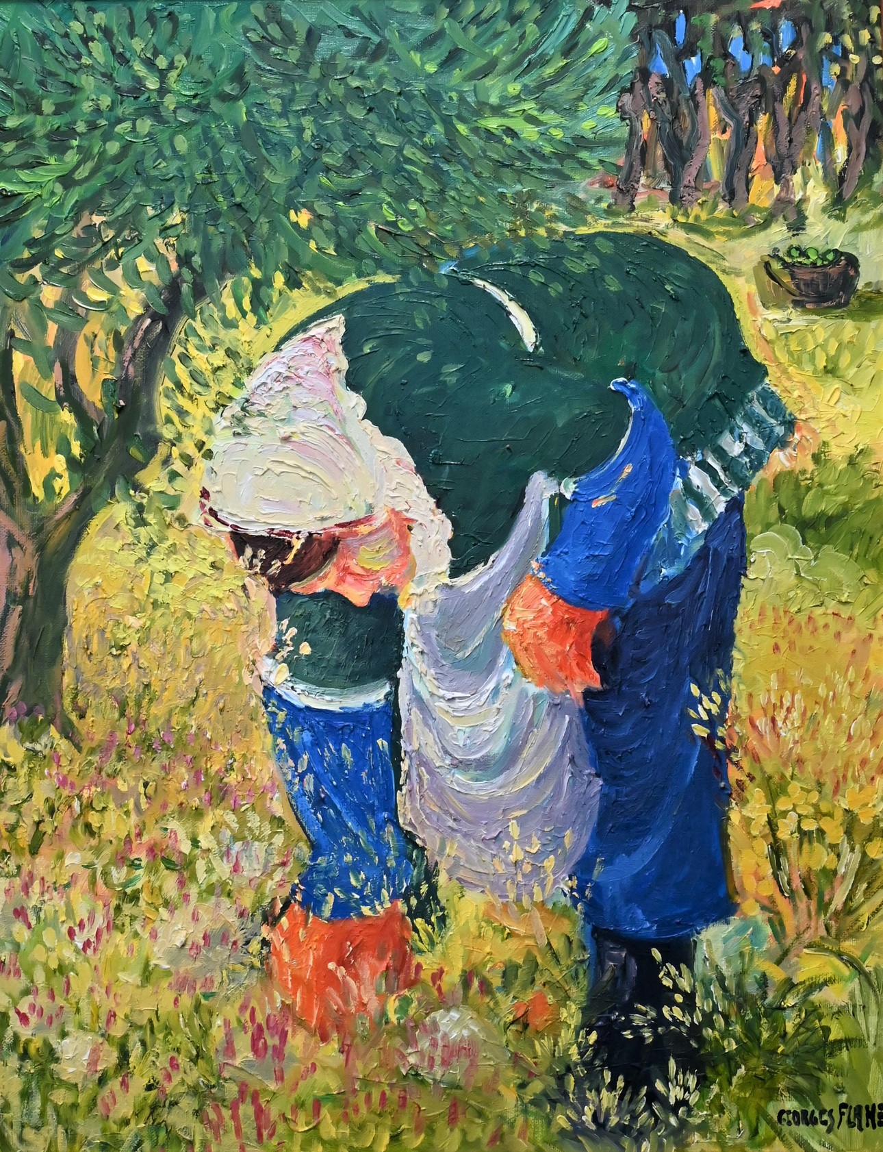 Georges Flanet (b. 1937), oil on canvas, A Woman in a Garden, 1997, Laramasseuse Dolives A Rustrel, titled, signed ‘Georges Flanet’ and dated on back, 36″ x 29″, overall good condition, original Delf Cadres d’Art label on back, along with copy of original receipt from artist gallery for $18,000 in 1998. Provenance: Property from a private New York collection sold to benefit charitable foundations.