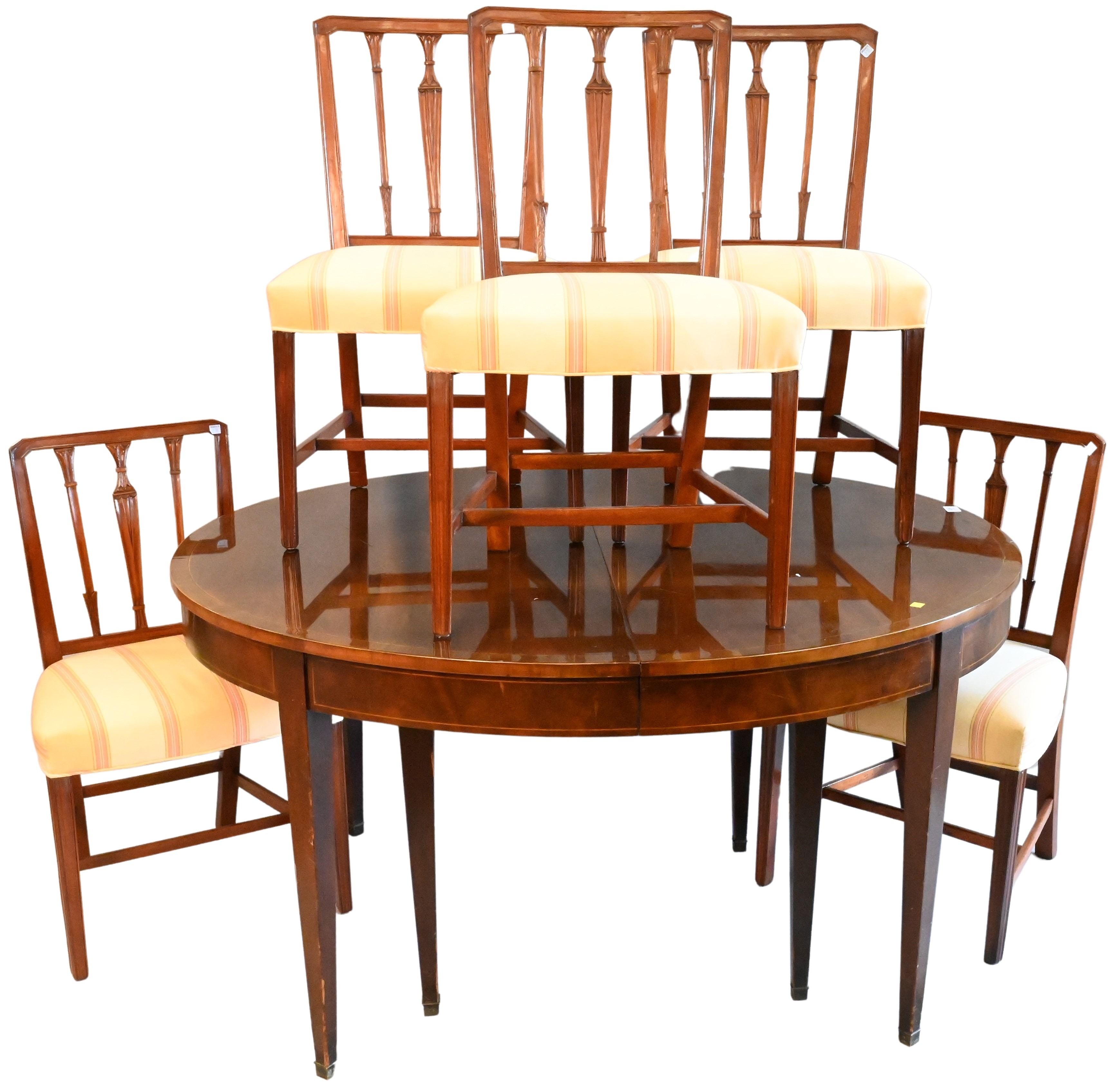 Set of 10 Shield Back Dining Chairs, to include 2 arm chairs and 8 side chairs having upholstered back and seats with leather on backs, arm chair height 39 inches, width 23 inches.