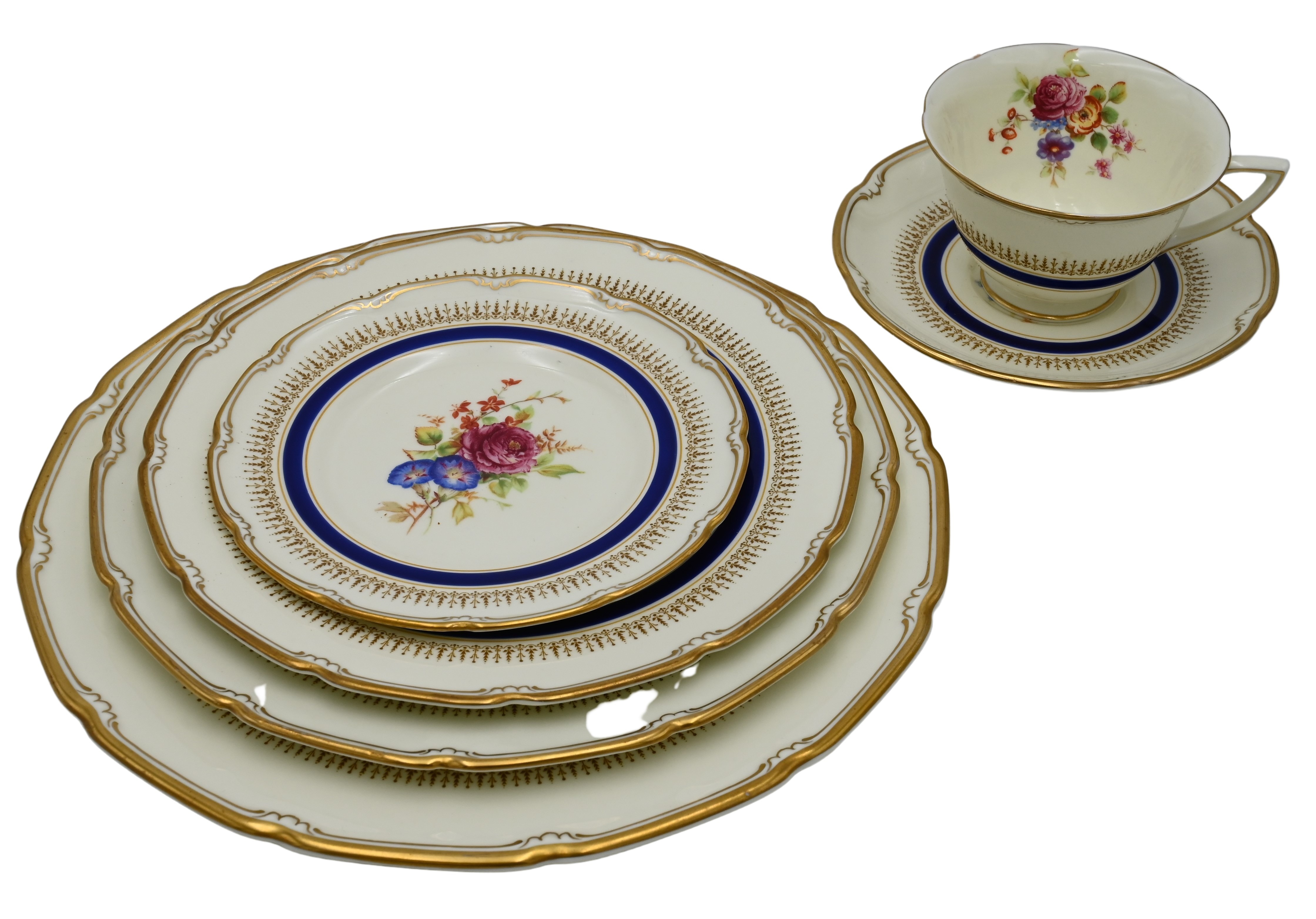 Four Box Lots of China to Include, 17 Wm Guerin and Co Limoges France Porcelain Plates, having flower shape and gilt rim, marked on verso “Delmonico’s New York, manufactured for James M. Shaw and Co. New York City-Wm Guerin and Co. limoges”, as well as 12 Wedgewood plates “Exteer”, porcelain dinnerware to include Royal Chelsea “Midas” dinner plates, Ainsley “Elizabeth” teapot and serving trays, Heinrich and Co. “Edgerton” dinner plates.