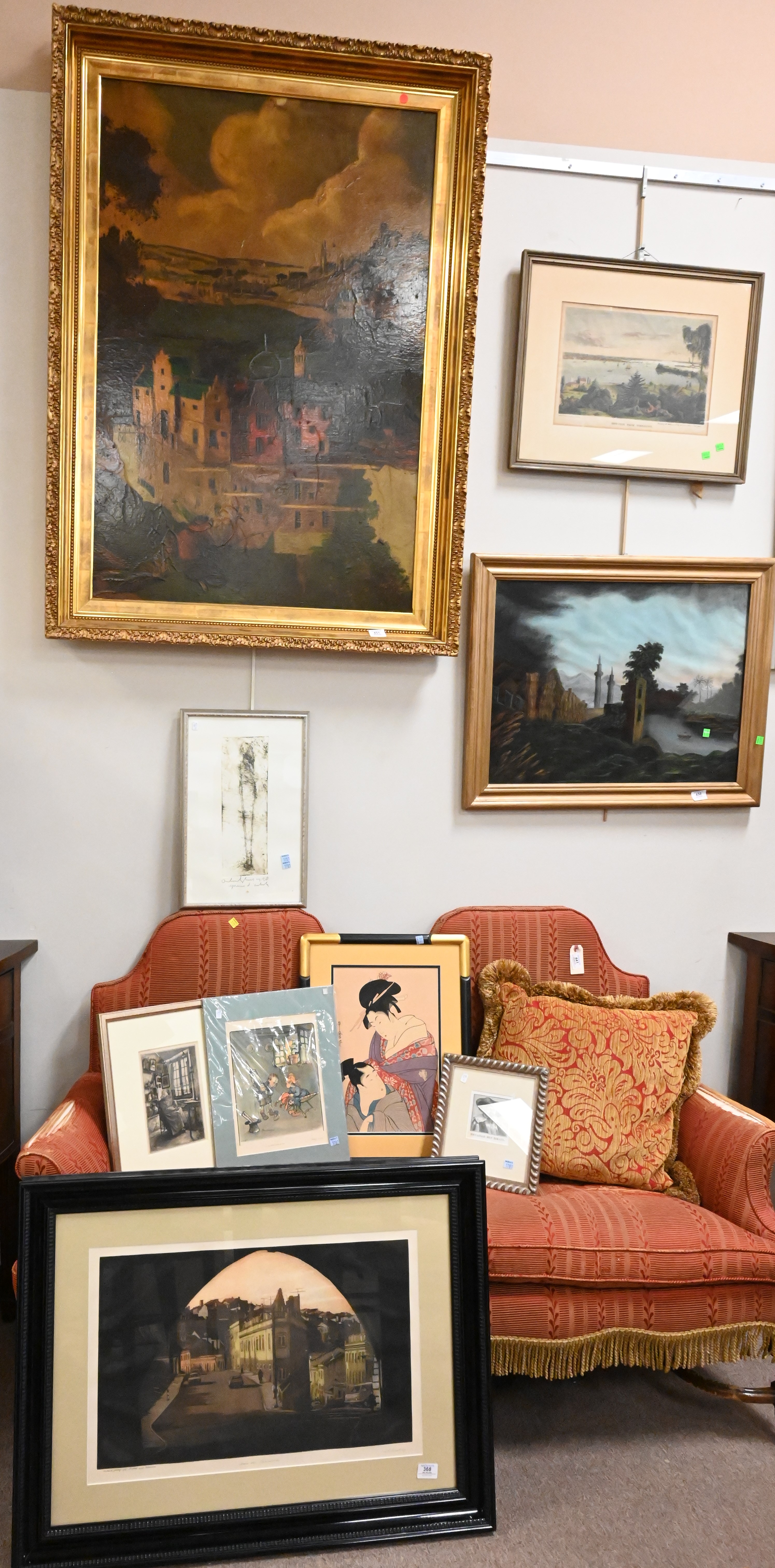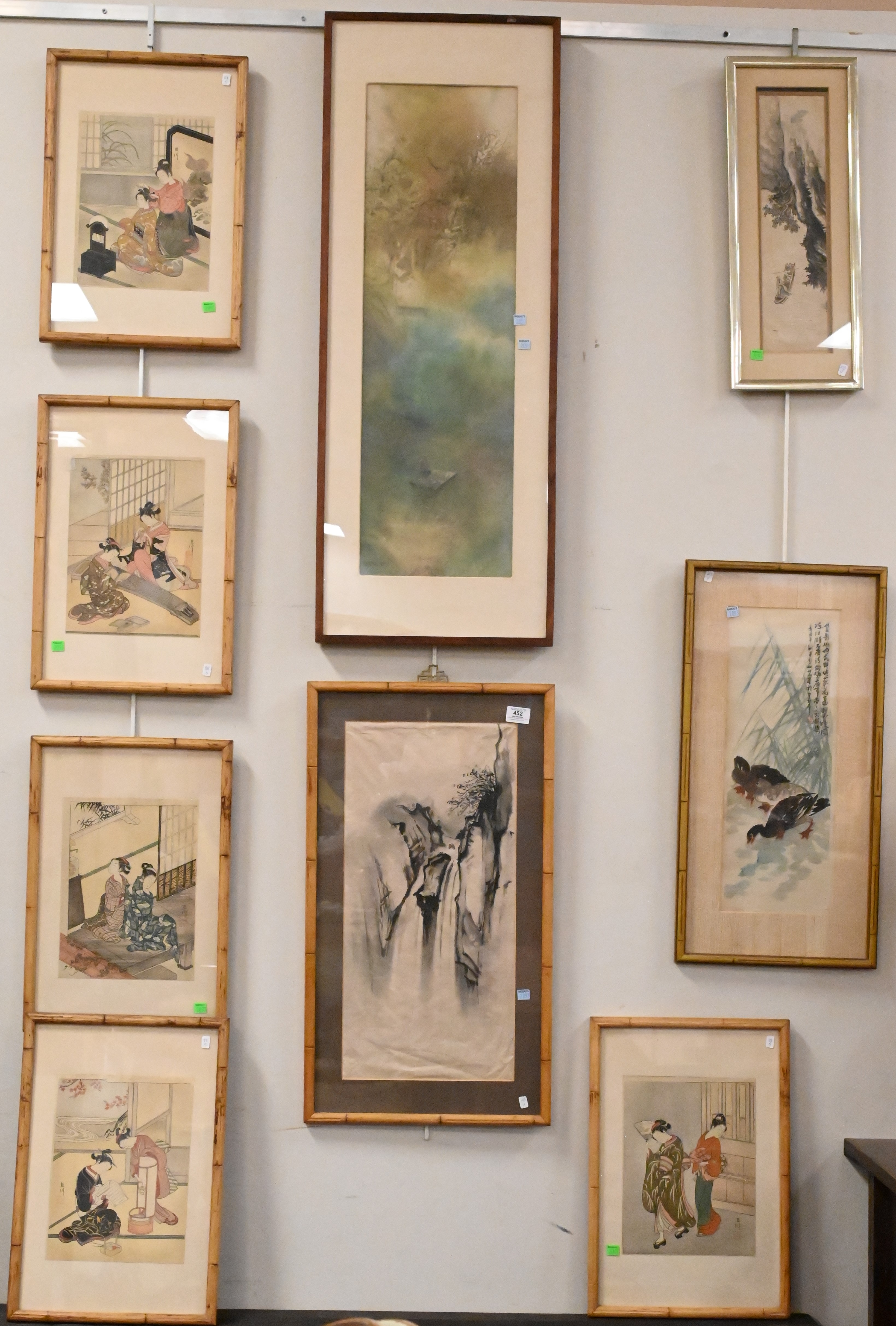 to include four piece group of framed Asian scroll watercolor landscapes Frederick Wong (Asian American b. 1929)