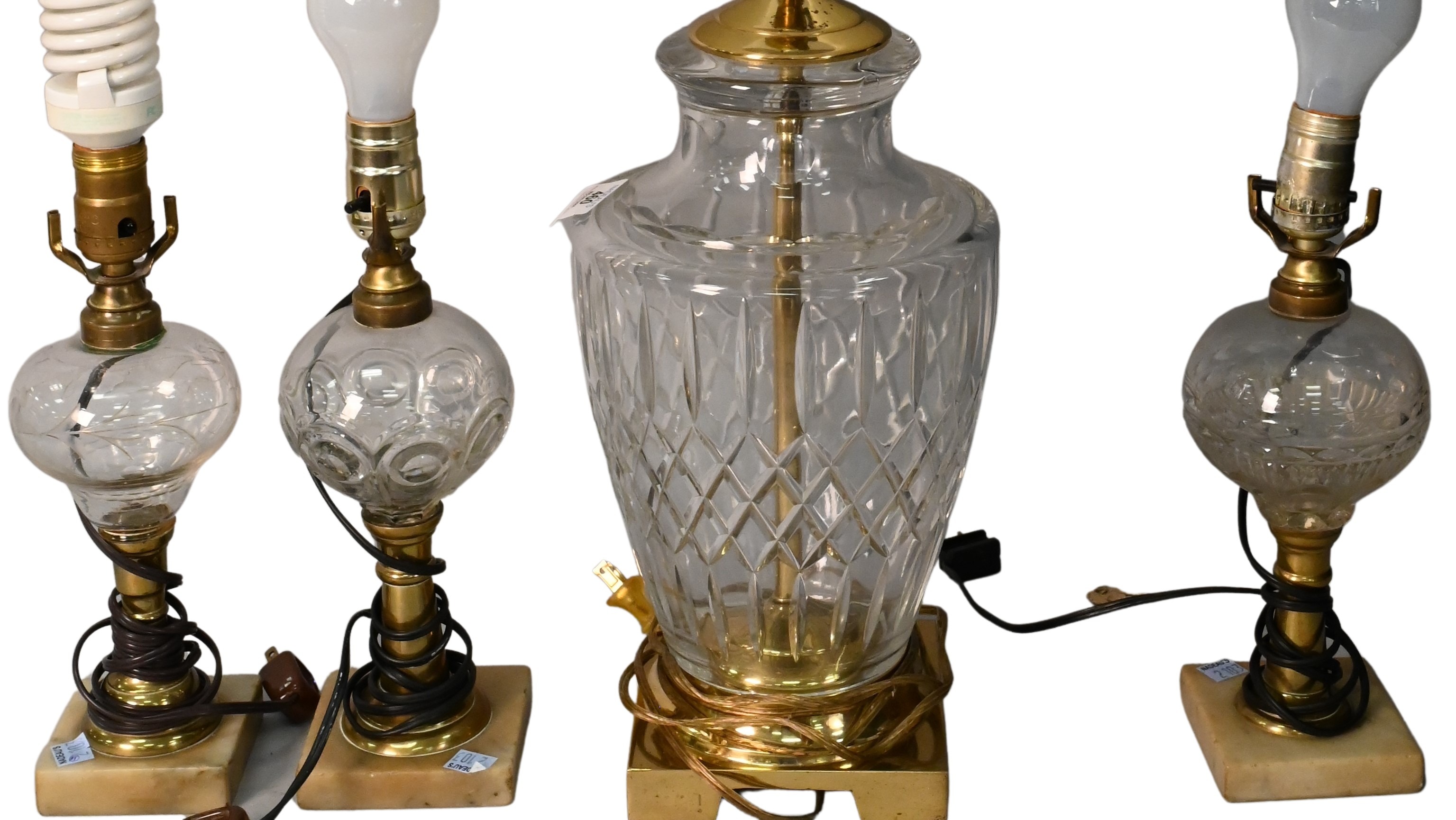 Four Glass and Bronze Lamps, to include three converted oil lamps, height of 16 inches, along with one large lamp having a teardrop glass finial, height 27 inches.