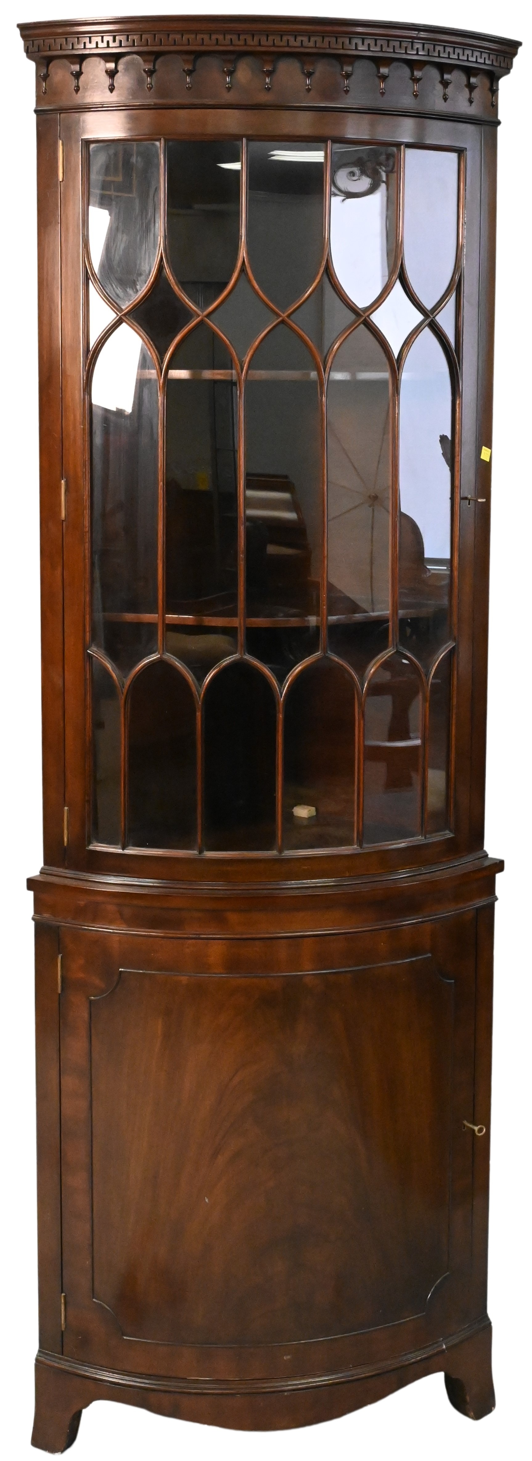 Mahogany Corner Cabinet, top having a large glass door opening to interior shelving, over a base having one door, height 75 inches, approximate width 28 inches, depth 18 inches.