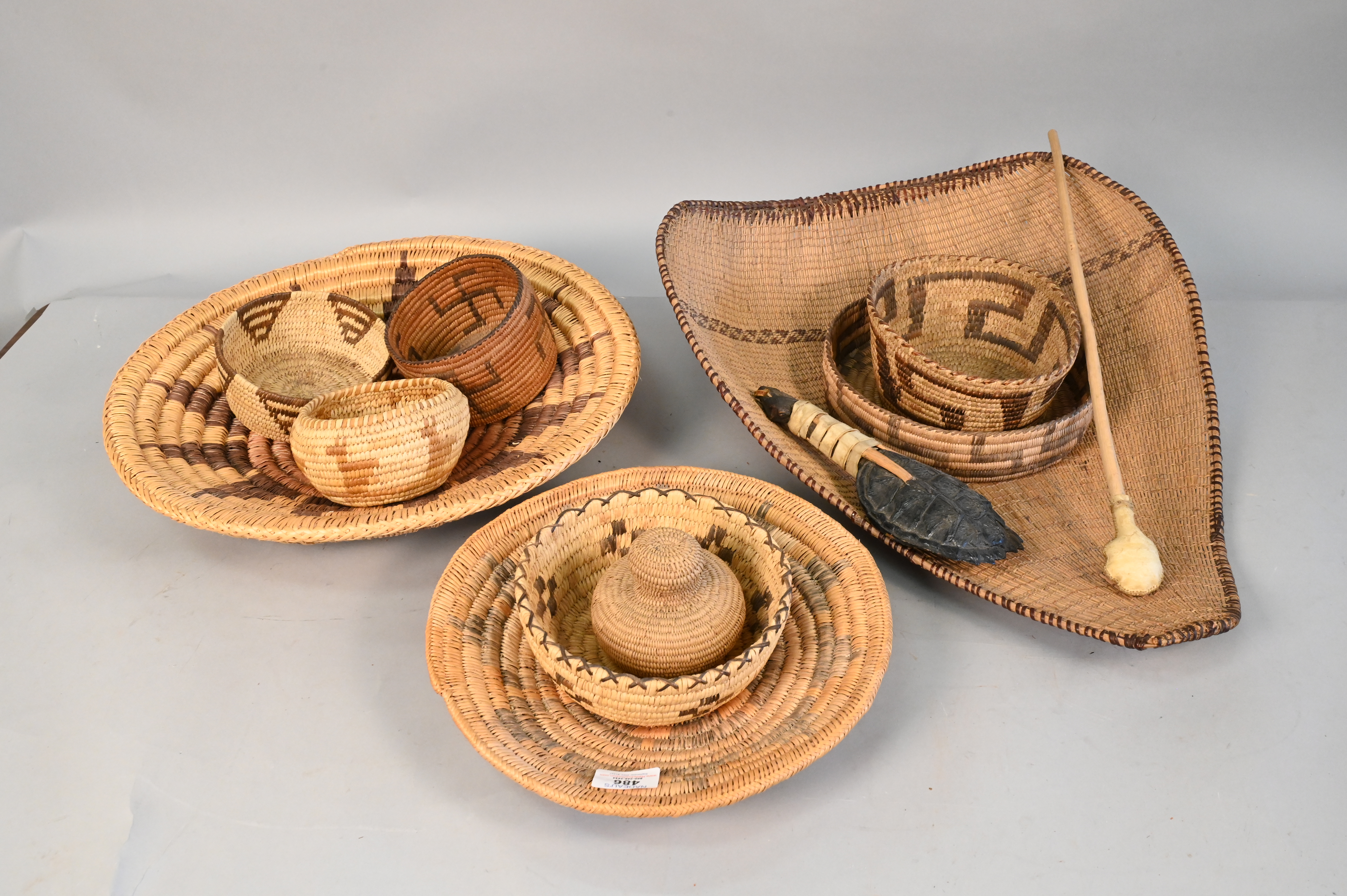 12 Piece Group of Baskets, to include 5 southwest Native American coiled baskets, 3 small geometric signed baskets, 1 small lidded basket, 1 large winnowing basket, length 23 inches, 5 southwest coiled baskets of geometric design, 1 turtle shell rattle, along with a leather wrapped shaman drum stick, largest basket diameter 17 inches.