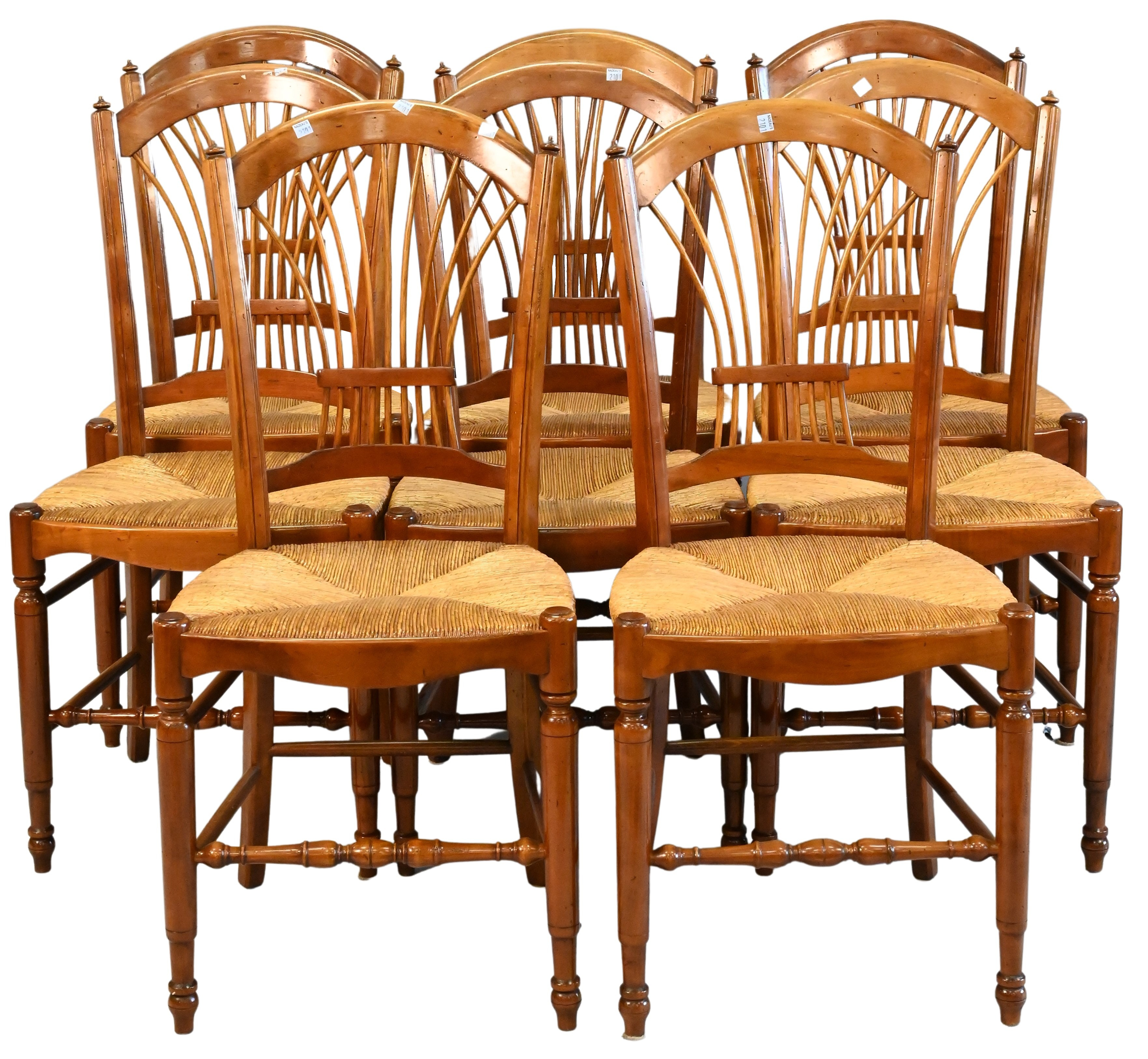 Set of Eight Spindle Back Dining Chairs with Rush Seats, provenance Howard Kaplan Antiques sold on 5/23/2000 for $9,200, height 37 inches, width 17 inches.