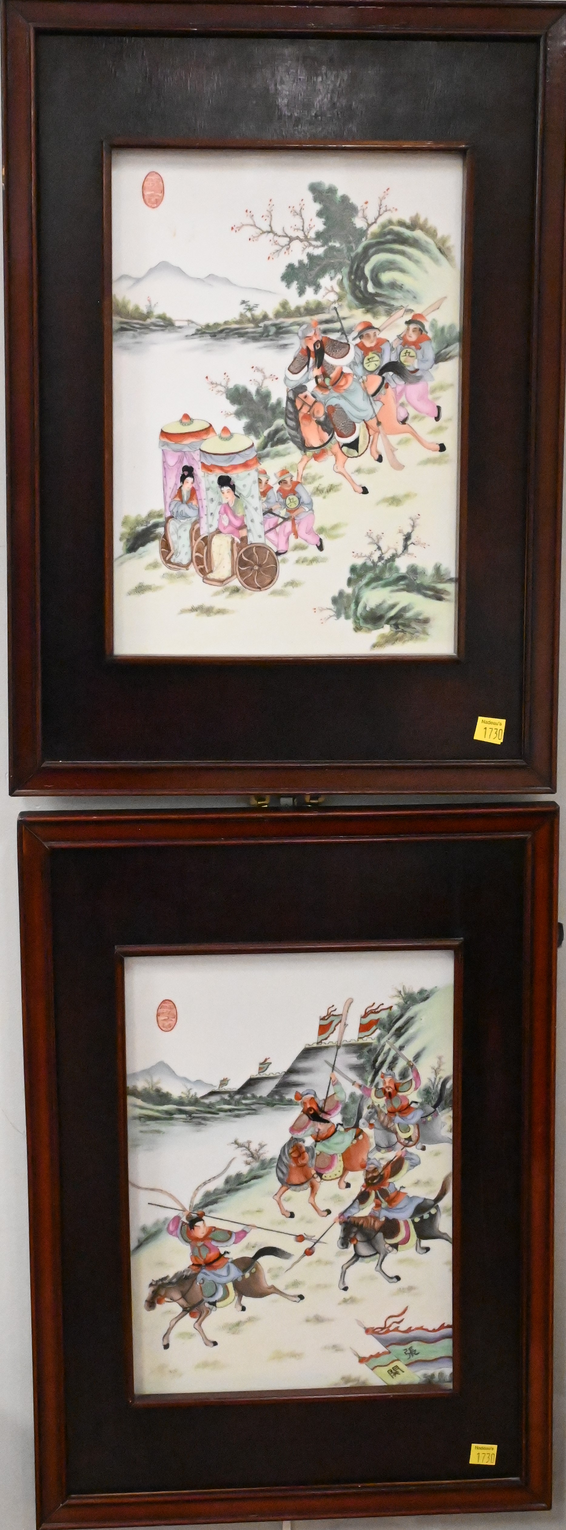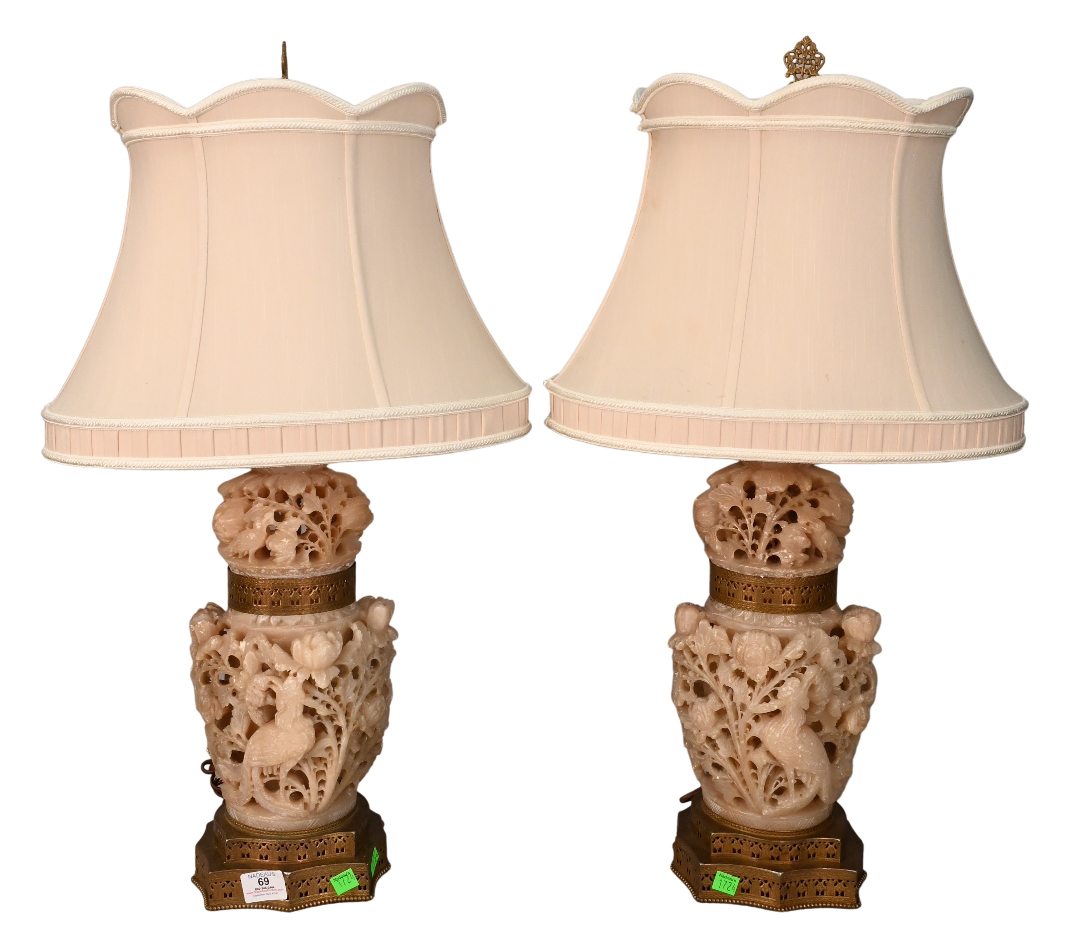 Pair of Asian Carved Soapstone Lamps, in urn form with carved covers and handles, brass mounts and inlay, soapstone height 13 inches, height 29 inches.