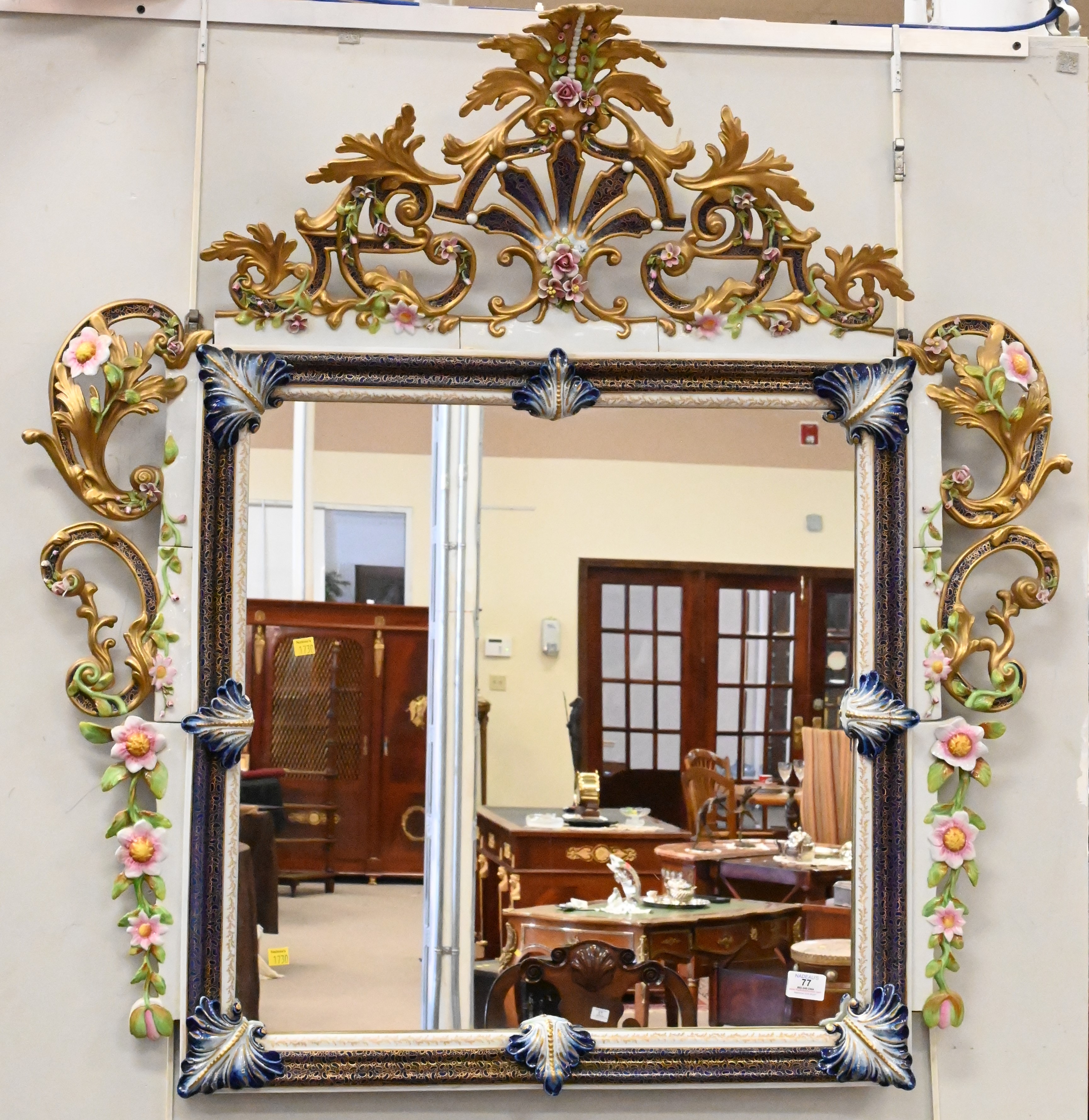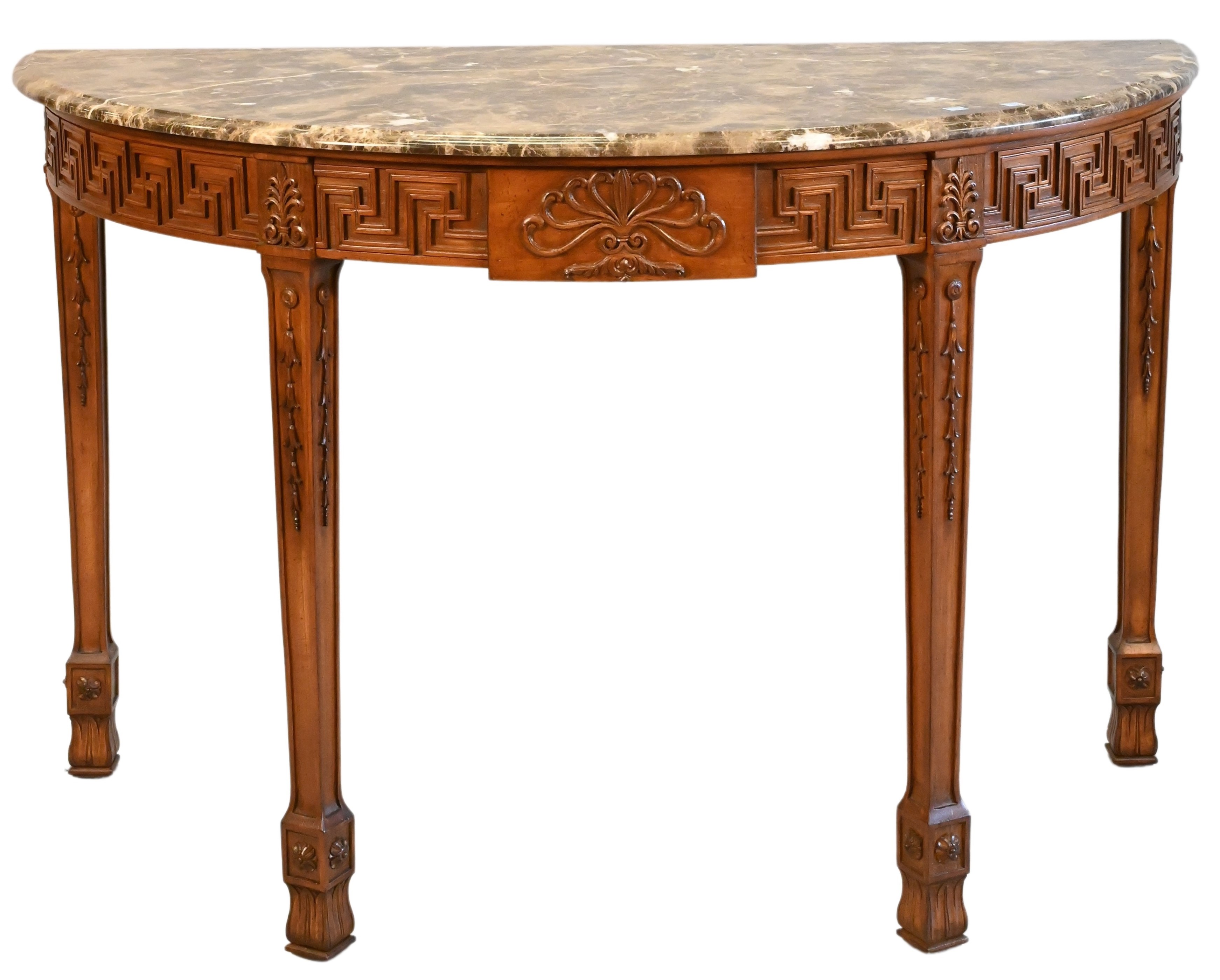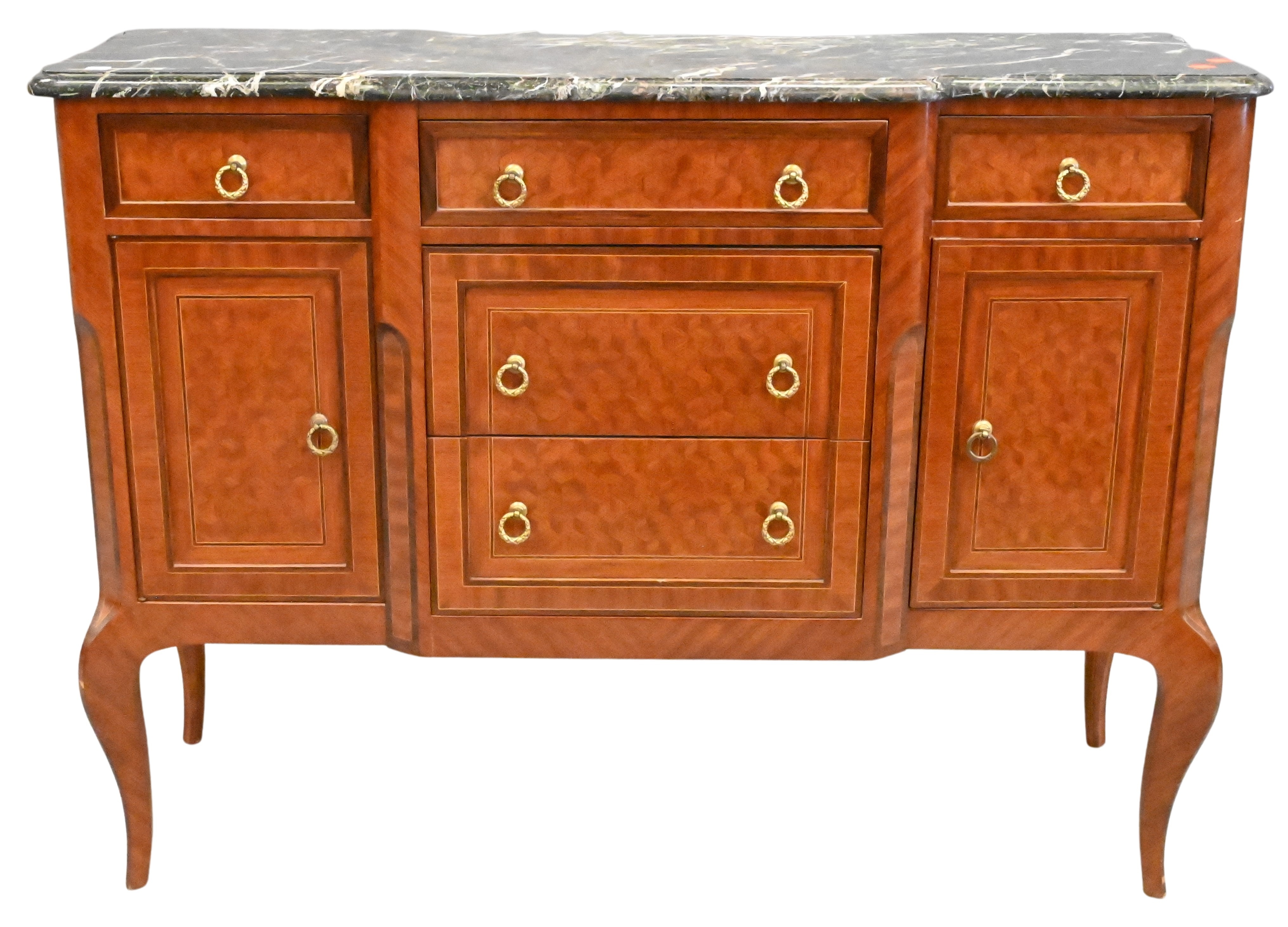 Transitional Louis XV/XVI Style Marble Top Marquetry Commode, having three drawers over two center drawers, flanked by two doors, height 36 inches, width 46 inches, depth 17 inches.