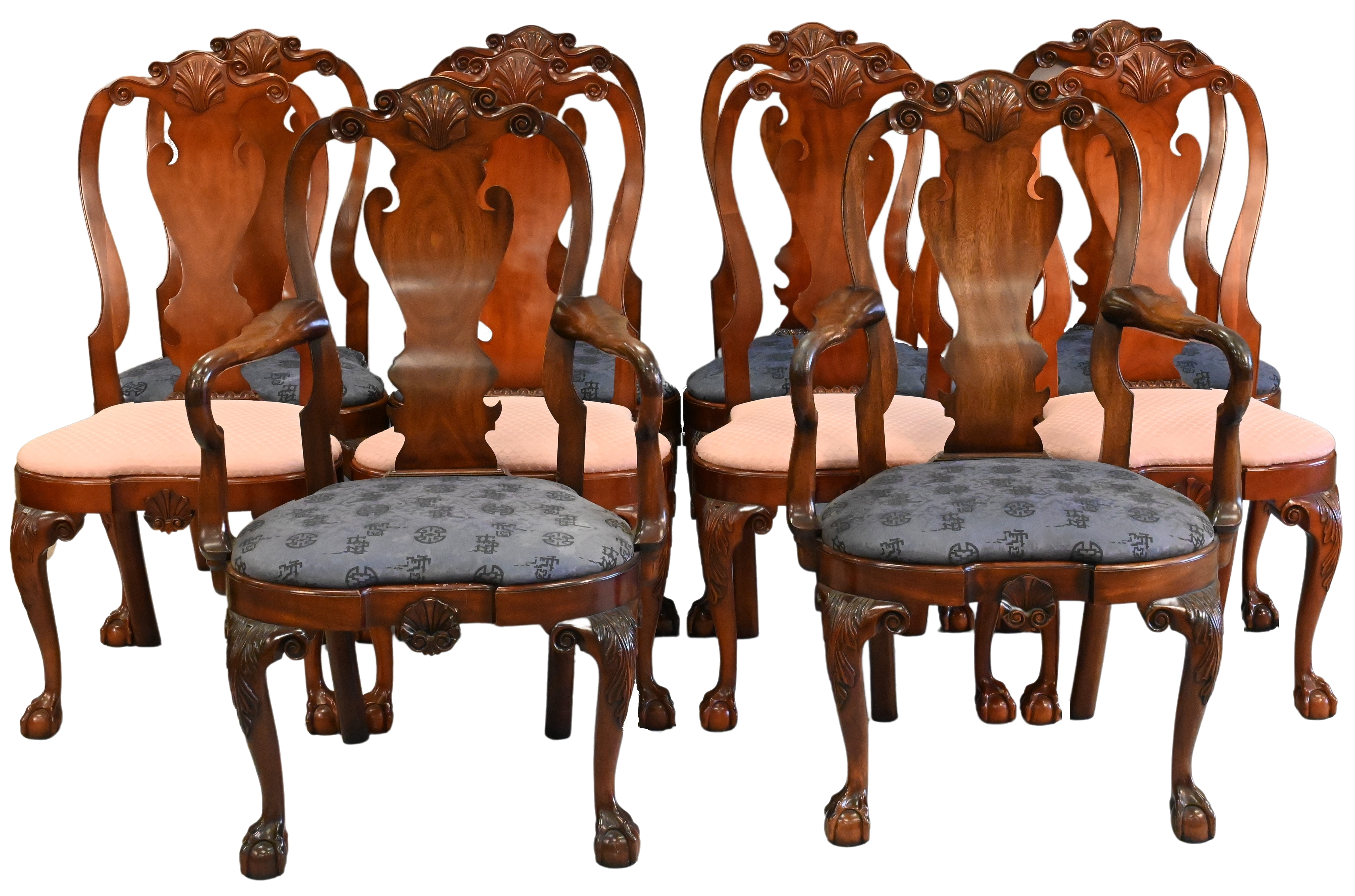 Kindel Set of 12 Chippendale Style Dining Chairs, having Shell and fan carving shaped seats, and ball and claw feet, signed Kindel Grand Rapids (upholstered slip seats with two colors and some with sun fading), height 42 inches, width 26 inches.