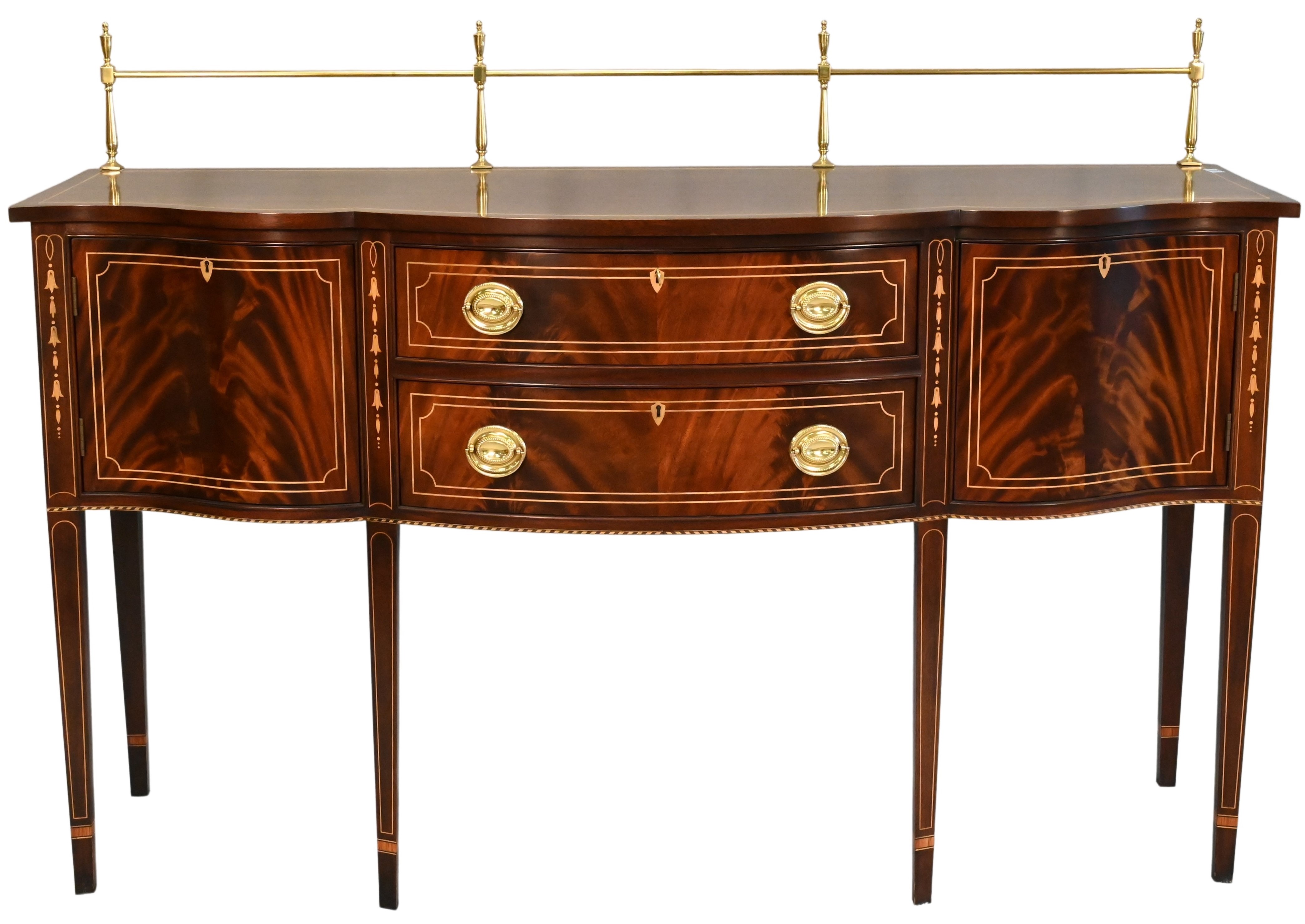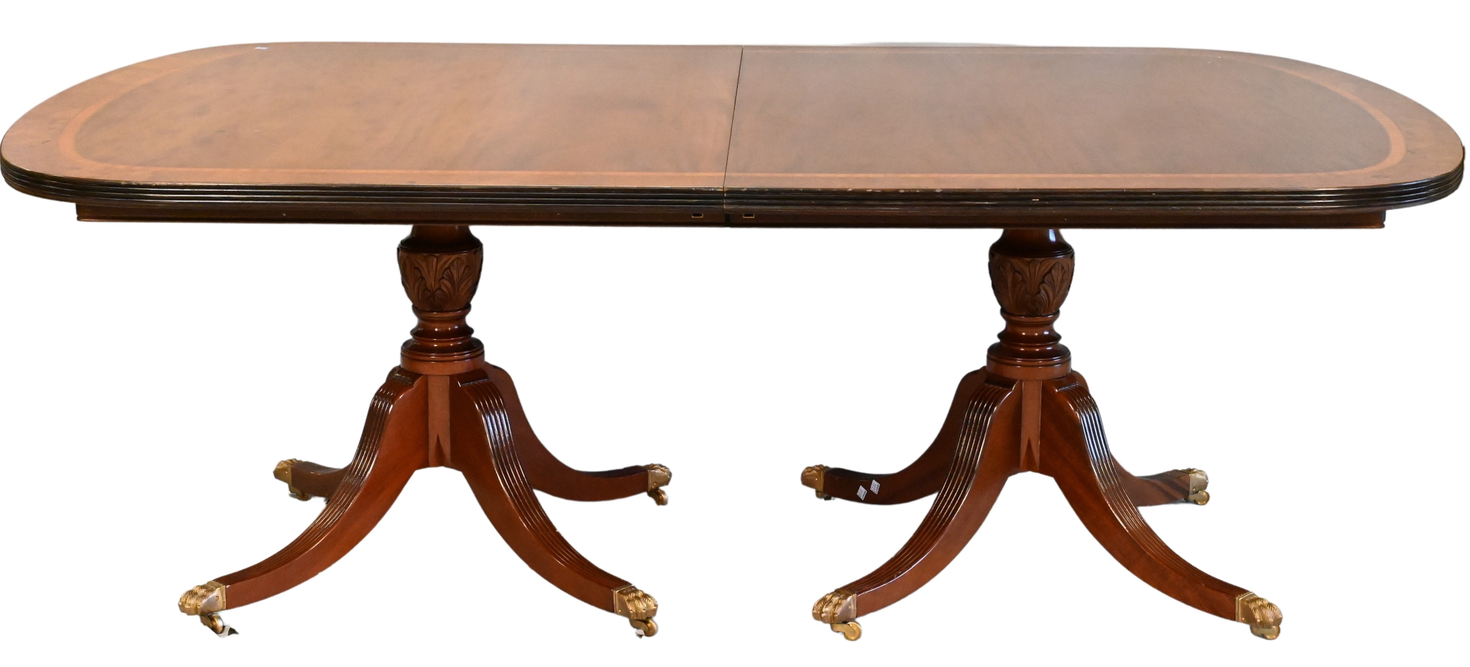 Custom Mahogany Dining Table, having banded inlaid top with burl wood outside band and gadrooned edge on double pedestal base, one leaf, height 29 inches, top 54″x 80″, open 54″ x 97″.