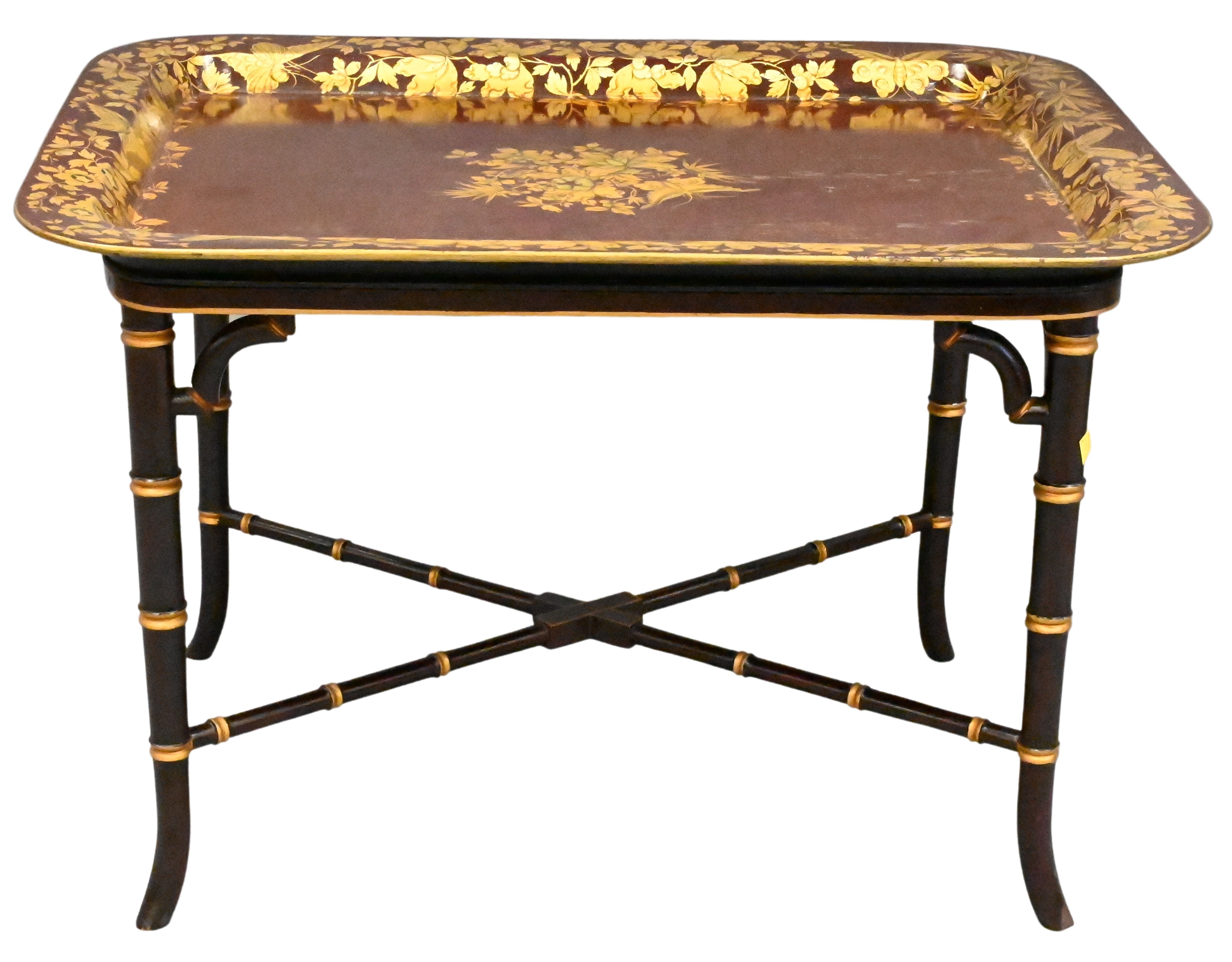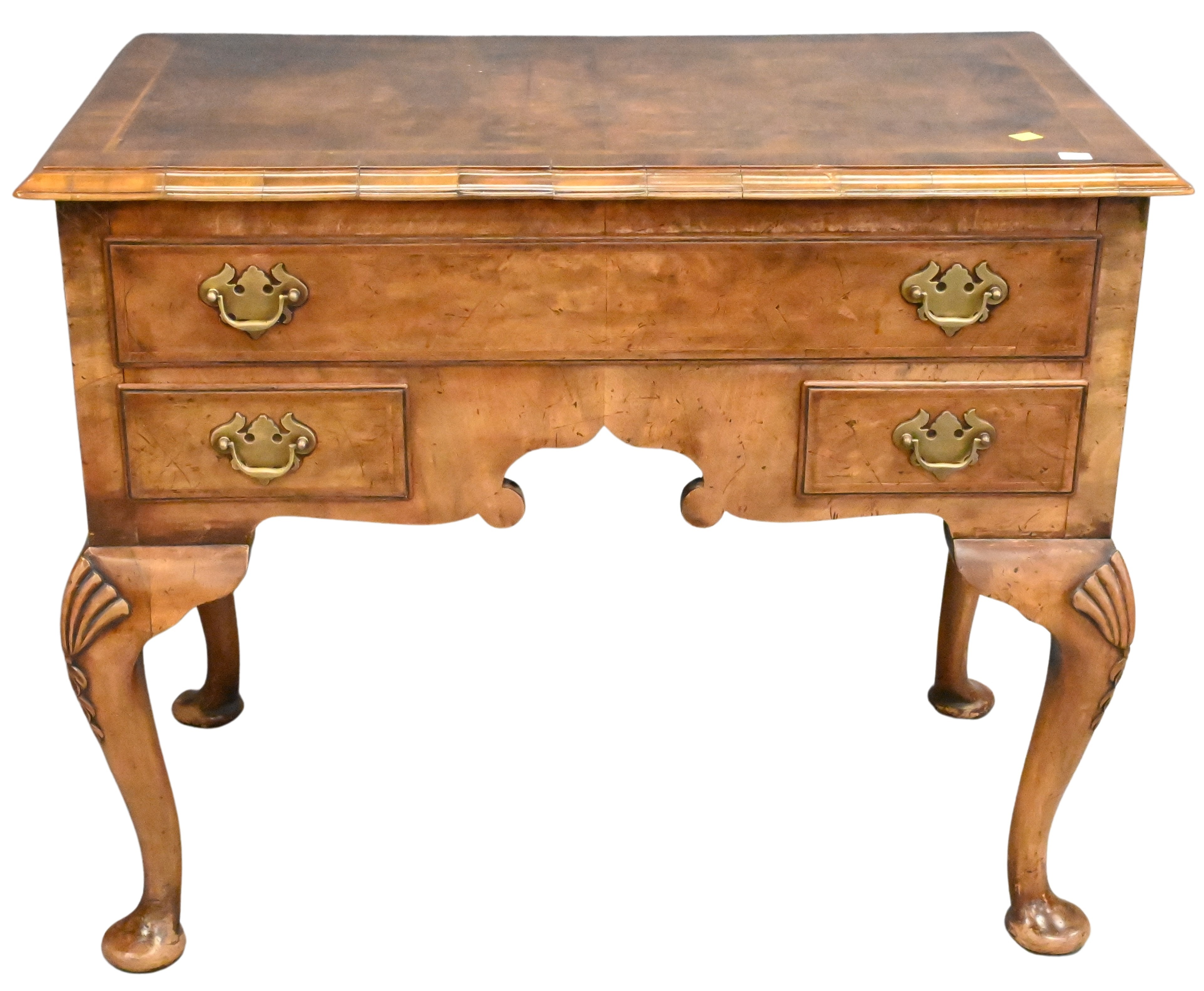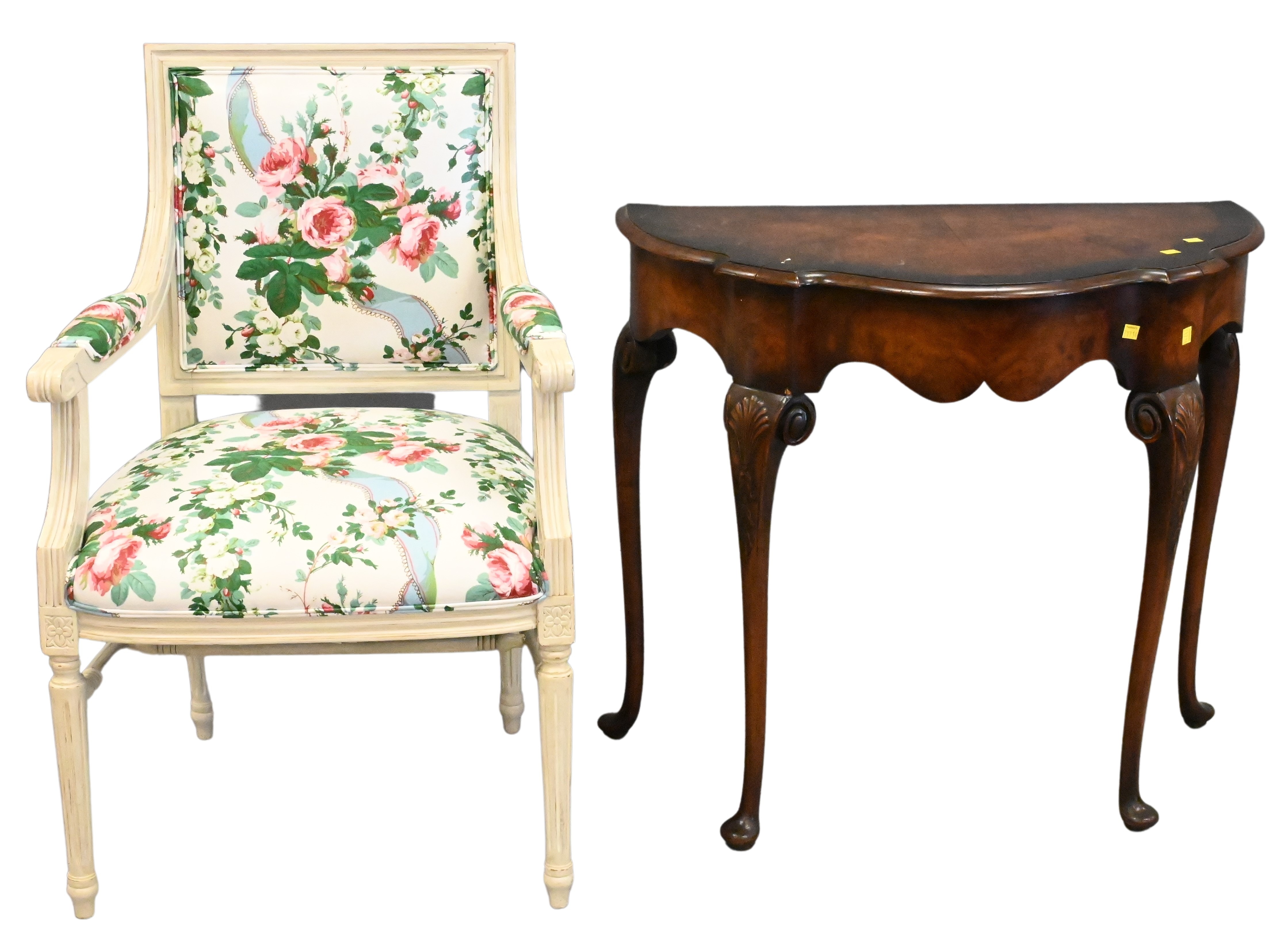 Two Piece Furniture Lot, to include a burlwood Queen Anne style games table, having shaped top and cabriole legs ending in pad feet, along with an upholstered floral arm chair, table height 30 inches, top 18″ x 33″