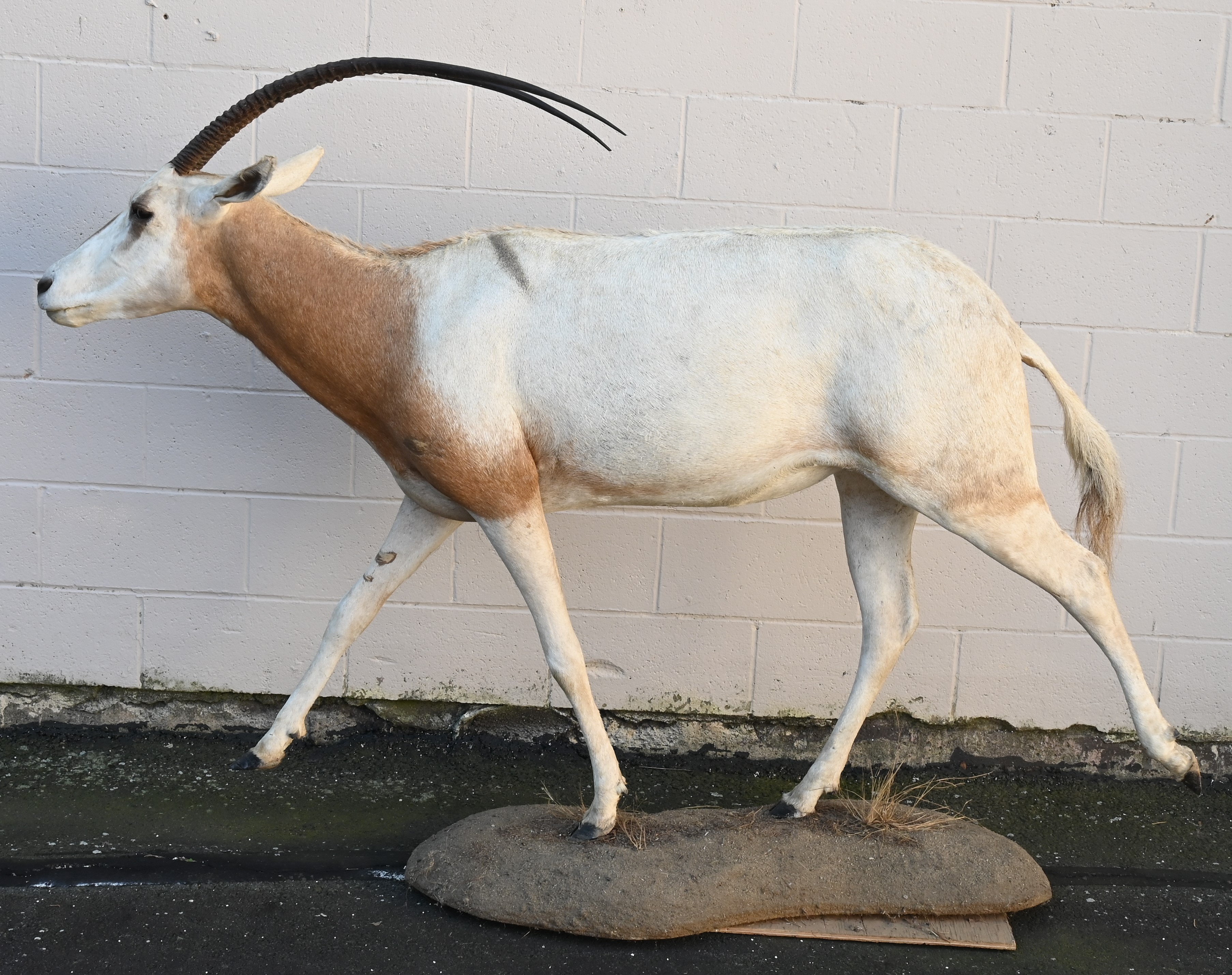 Scimitar Oryx Full Body Taxidermy Figure, set on faux base, extinct in the wild since 2000, native of North Africa, *This piece is endangered and can only be sold to state of Connecticut residents, approximate dimensions are a height of 68 inches, length 62 inches, width 20 inches.