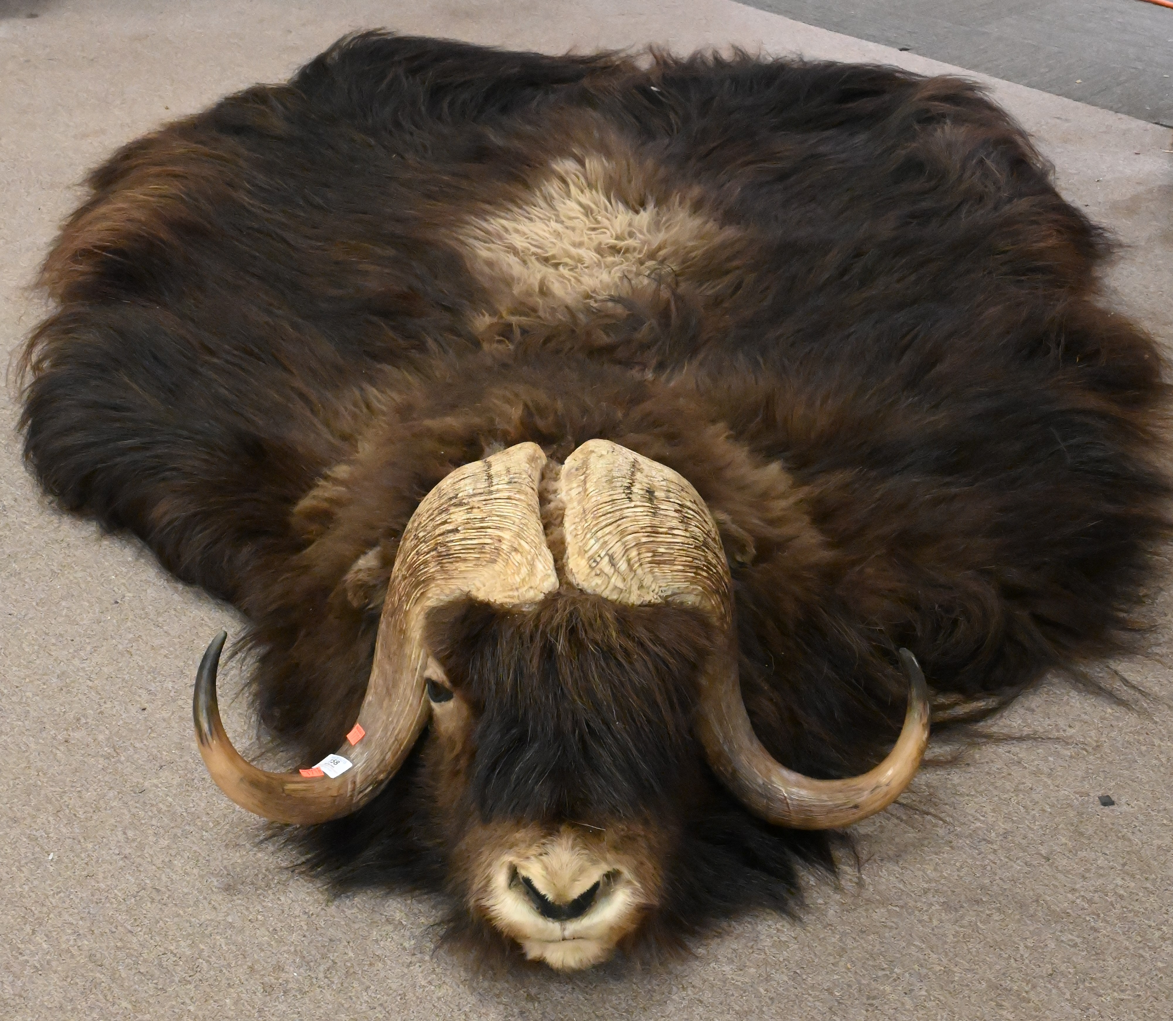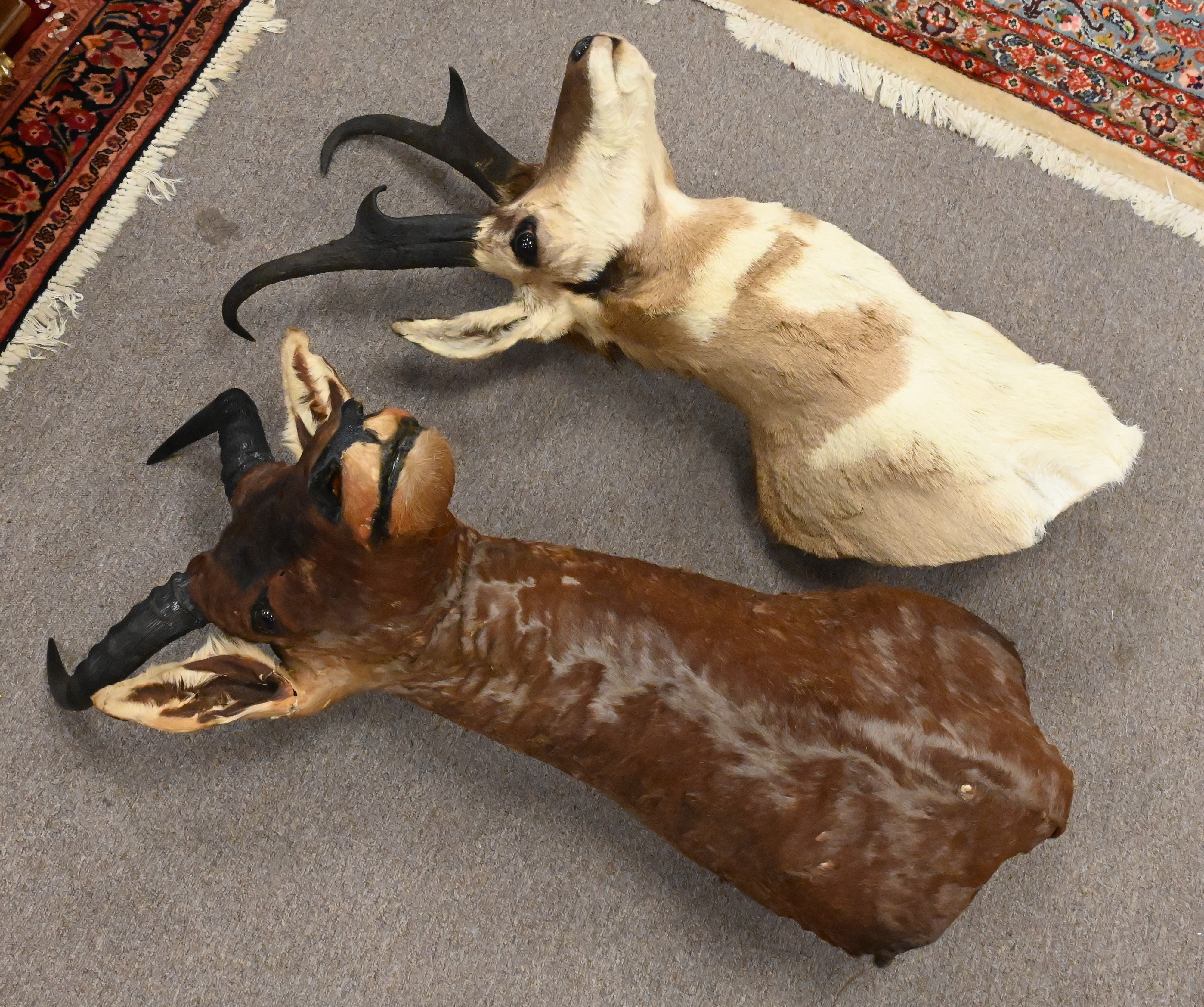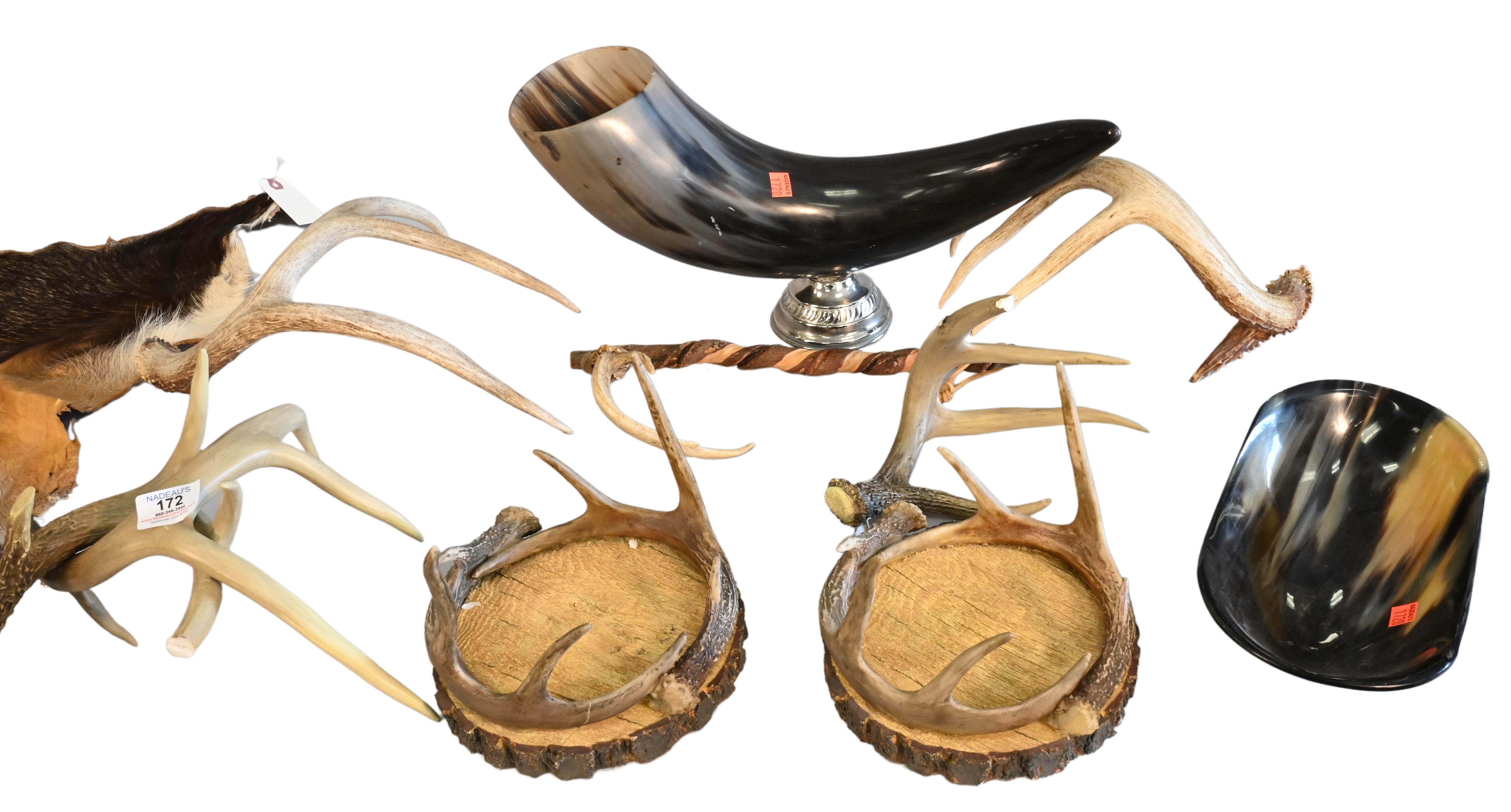 Pelt and Antler Group, to include a pair of faux antler on stamp coasters, a horn bowl and display, carved wood with antler, several loos antlers, a horn bowl, a pelt 33″ x 55″