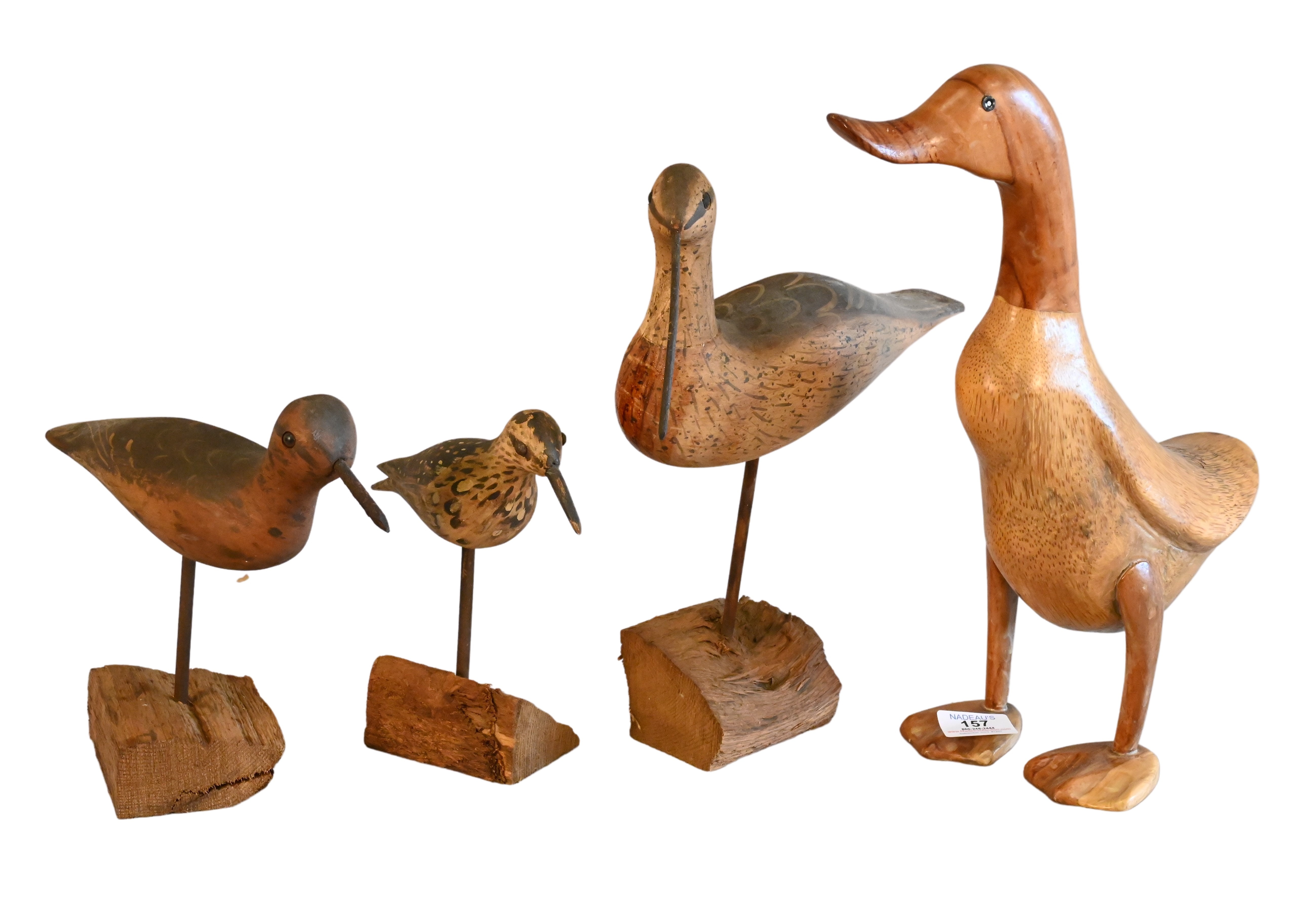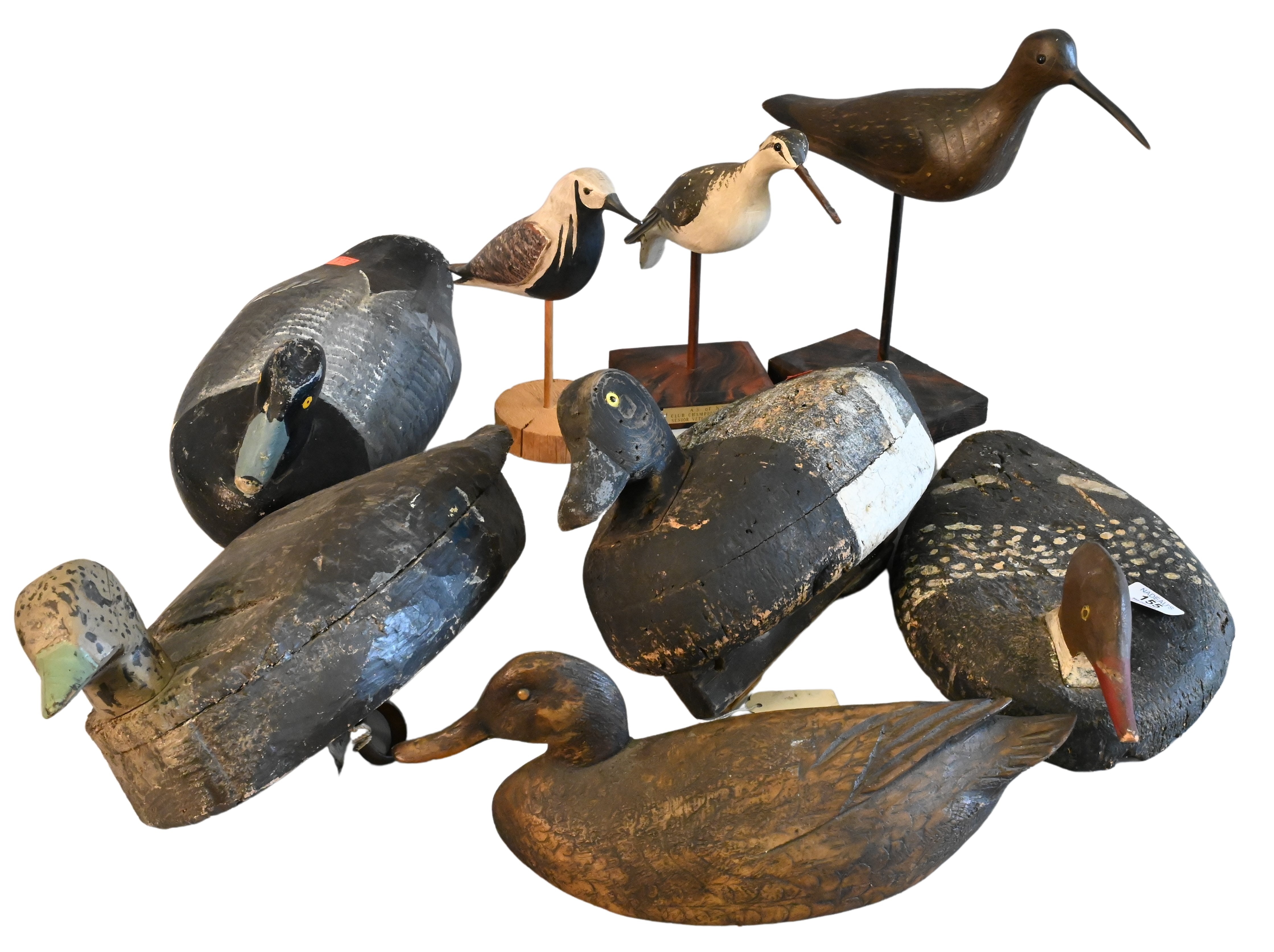 Group of Eight Vintage Hand Carved Ducks and Shore Birds, one having Bayside Antiques receipt, Drake black head model carved by Captain John Glenn along with Canadian decoy, one duck signed Walt Smith, two shore birds signed William Kirkpatrick, along with one shore bird initialed “B”, etc.. largest length 21 inches.