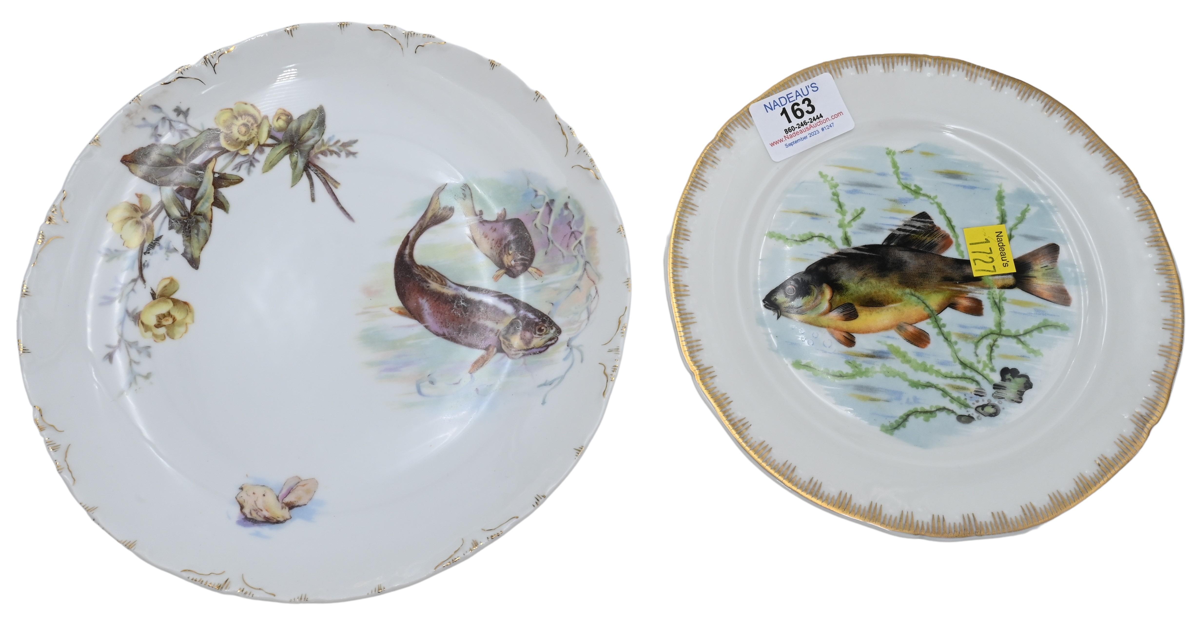 26 Piece R.C. Versailles Handpainted Porcelain Fish Set, to include12 small fish plates, 11 larger fish plates, fish platter, covered serving dish and floral compote, largest platter length 23 1/2 inches.
