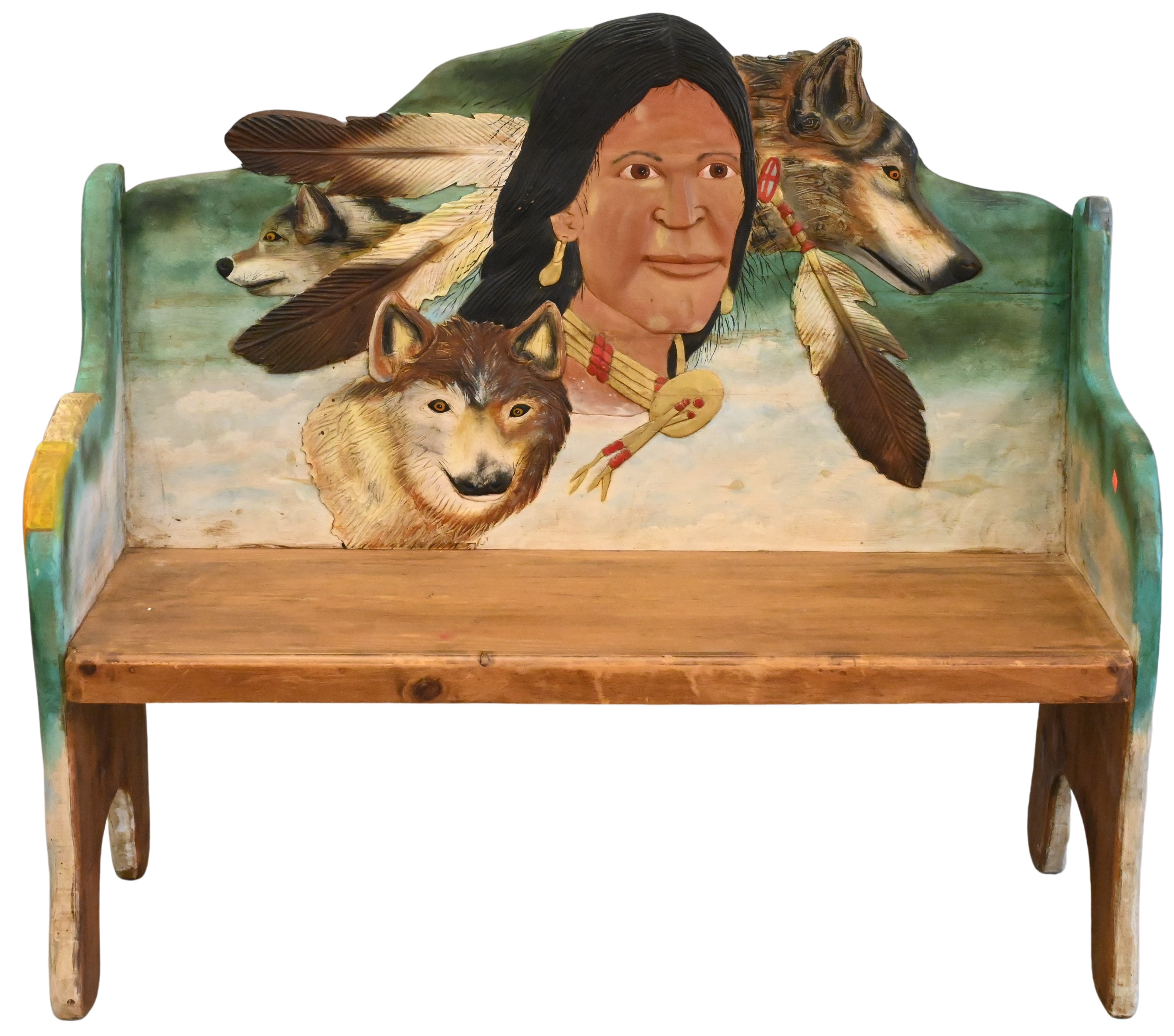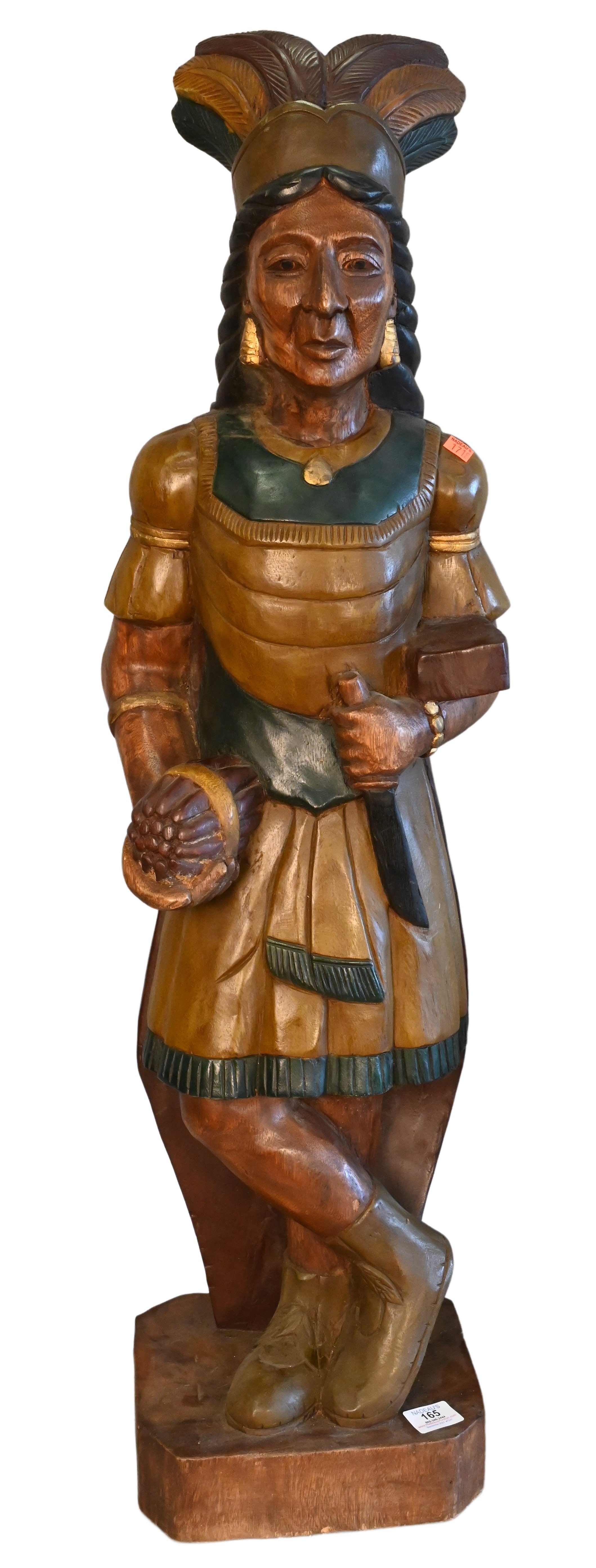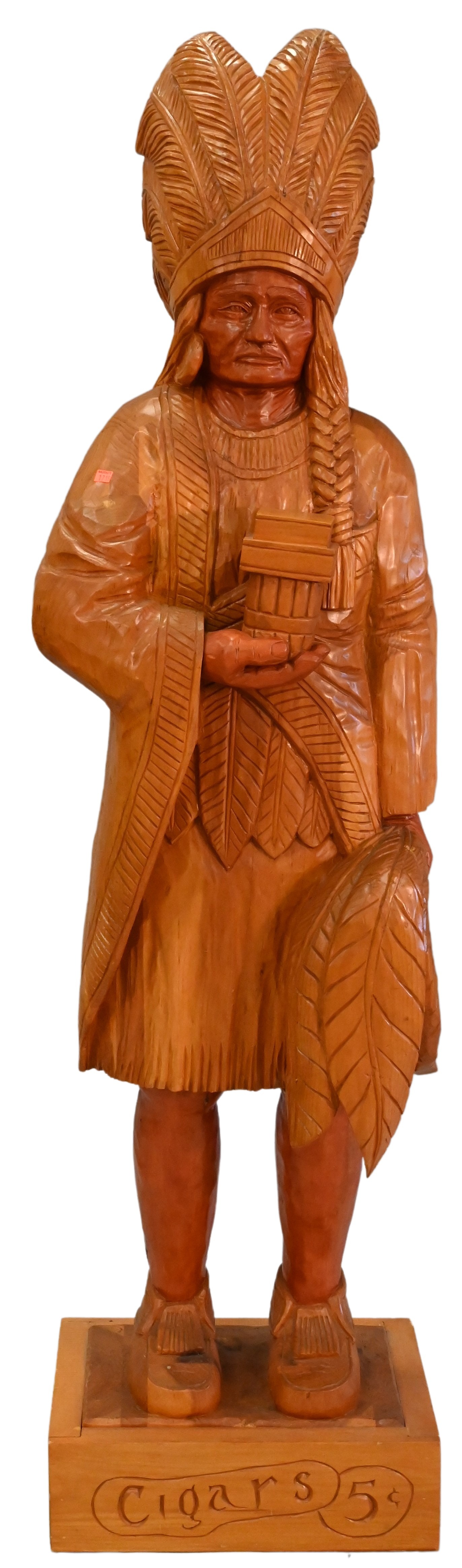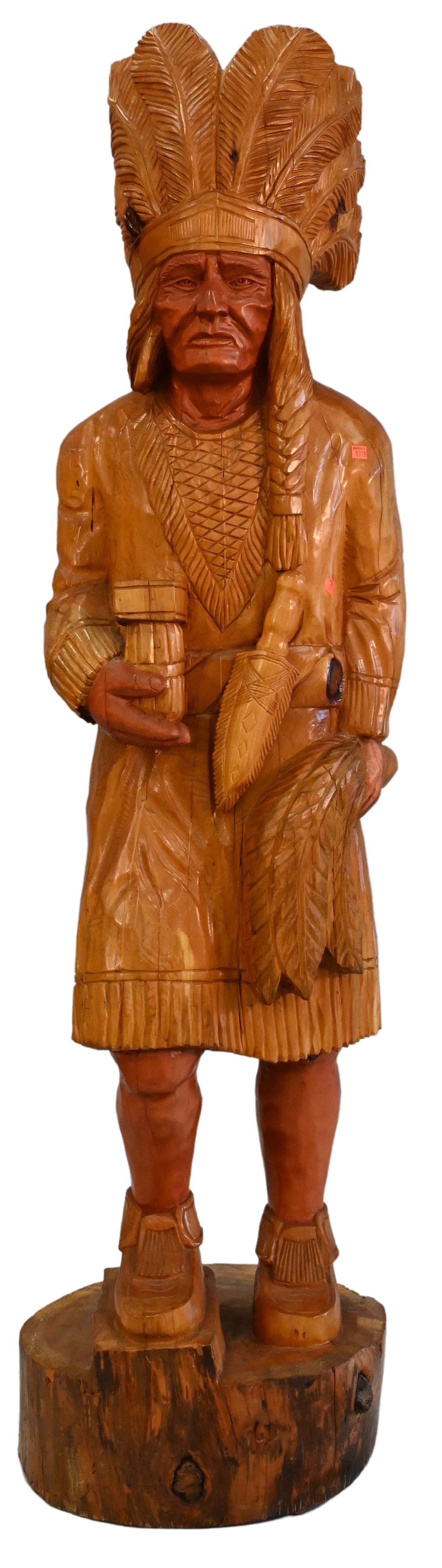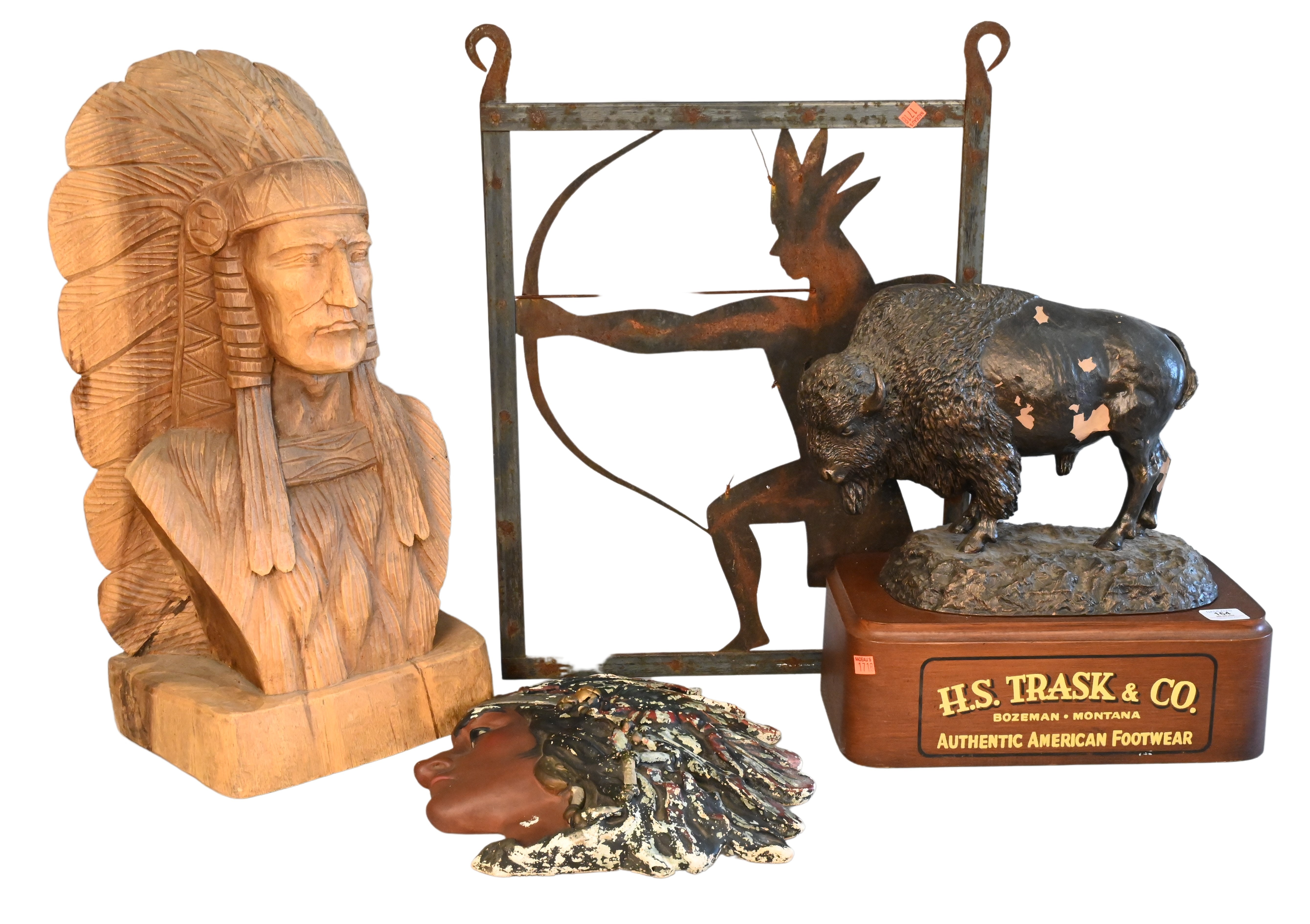 Four Piece Decorative Western Grouping, to include H.J. Trask and Co. advertising store display, Native American Indian chief head ceramic, iron wall hanging silhouette of an American Indian, along with a carved wood chief with bow and arrow bust, height 25 inches.