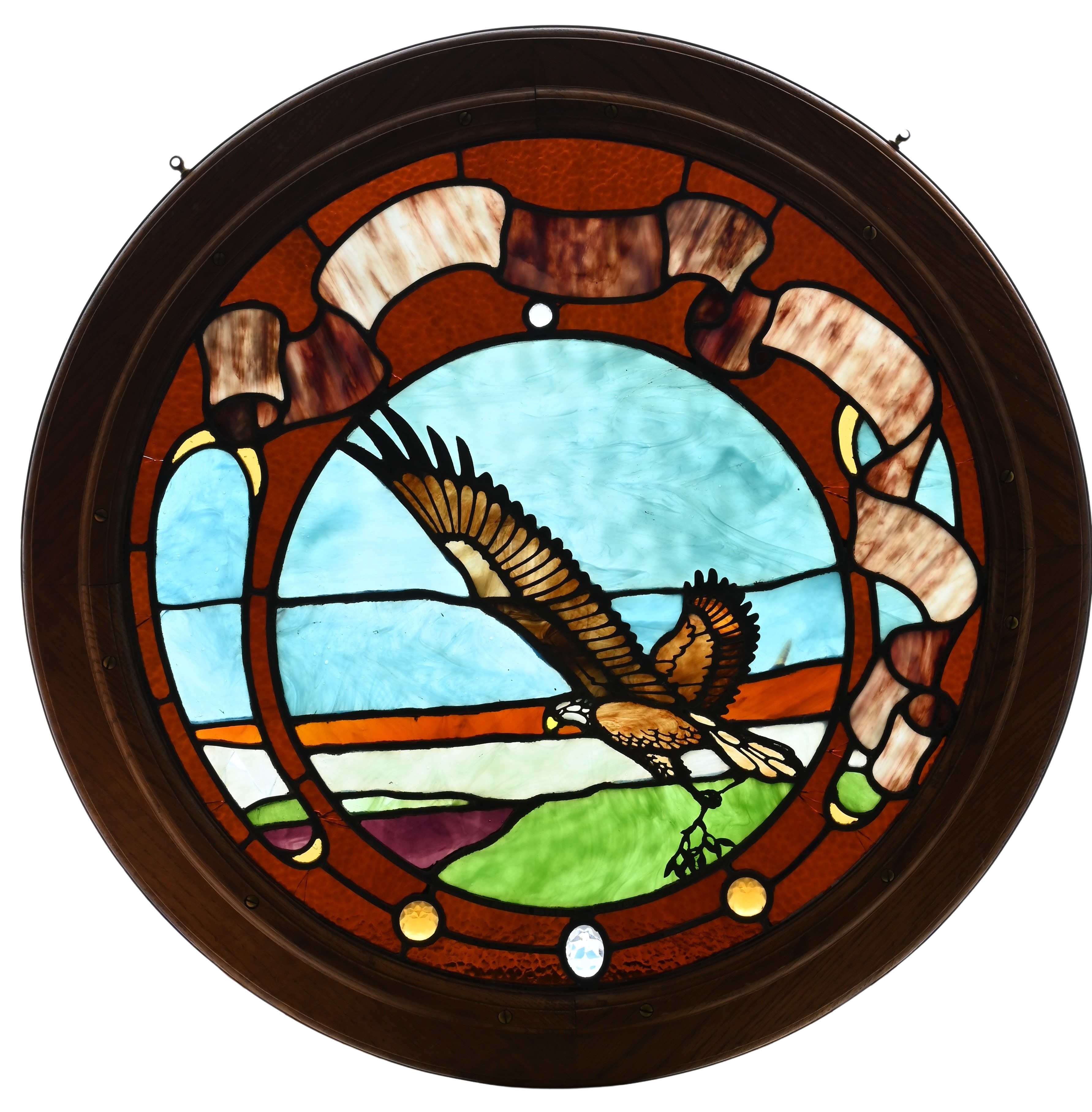 Round Leaded and Wooden Slag/Stained Glass Bald Eagle Window, “The Crystal Rainbow” stamped into lead, “a76.15/200.778”, one broken glass, diameter 30 inches.