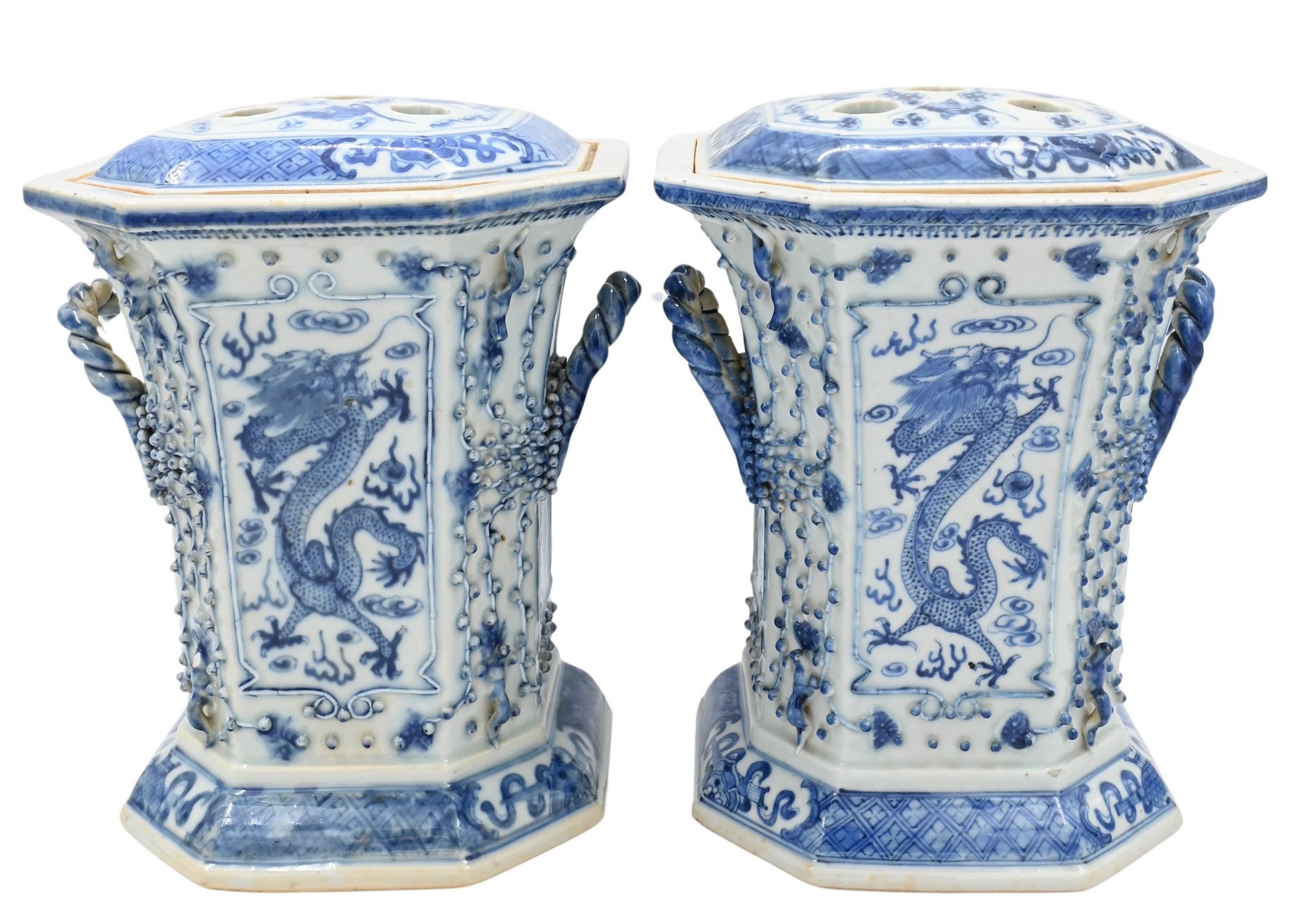 blue and white with painted dragons, bats, rope twist handles