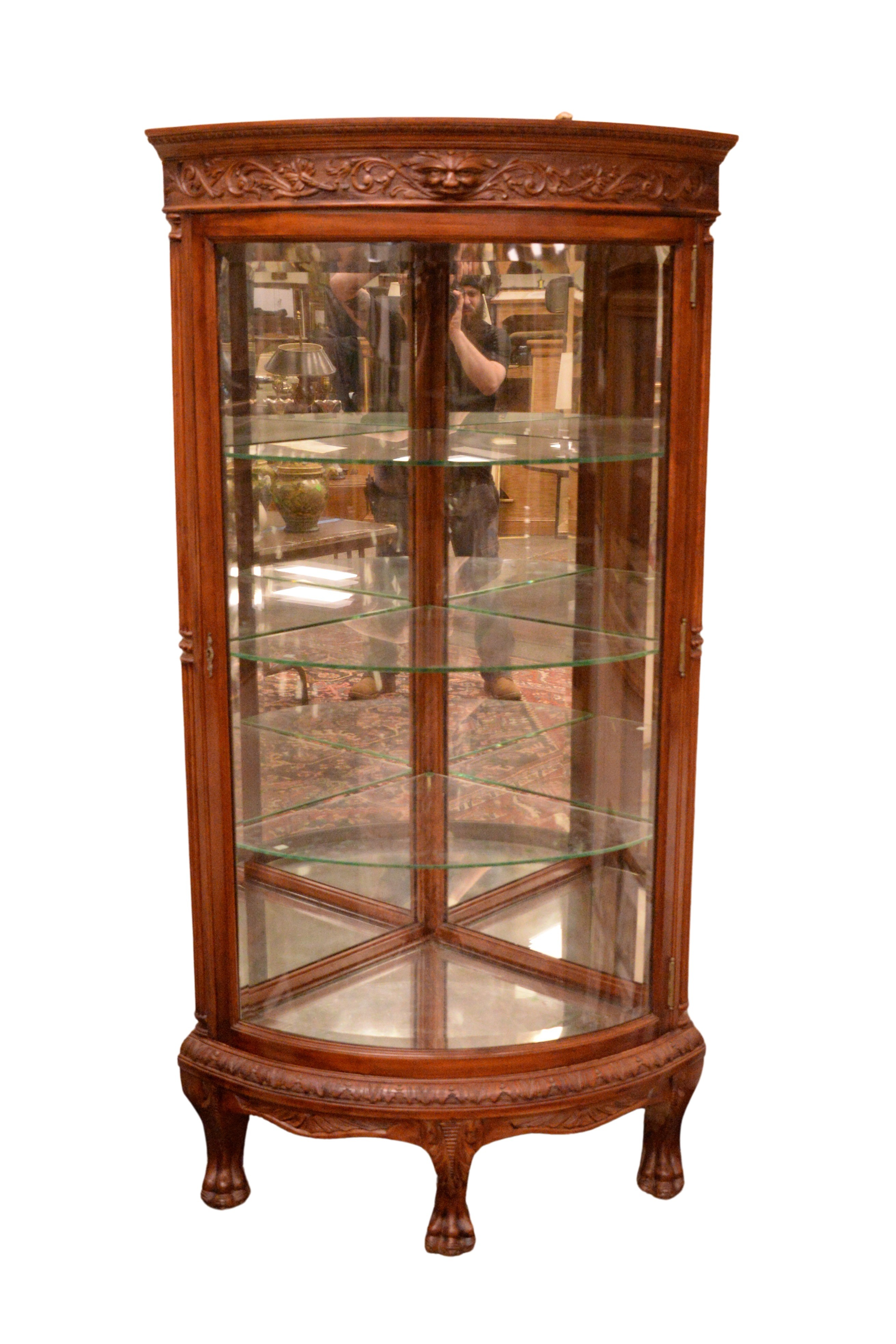 having glass curved door and mirrored back with glass shelves and carved North Wind Face all raised on claw feet