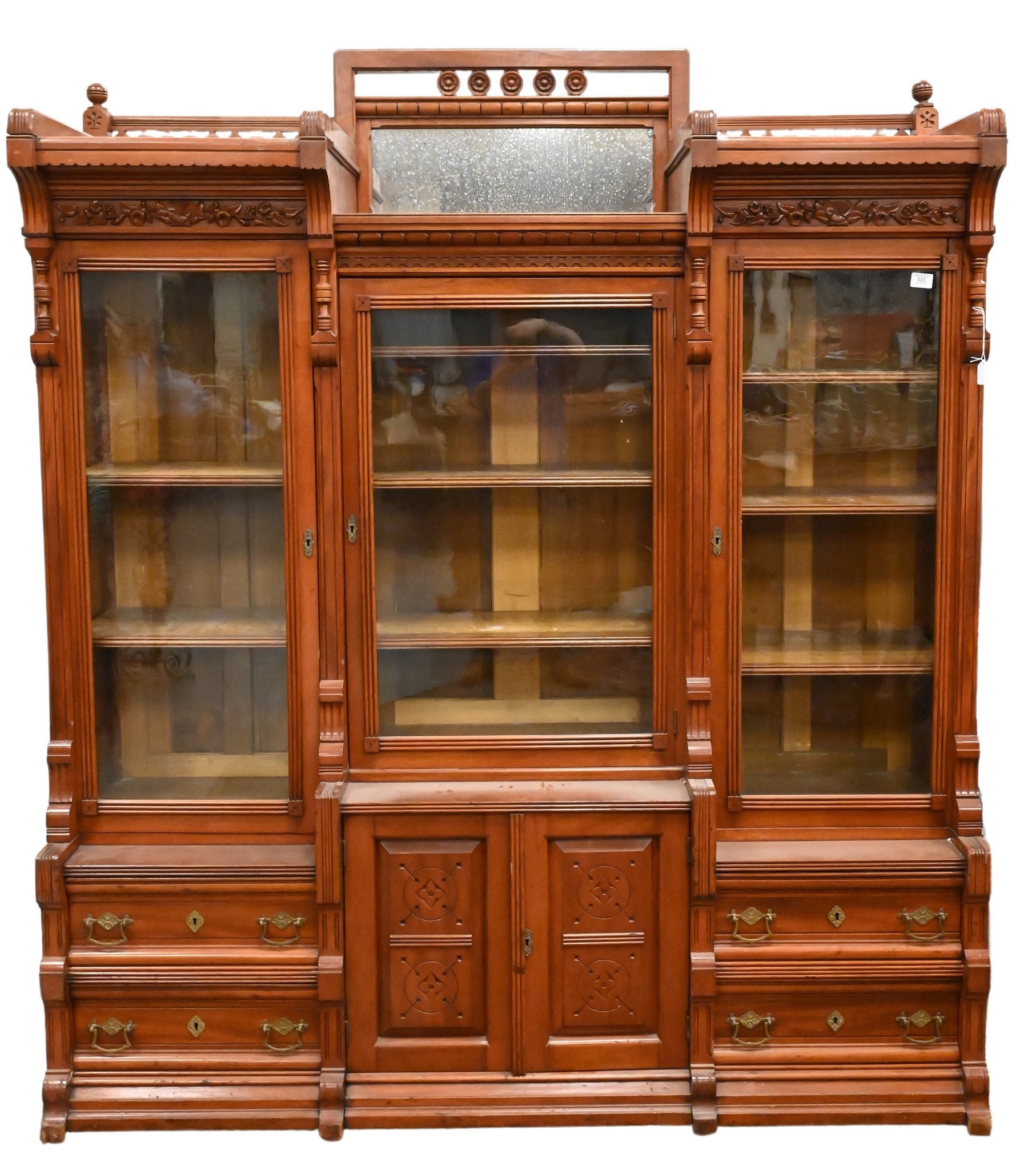 having mirrored gallery over three glass doors, two central doors flanked by pairs of drawers