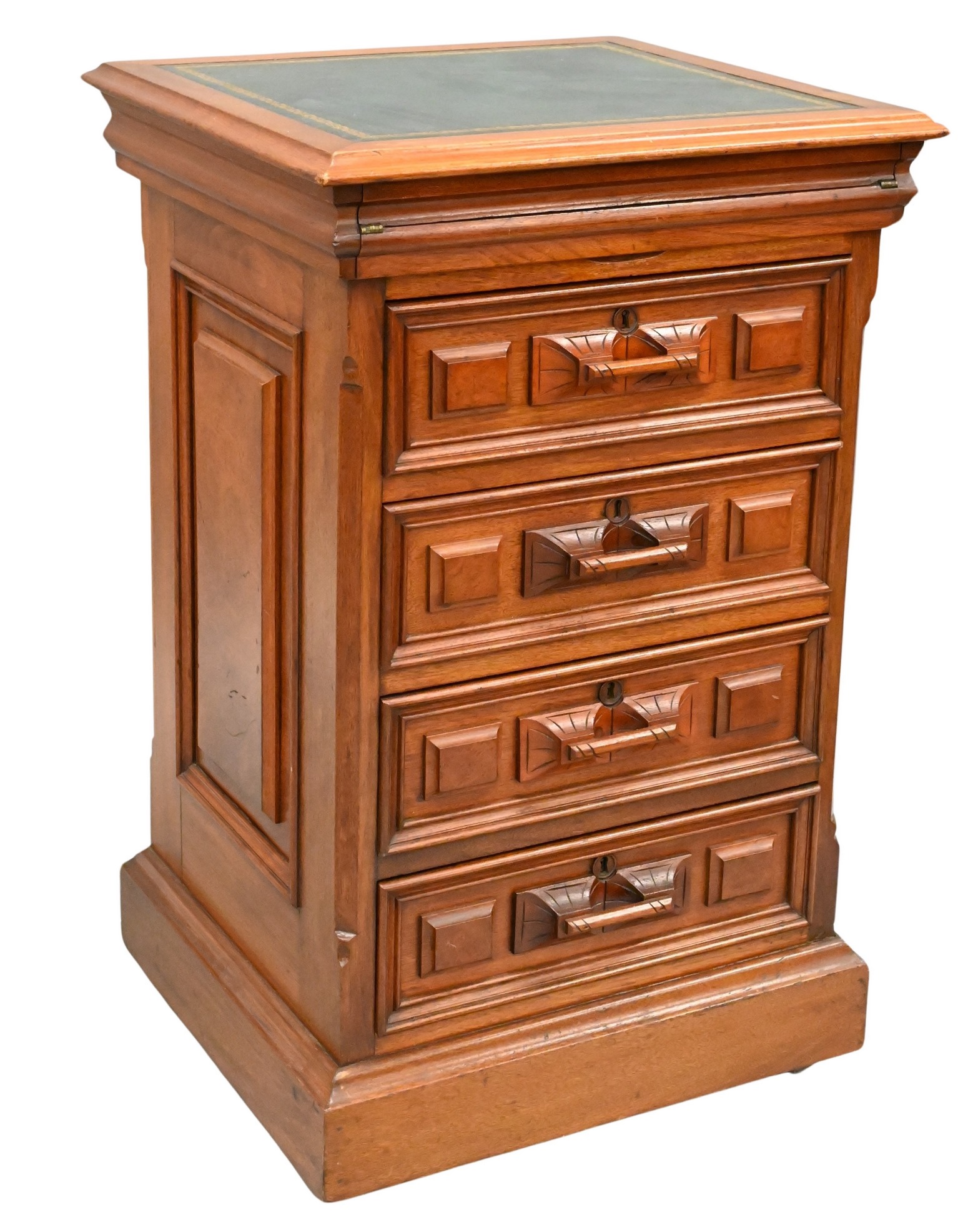 having tooled leather top over pull out felt top writing surface over four drawers with carved pulls and raised burl panels, sides, and back, circa 1870