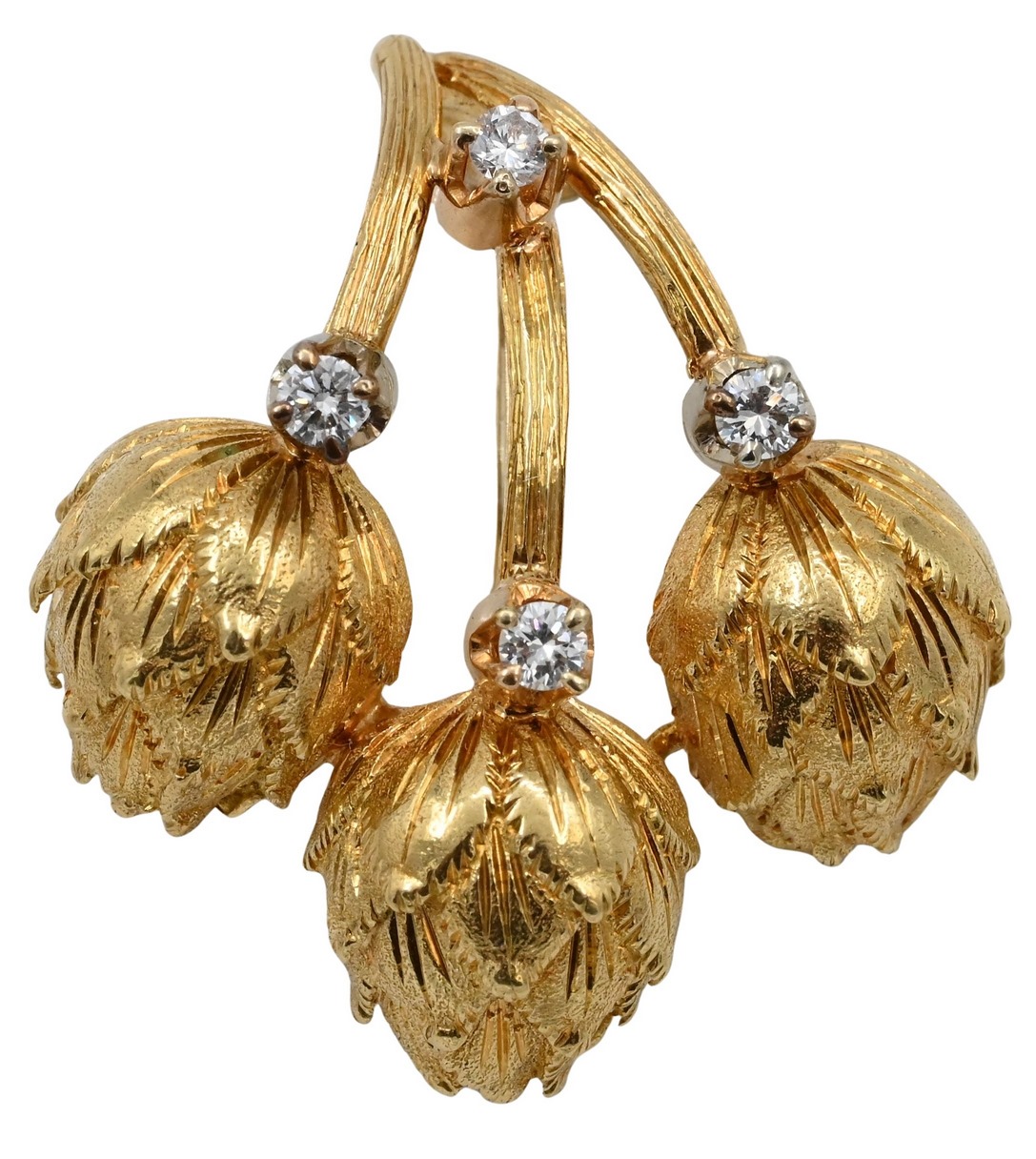 to include 14 Karat yellow gold diamond and sapphire brooch in a floral form having a 4.9 millimeter center diamond surrounded by small sapphires in cluster and small diamonds throughout and a 18 Karat yellow gold leaf form brooch having small red stone, marked illegibly