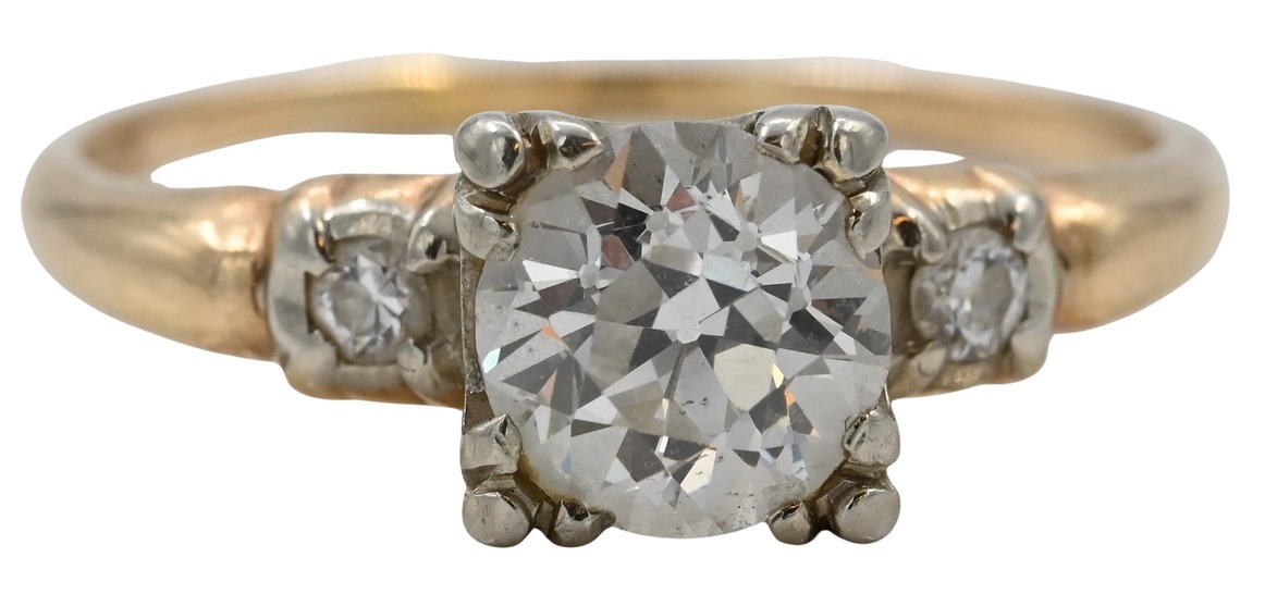 center stone approximately 1ct (6.4mm) flanked on either side by small diamonds, approximately 1.9mm