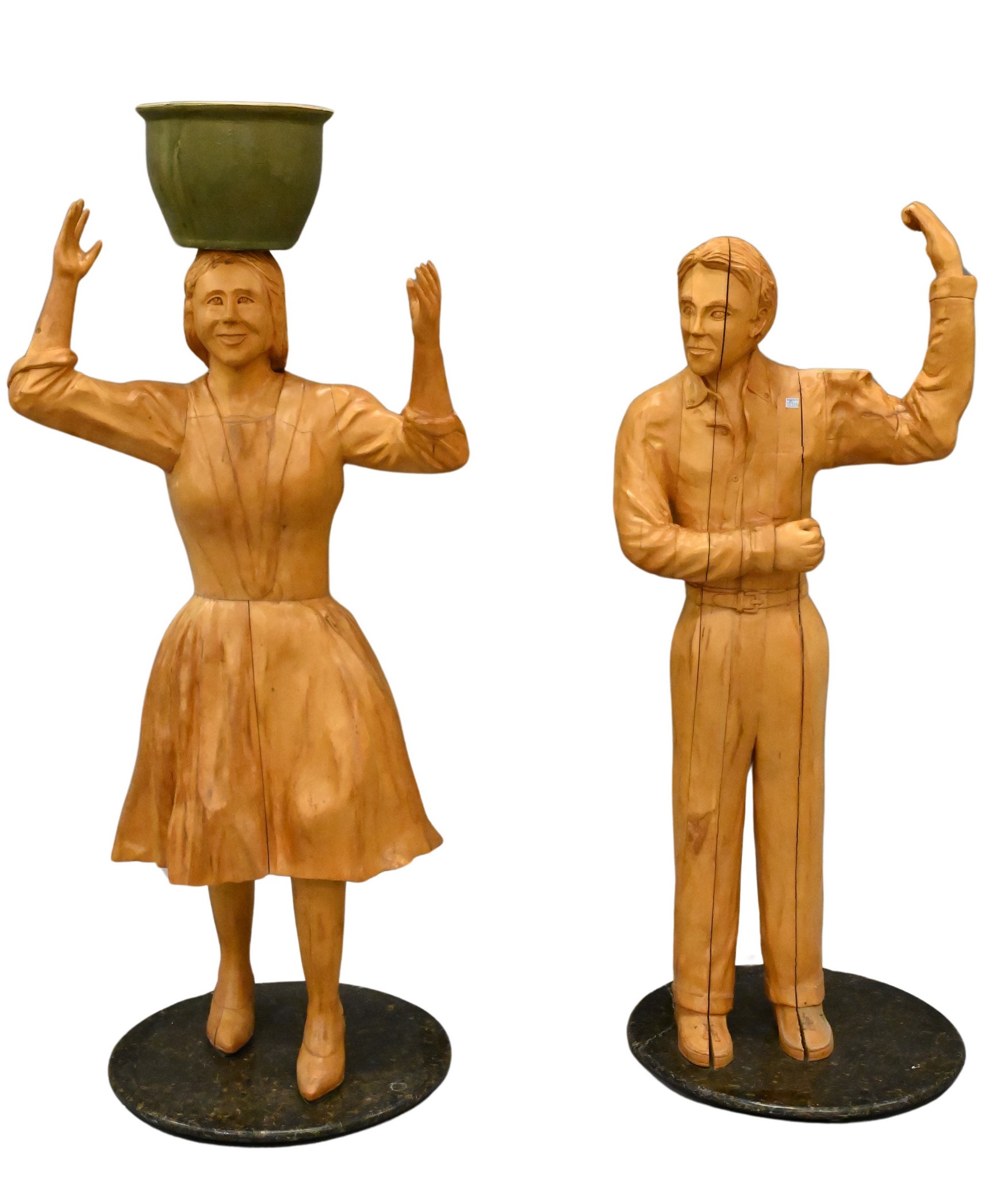 Carved Wooden Male and Female Figures having Round Granite Bases
