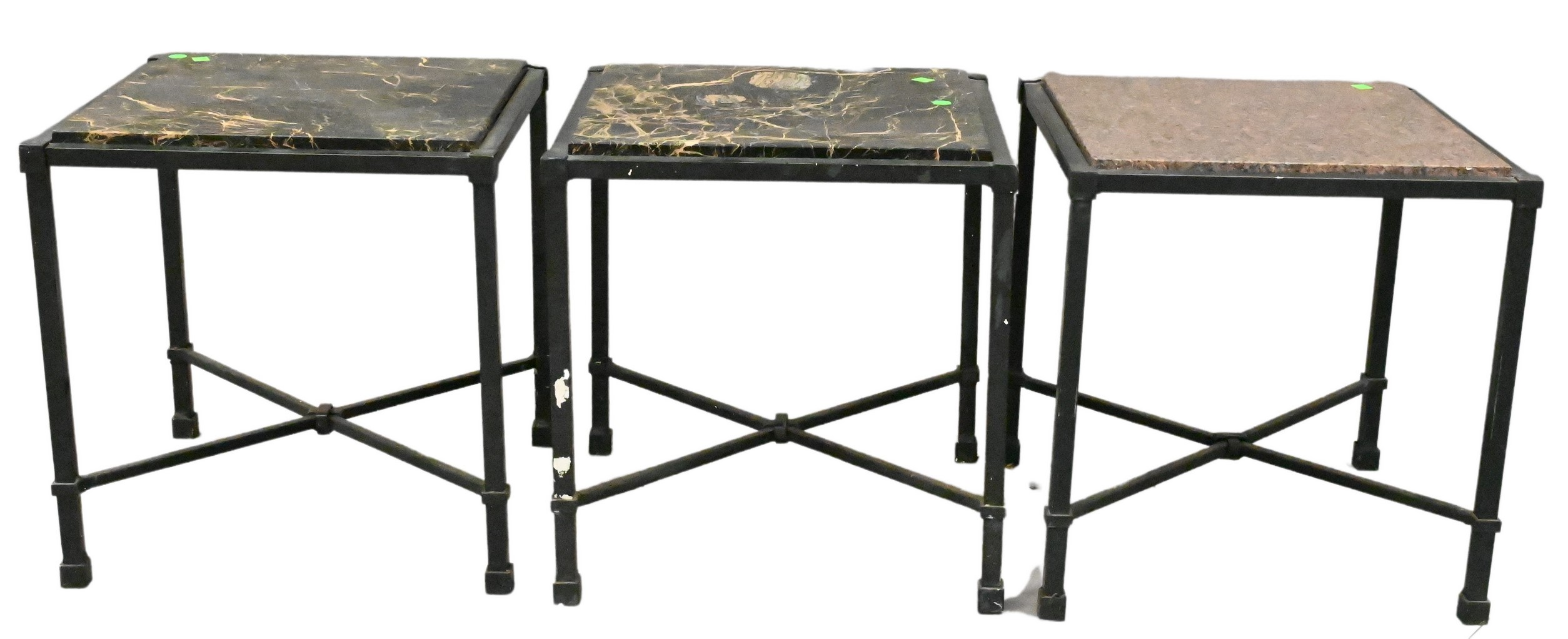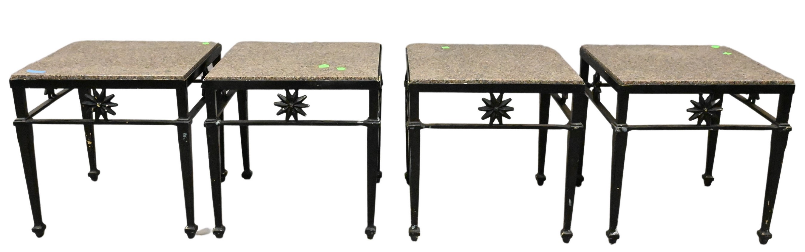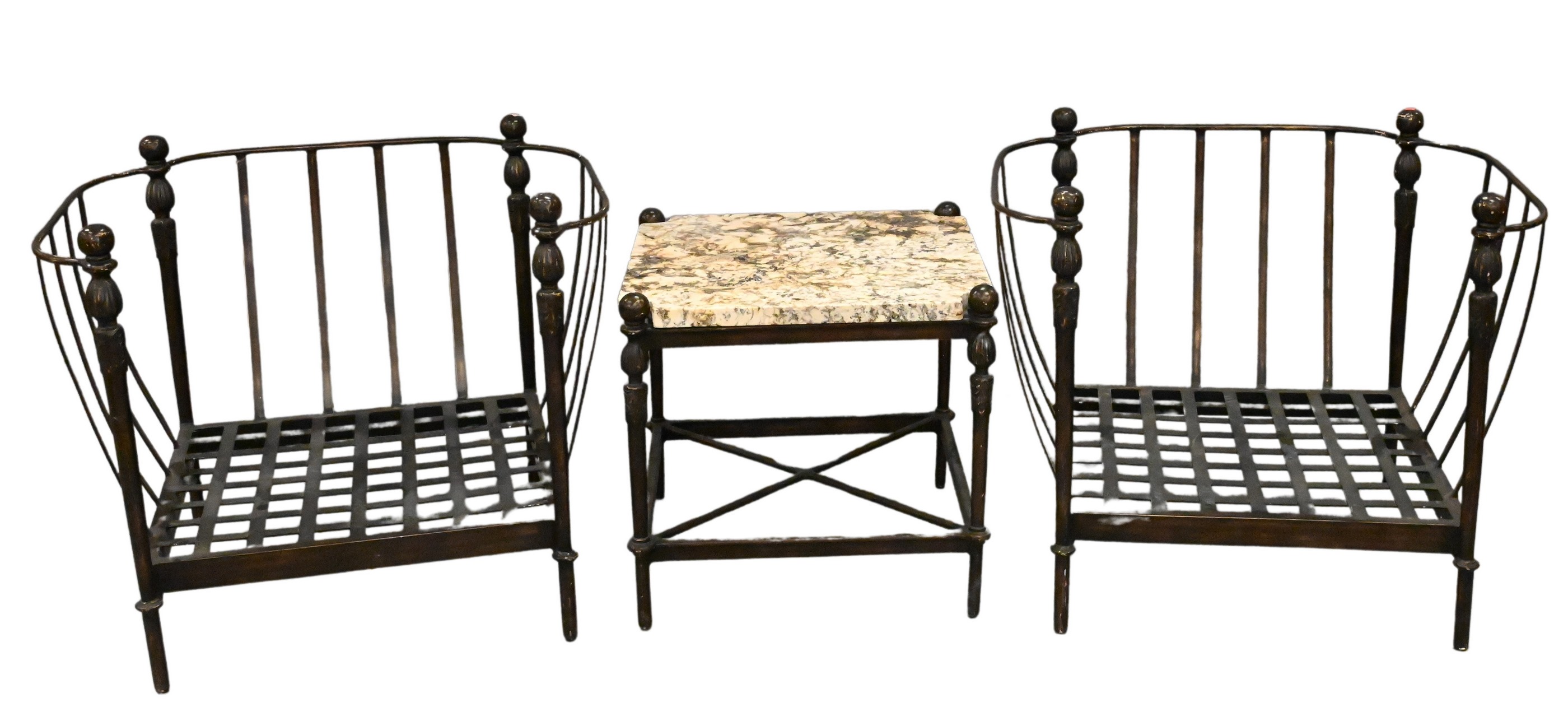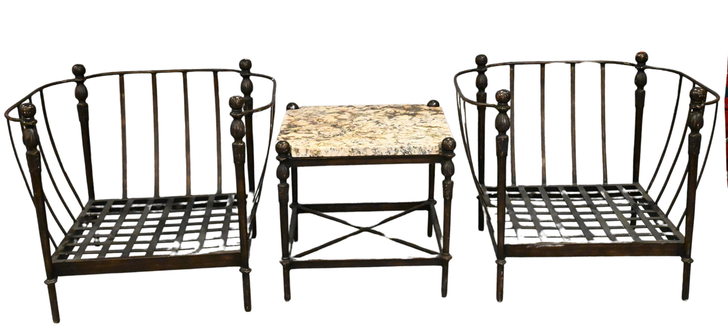 to include round table having granite top set on iron legs with x bar base, four iron armchairs having x back and base with scrolling arms along with white cushions
