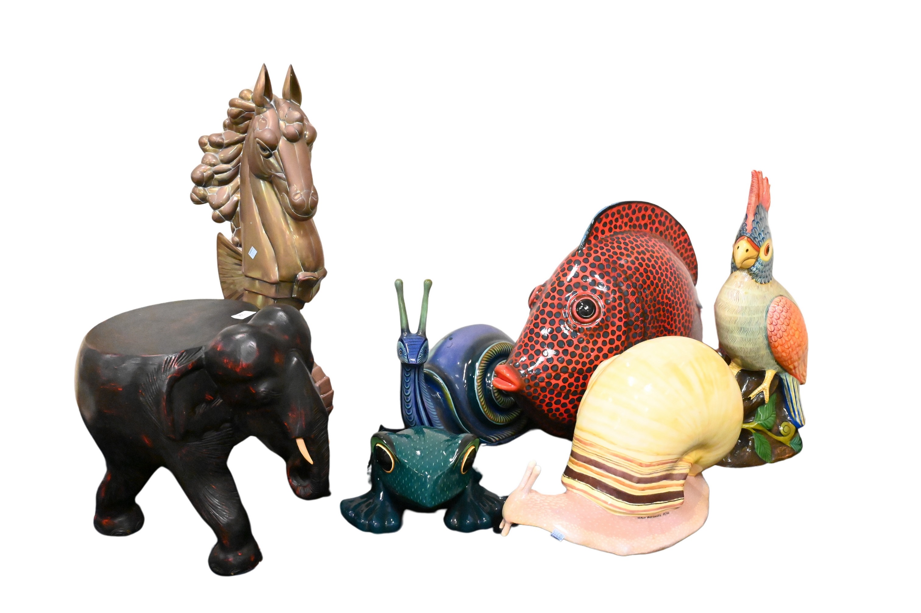 to include five paper mache animals signed illegibly, brass seahorse, Maitland Smith elephant stool