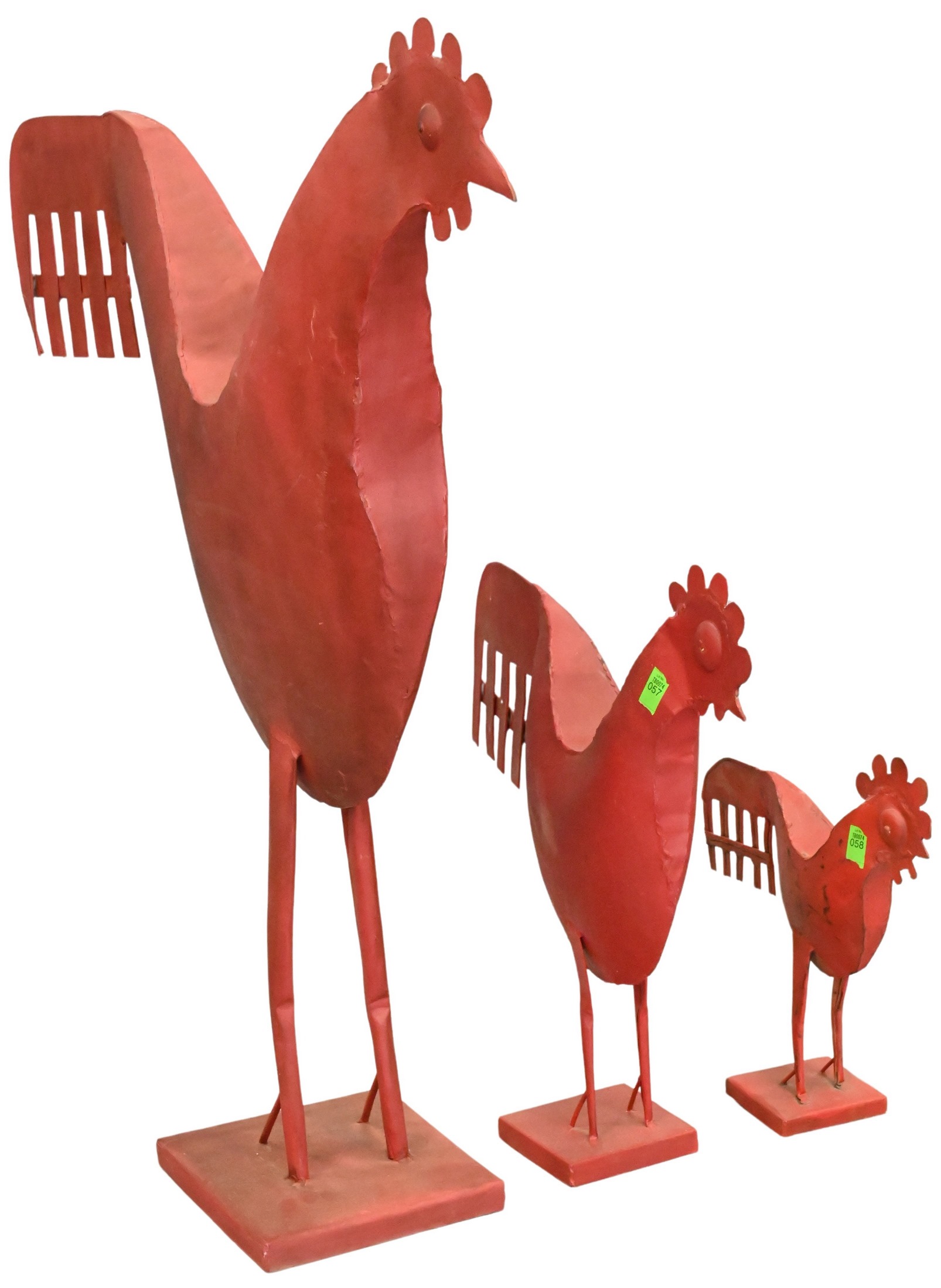 Three Folk Art Red Metal Roosters