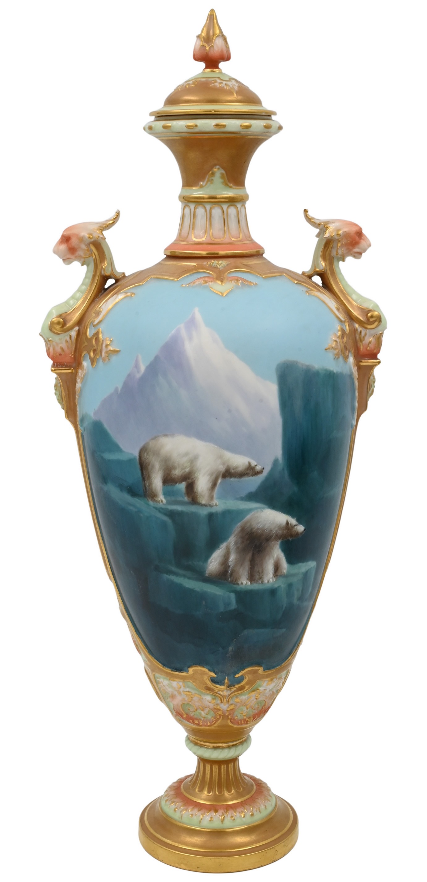 having a continuous icelandic scene with two polar bears, two peach and gilt colored griffin handles, having flame finial on lid, signed lower left “H. Davis”, purple Worcester mark on base, model number 240989, marked 1764