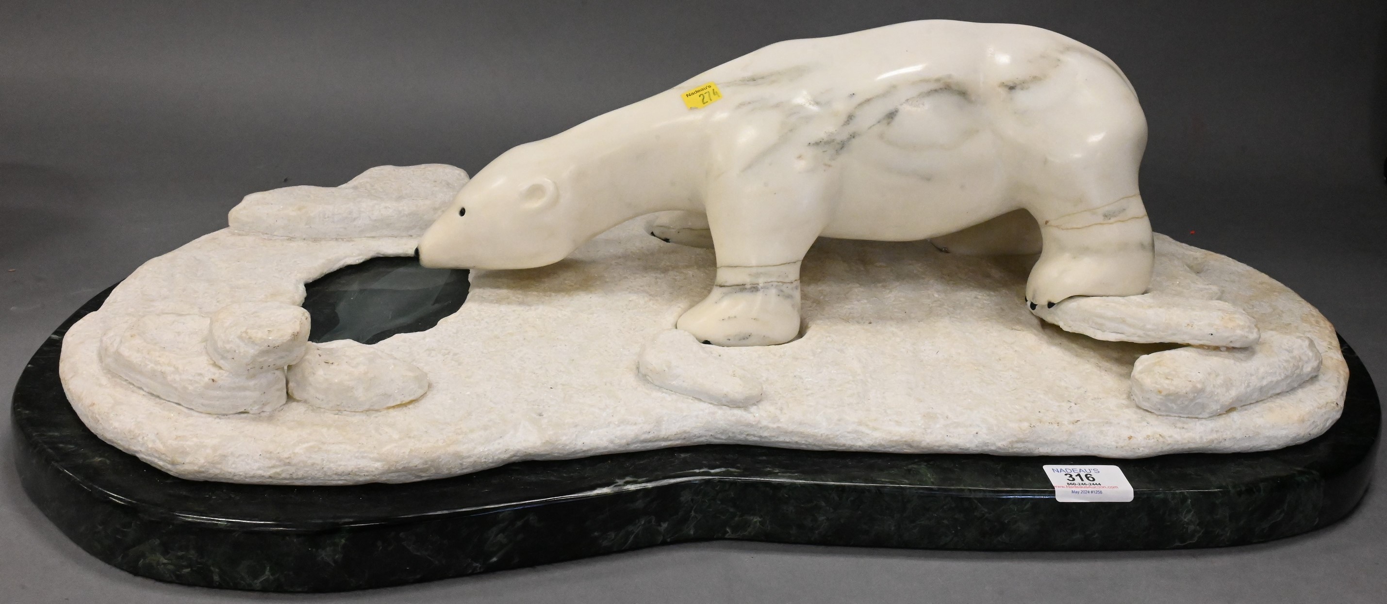 polar bear is looking through the ice at a seal, on granite base, unsigned