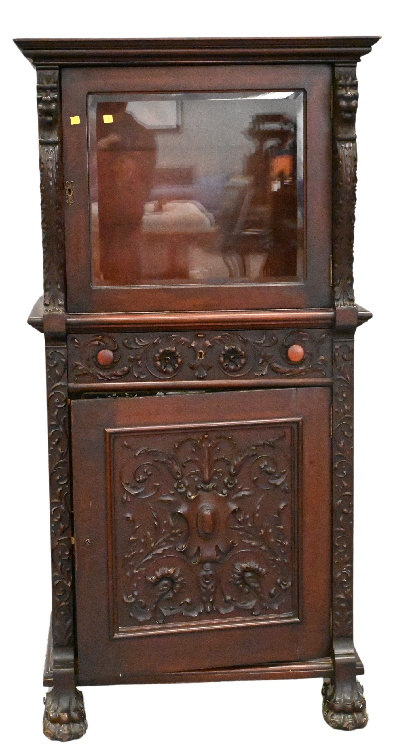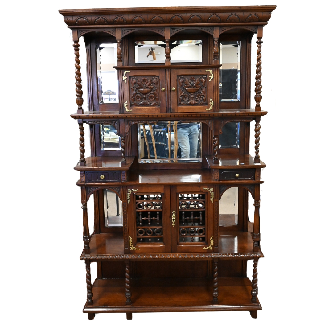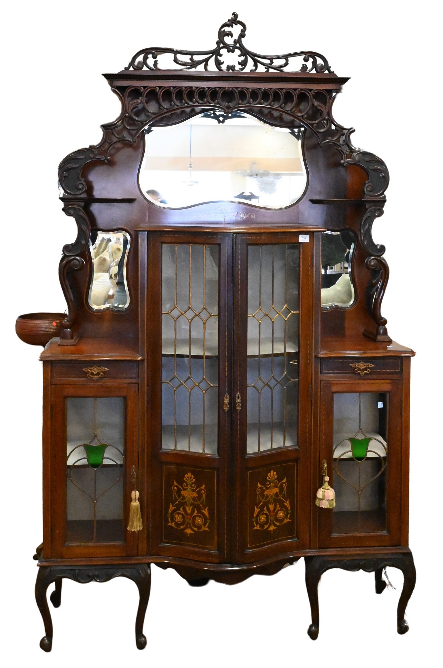having pierced and mirrored top set on base having slag glass doors flanked by two doors set on cabriole legs