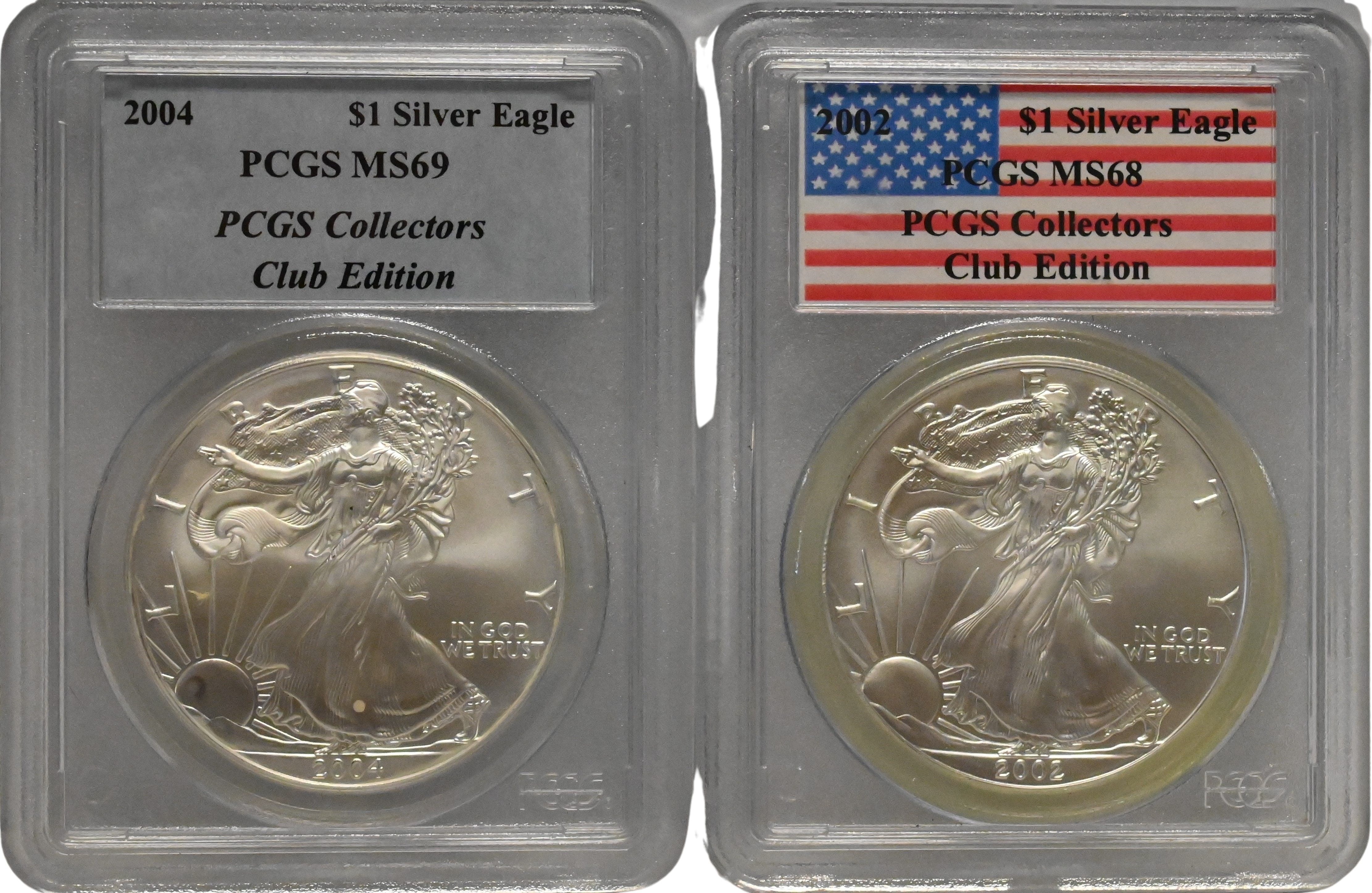 to include one 2004 $1 Silver Eagle PCGS MS69, and one 2002 $1 Silver Eagle PCGS MS68