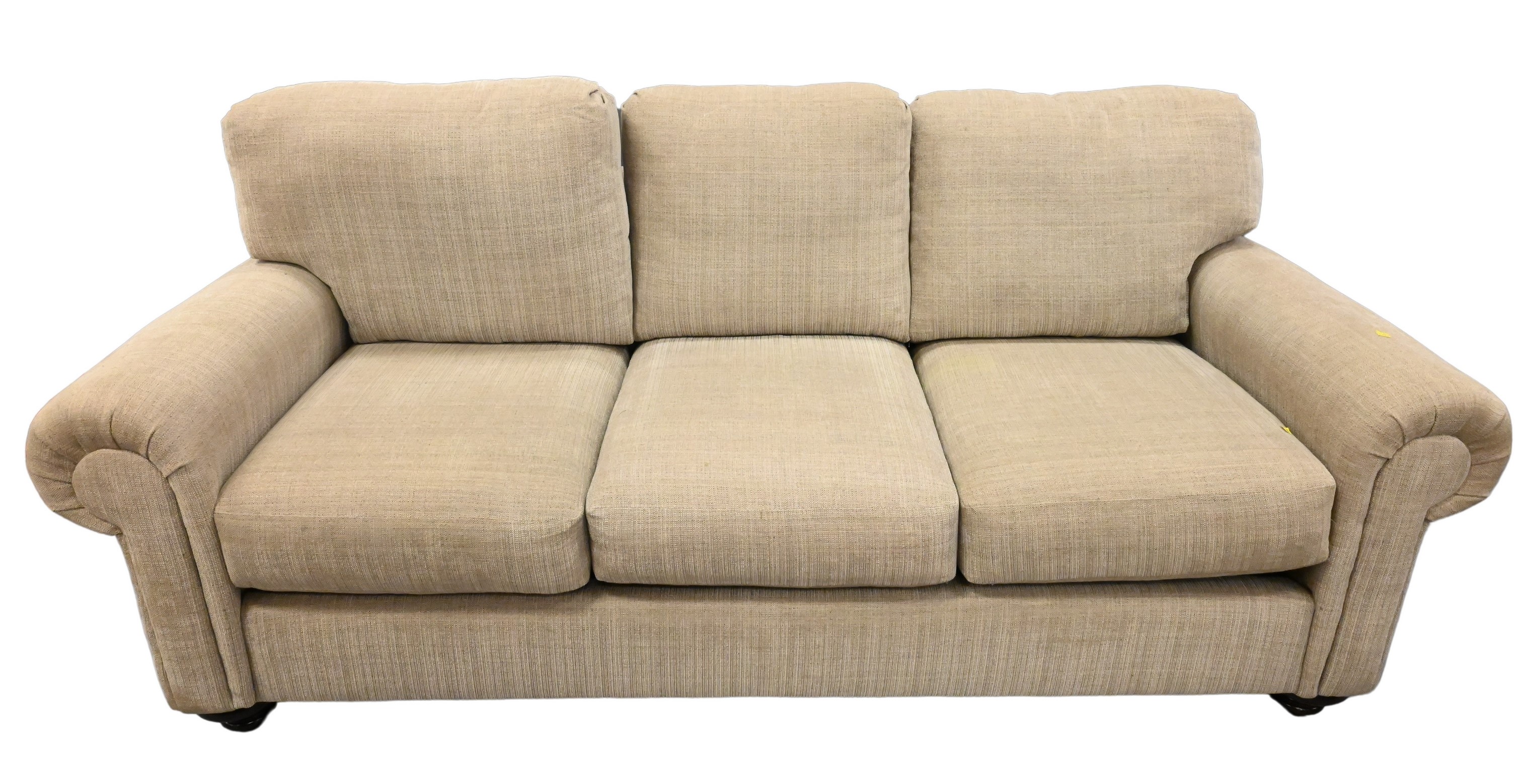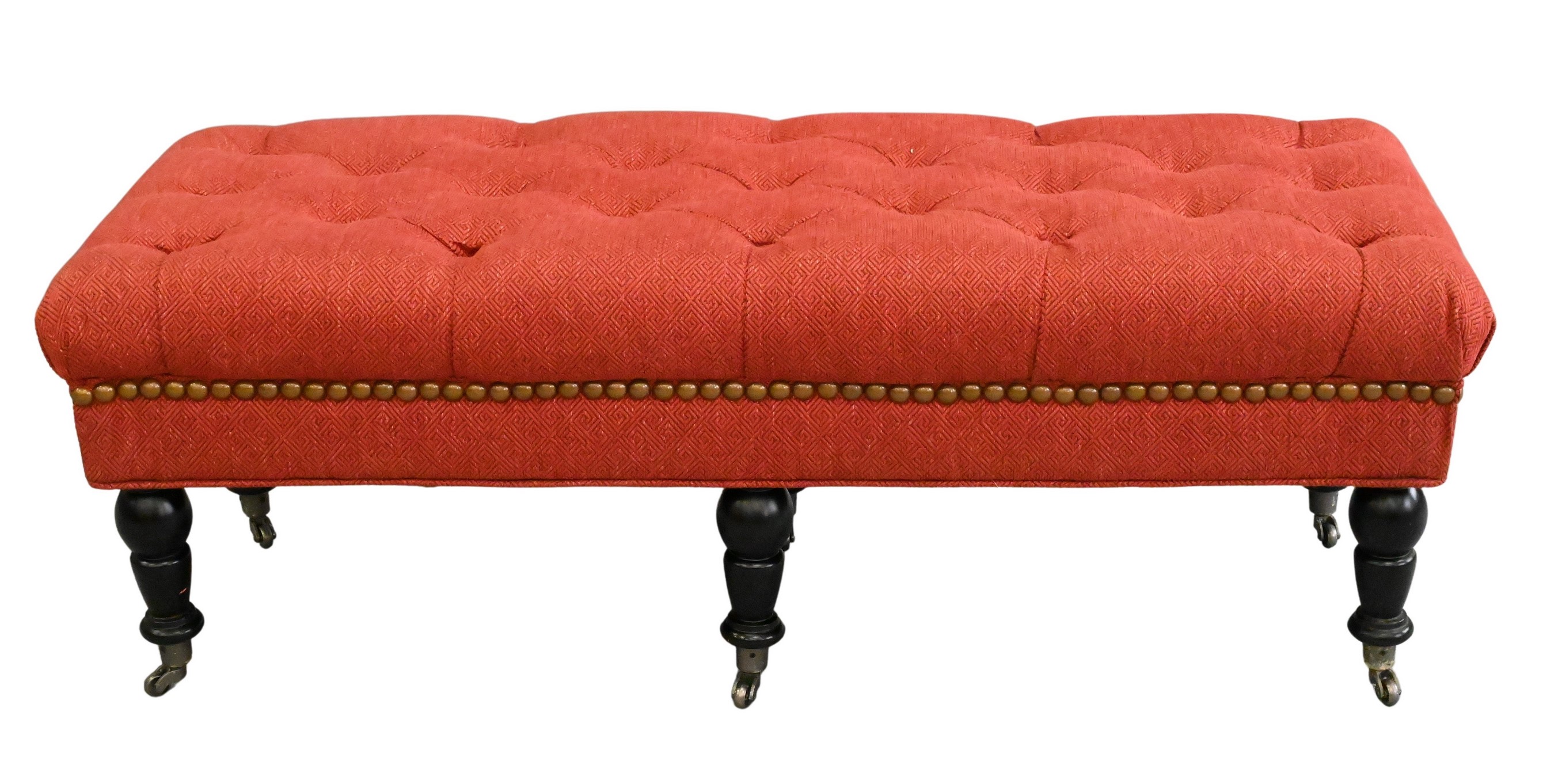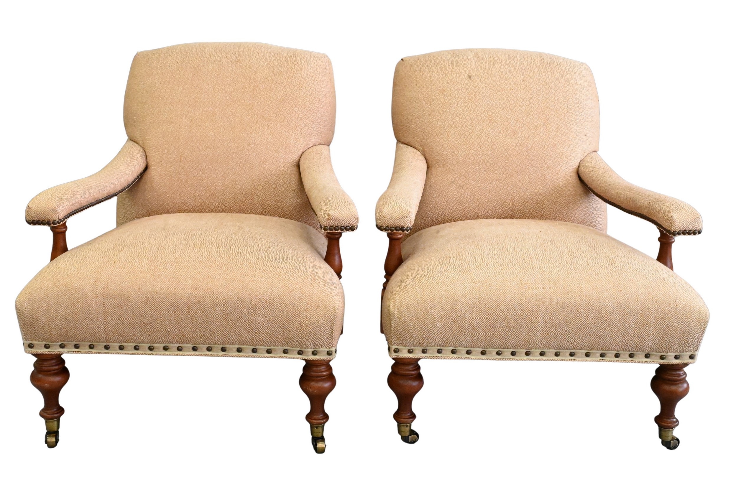 having wool type upholstery and brass tacks set on turned legs with brass caps and wheels