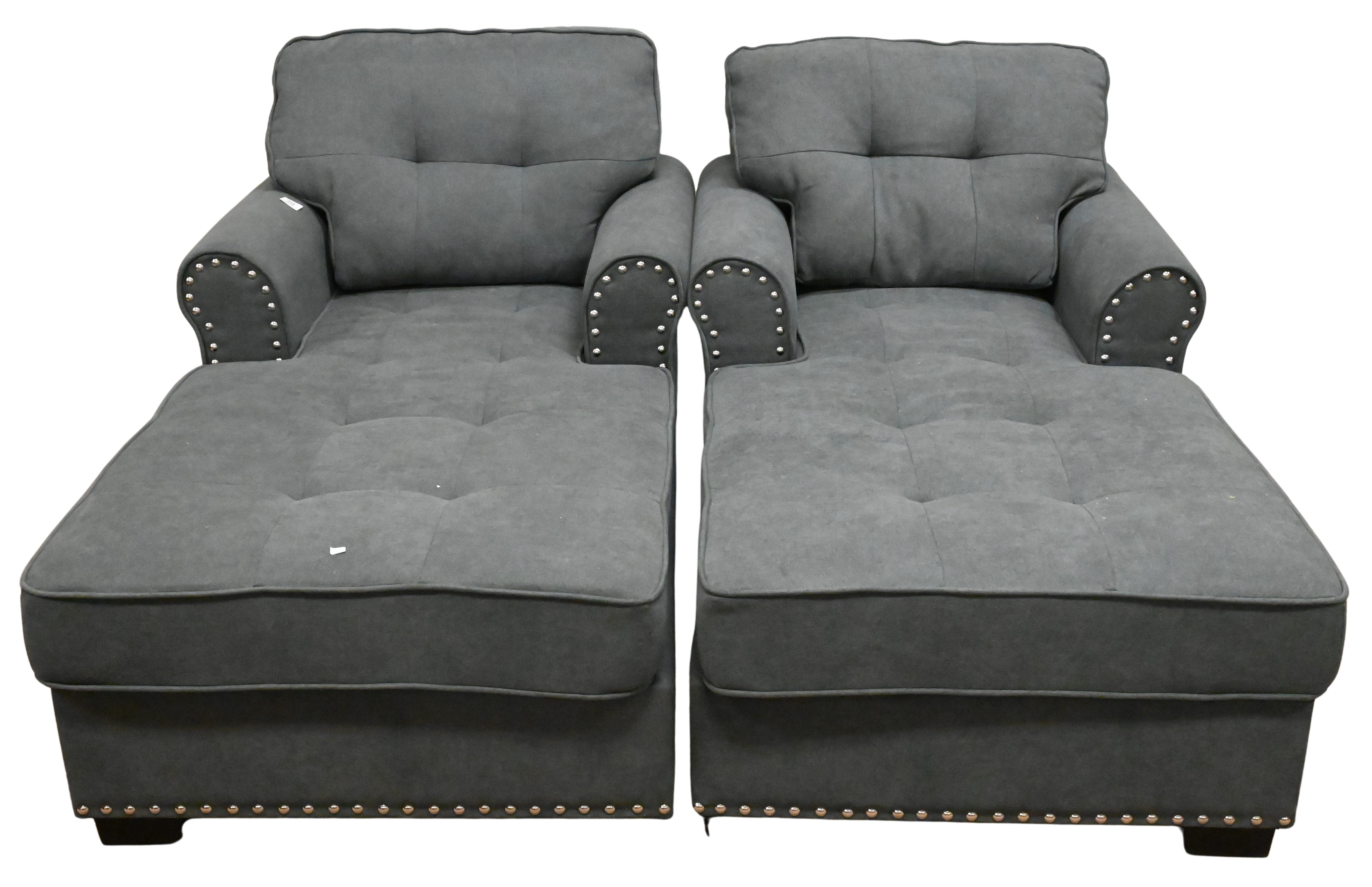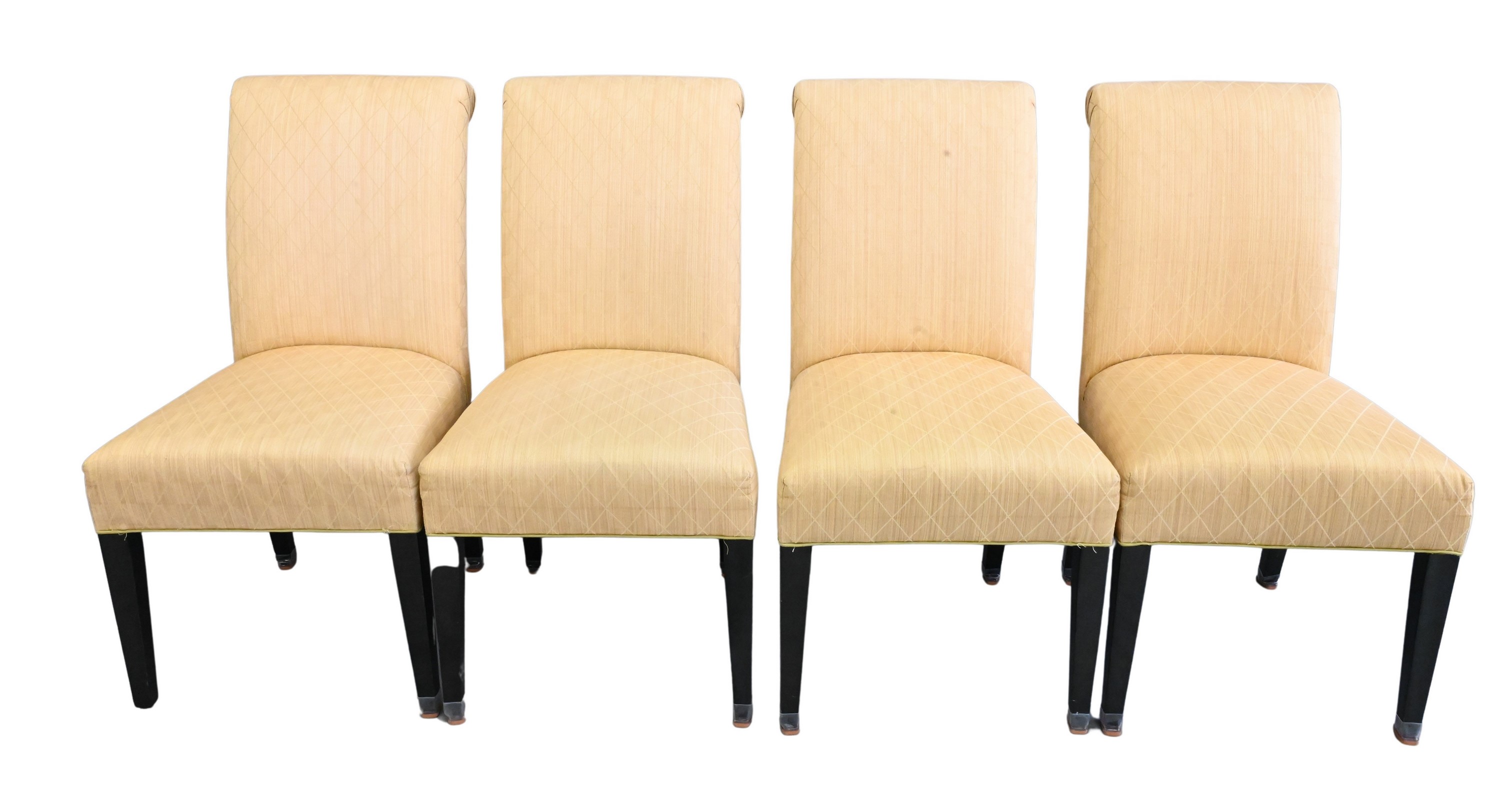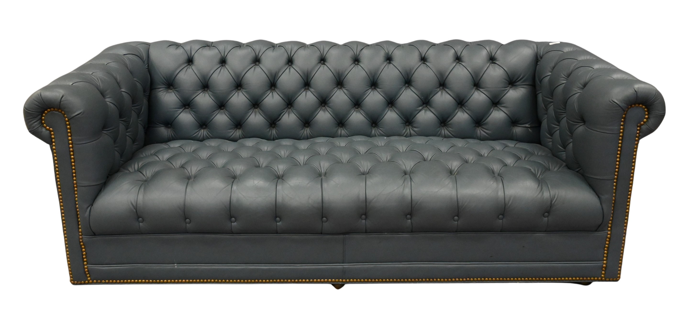 having wool type upholstery and brass tacks set on turned legs with brass caps and wheels