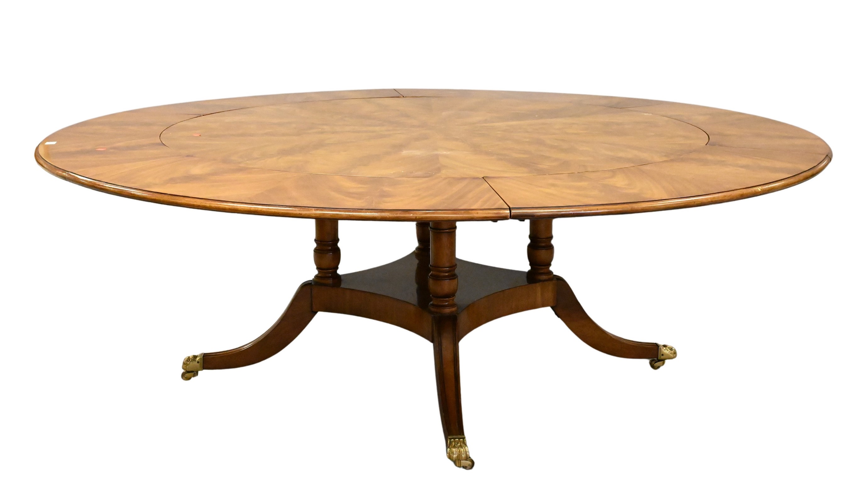 having crutch mahogany top on pedestal feet ending in brass paw feet without attaching extended leaves