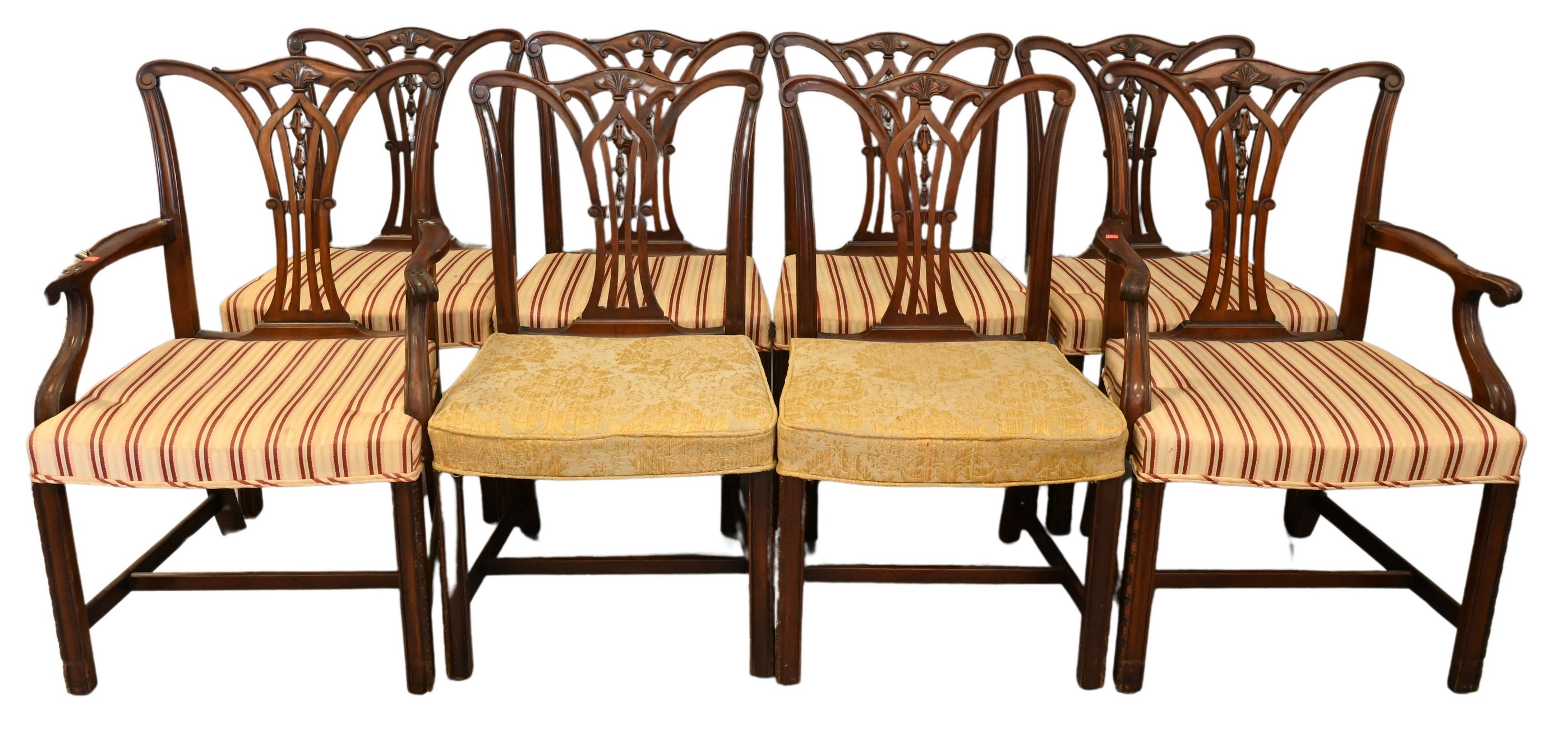 having oak leaf and acorn carved back, fully upholstered seat, set on molded legs