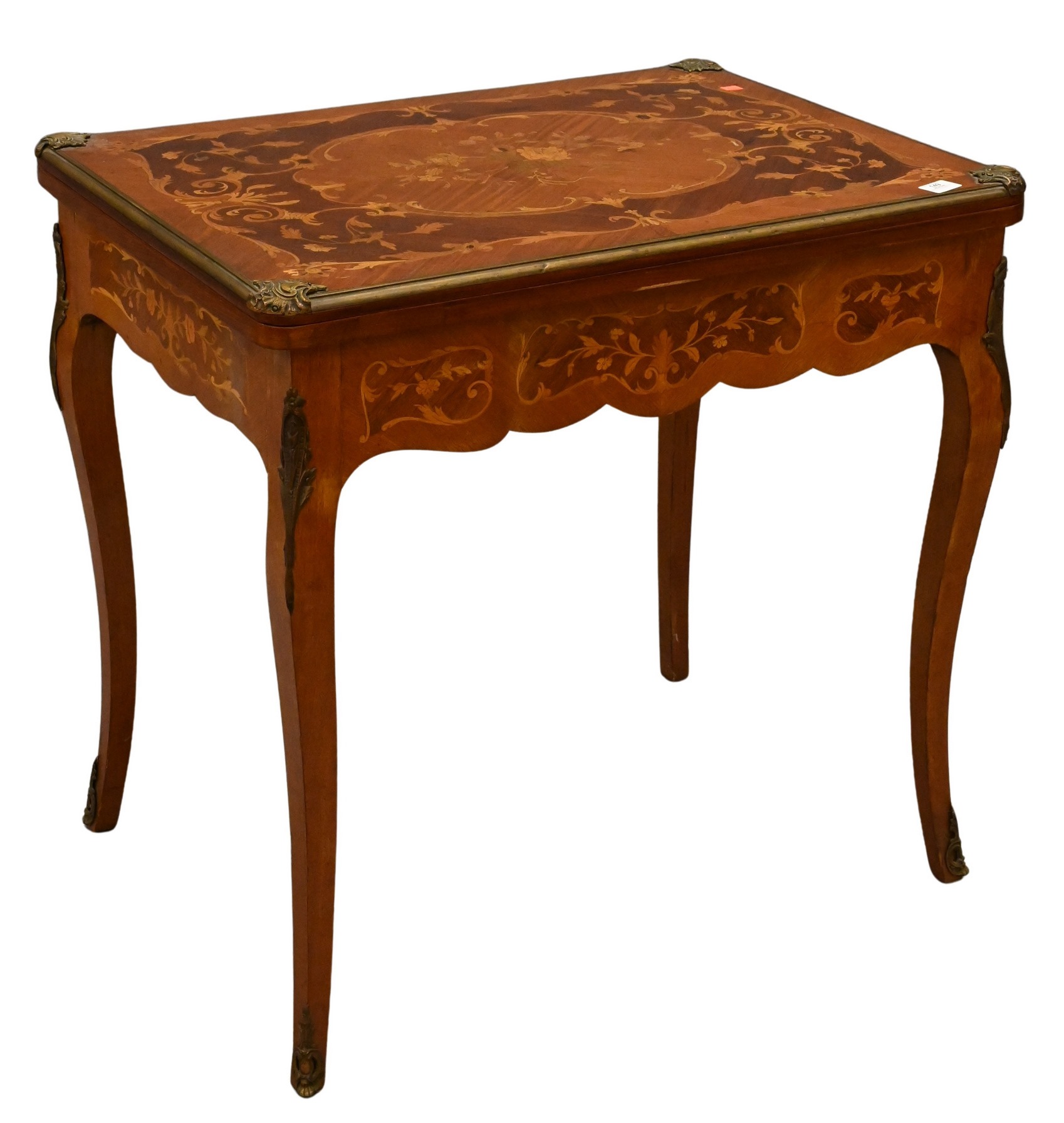 opening to felt playing surface along with chess/checkerboard and backgammon within, all having marquetry inlay, early 20th century