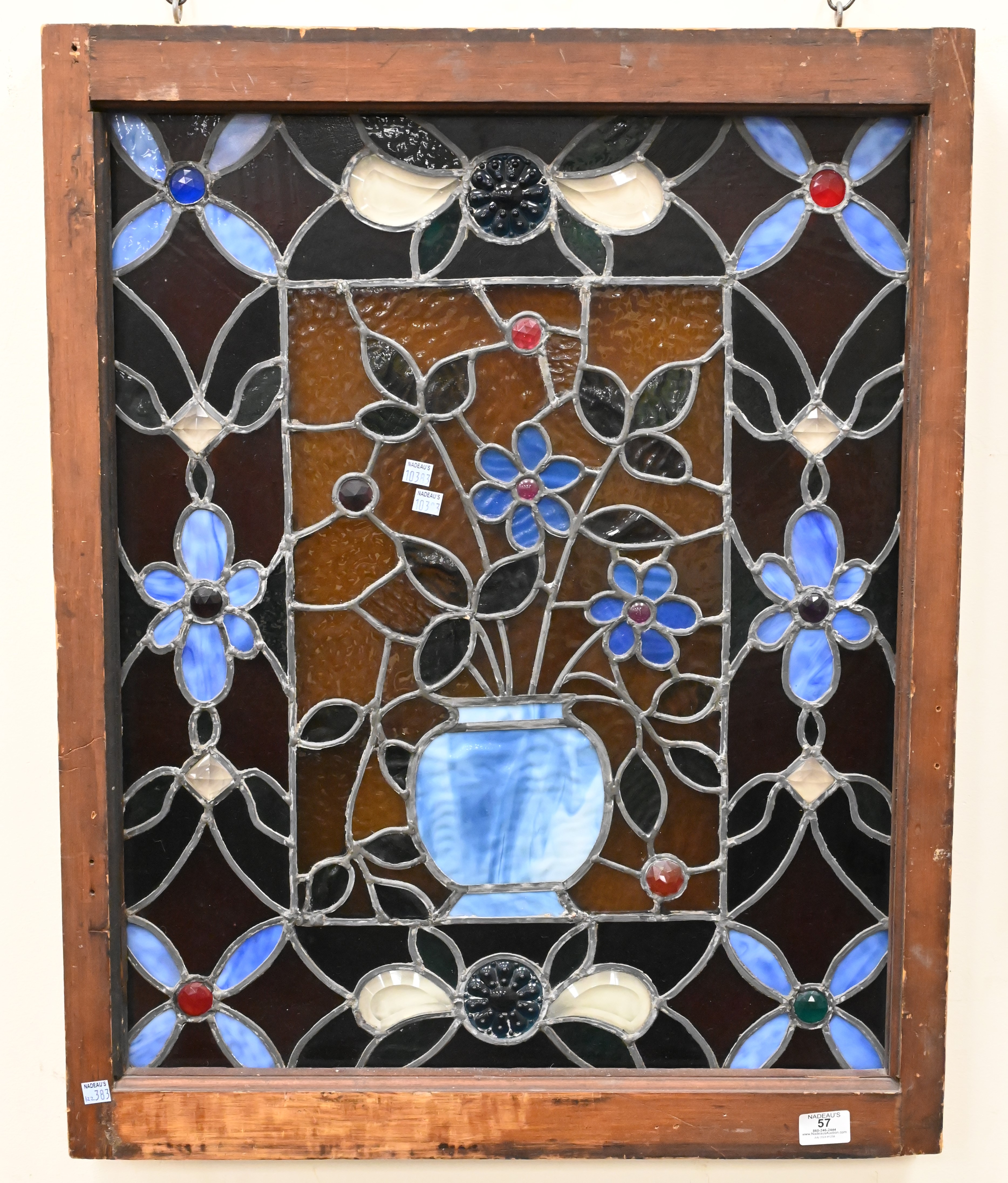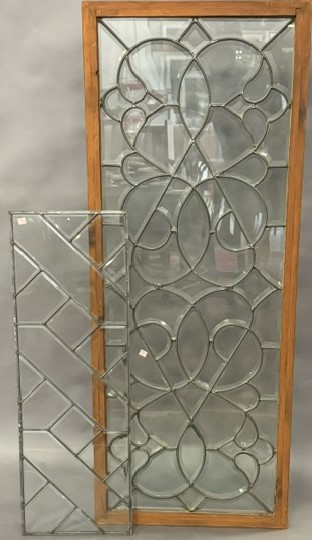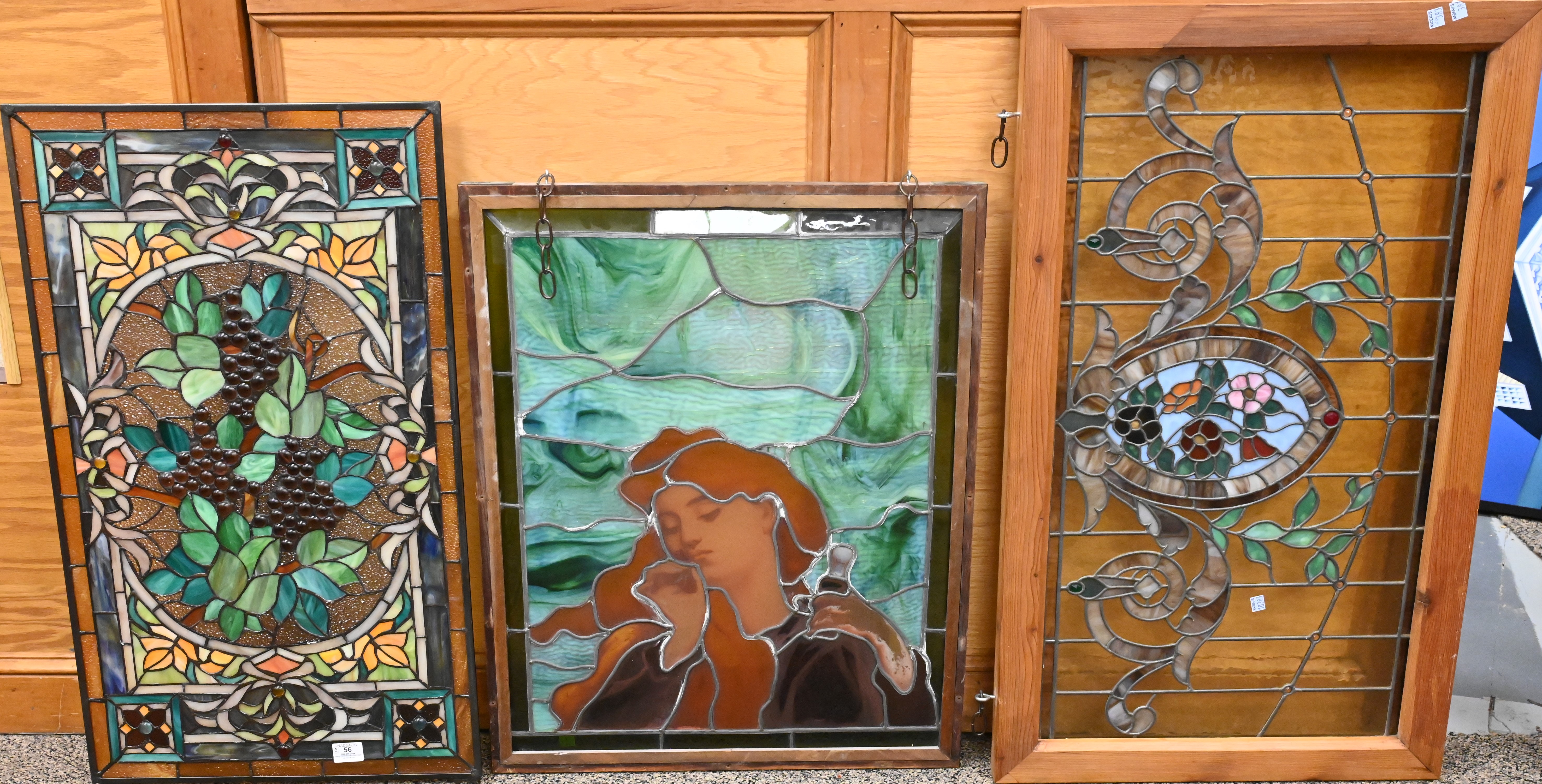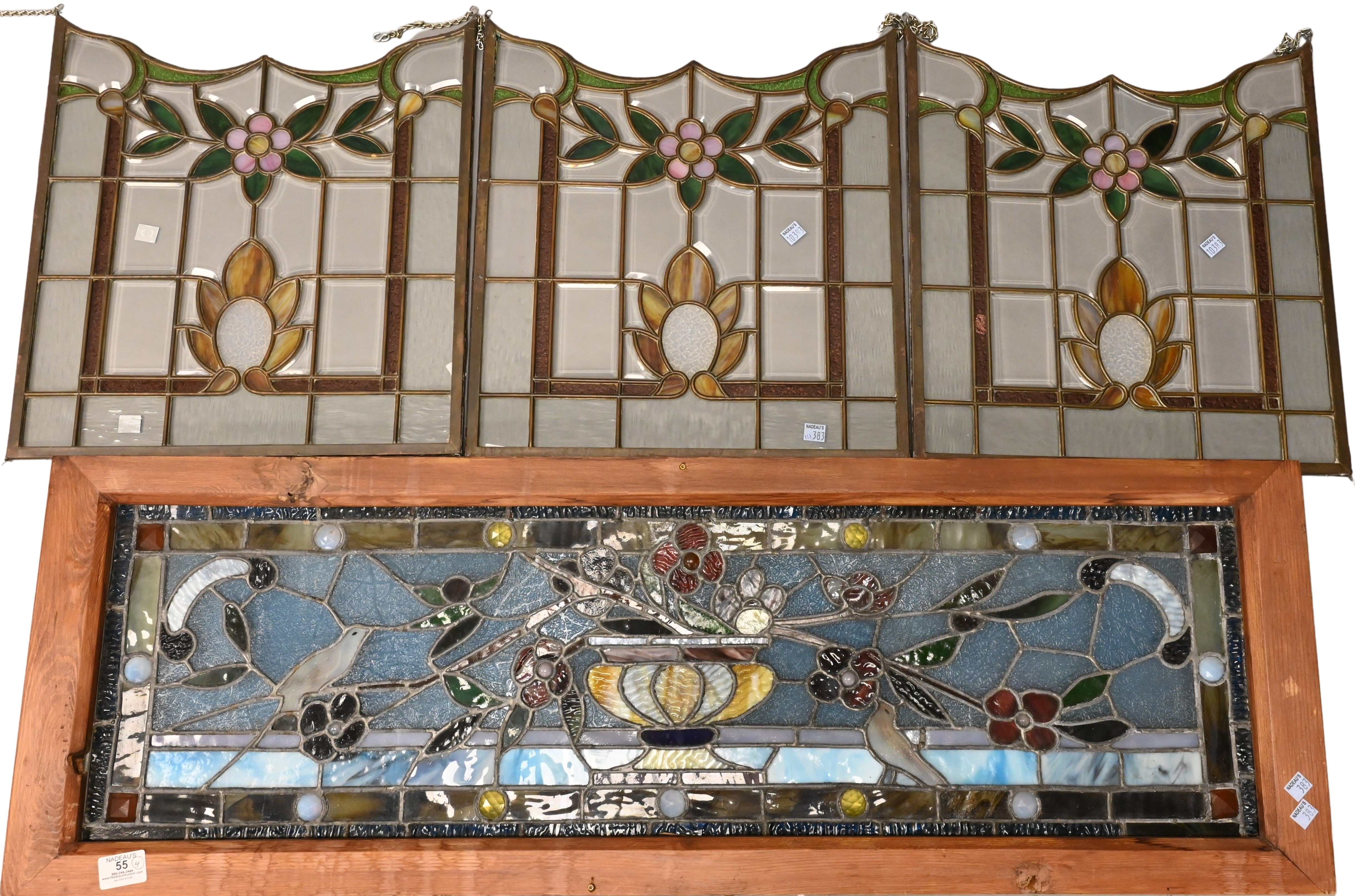 transom stained and leaded glass window with birds and vase of flowers, along with three shaped leaded and stained glass panels having hanging hooks and brass trim